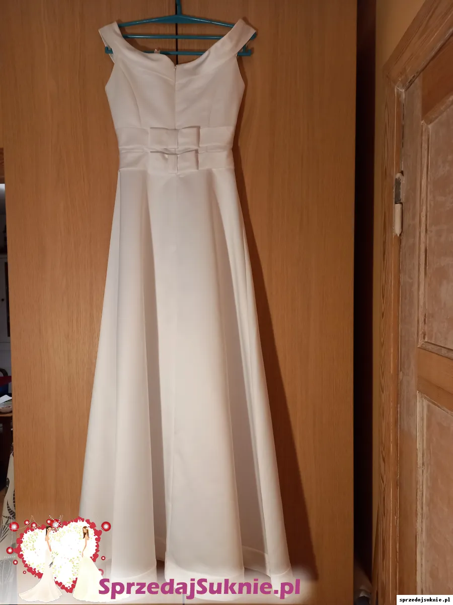 Dekolt w łódkę, na plecach 2 kokardki, długość do ziemi, z halką, na kole (pięknie się układa).