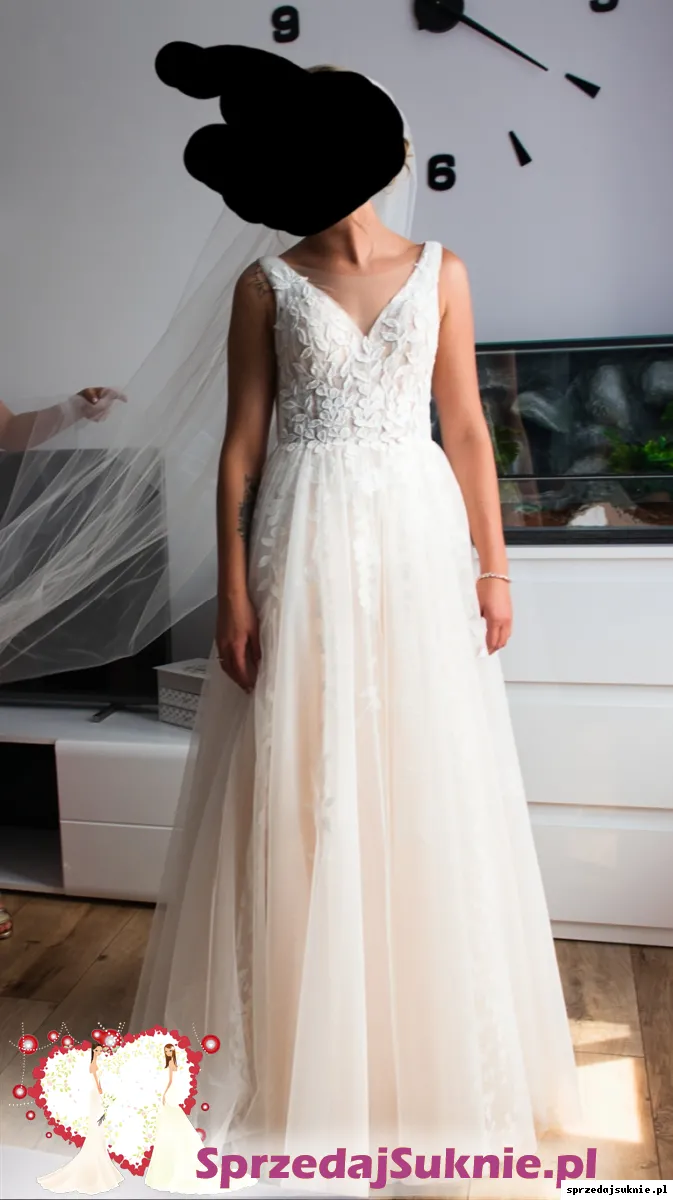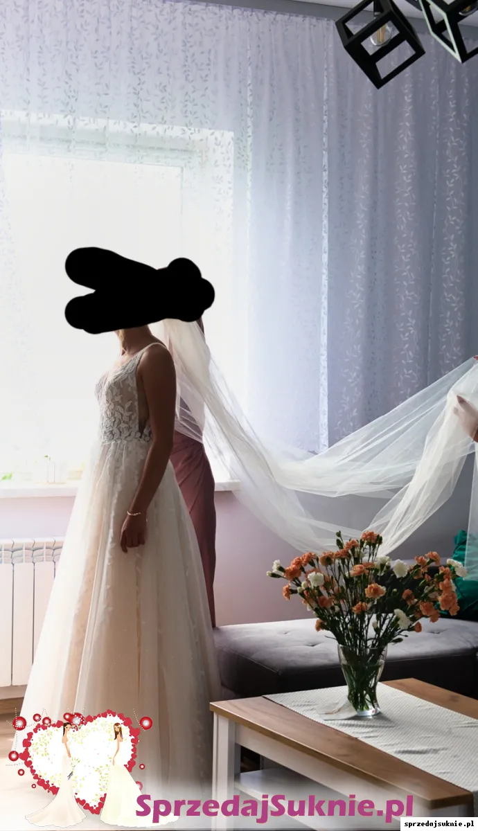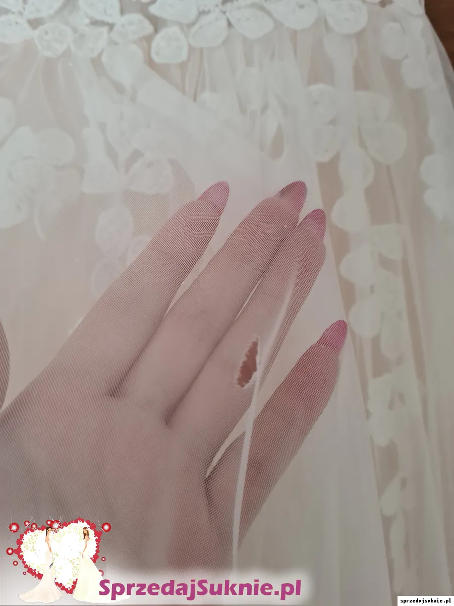 Na sprzedaż posiadam suknię ślubną szyta na miarę w salonie ślubnym. Suknia szyta na rozmiar 34, wymiar w biuście 84cm, talia 64cm, na wzrost 160cm + 9cm obcas. Suknia posiada wszyta warstwę z brokatem, która dodaje niesamowitego efektu. Założona była jeden raz na ślub. W pierwszej warstwie niewielka dziurka od zahaczenia bransoletka, jednak jest ona zupełnie niewidoczna. Po wcześniejszym uzgodnieniu jestem w stanie oddac ją do naprawy. W gratisie dorzucam klasyczny długi welon widoczny na zdjeciach. Po ślubie została oddana do czyszczenia, cały czas przechowywana w pokrowcu.