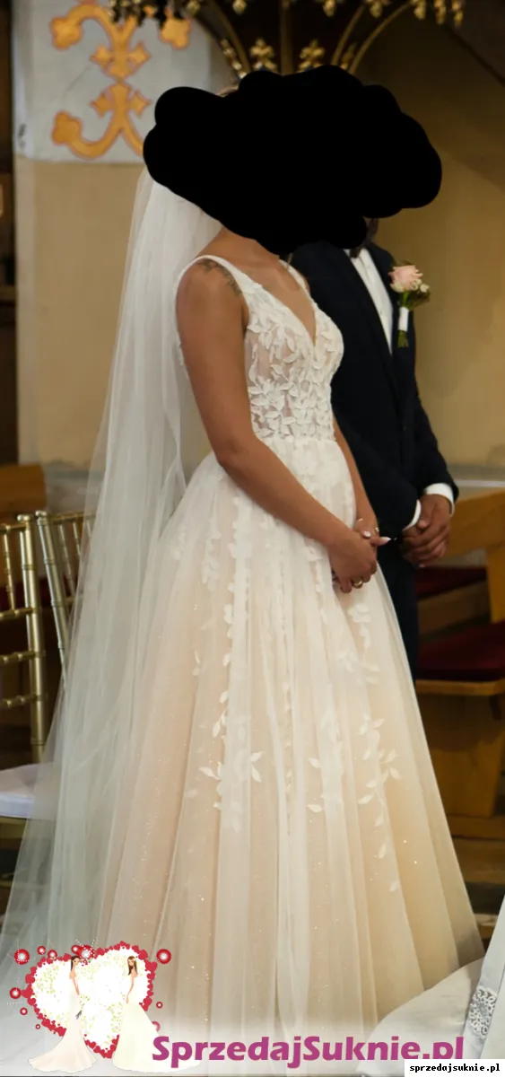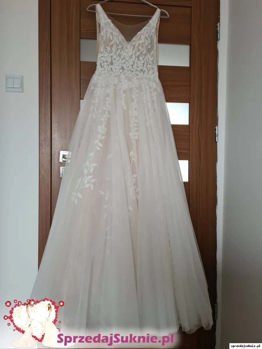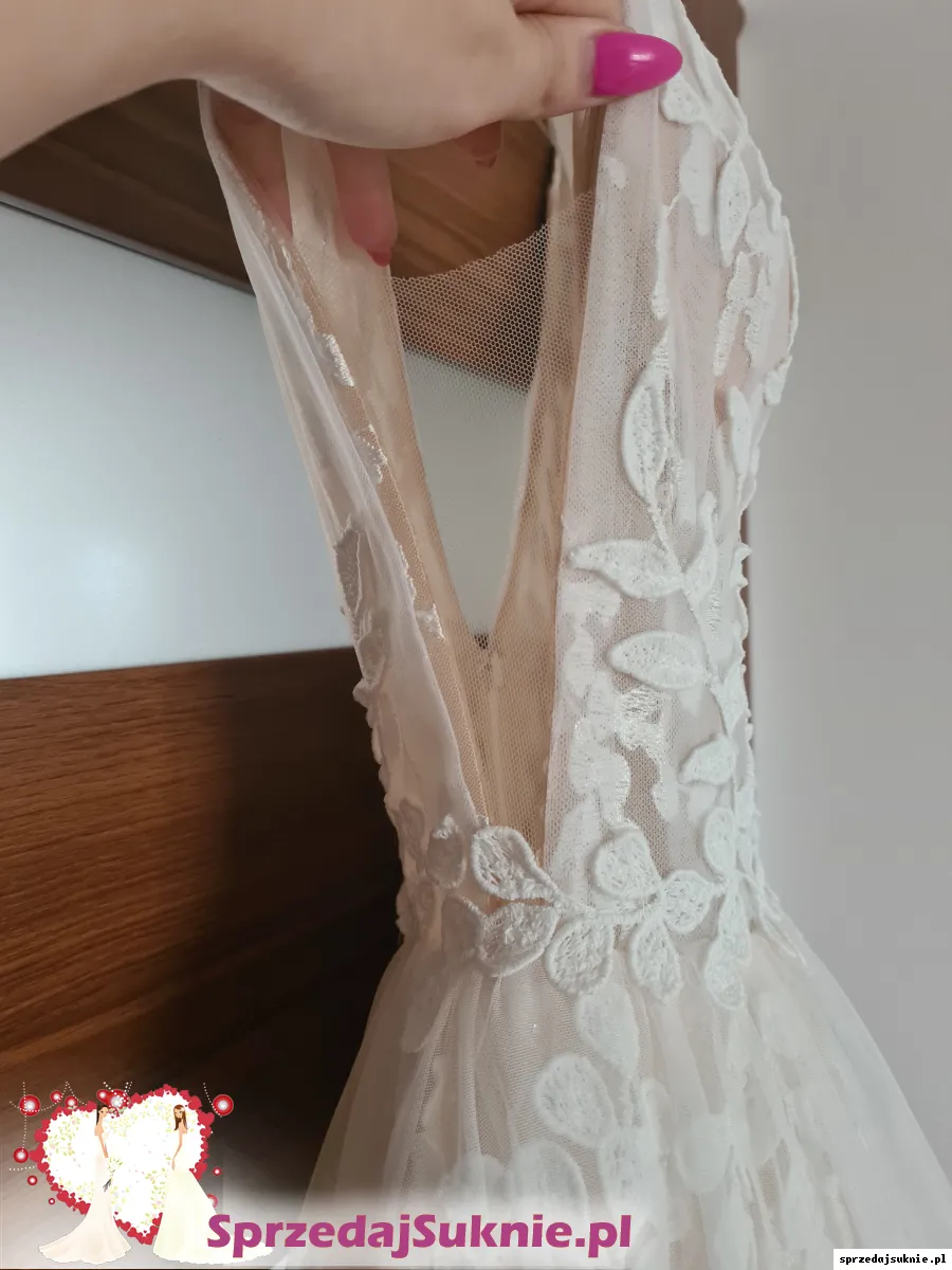 Brzoskwiniowa suknia ślubna z listkami