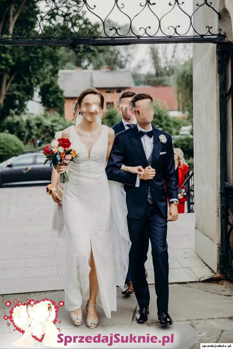 Dopasowana koronkowa prosta suknia ślubna z rozcięciem / rybka + welony