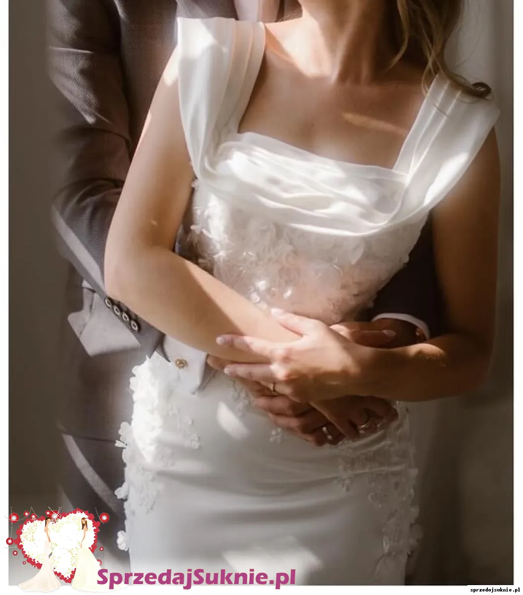 Sprzedam przepiękną suknię ślubną w kolorze śmietankowej bieli, wykonaną z wysokiej jakości materiałów na indywidualne zamówienie w DIANA Atelier. Suknia ma delikatnie dopasowany gorset z dekoltem w stylu karo, który pięknie podkreśla ramiona i obojczyki, nadając całości subtelnego, kobiecego uroku. Dół sukni jest lekko rozkloszowany, co sprawia, że kreacja wygląda niezwykle zwiewnie i lekko.