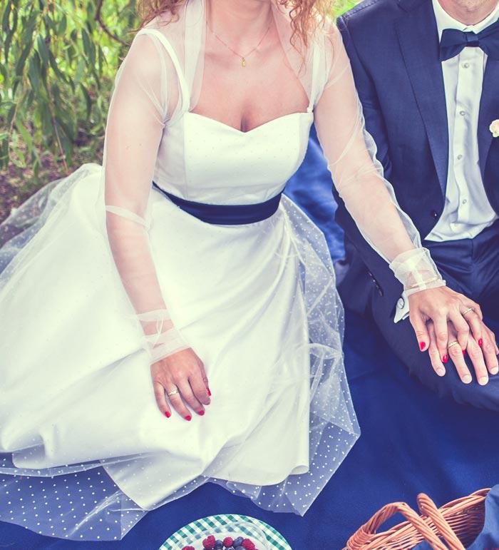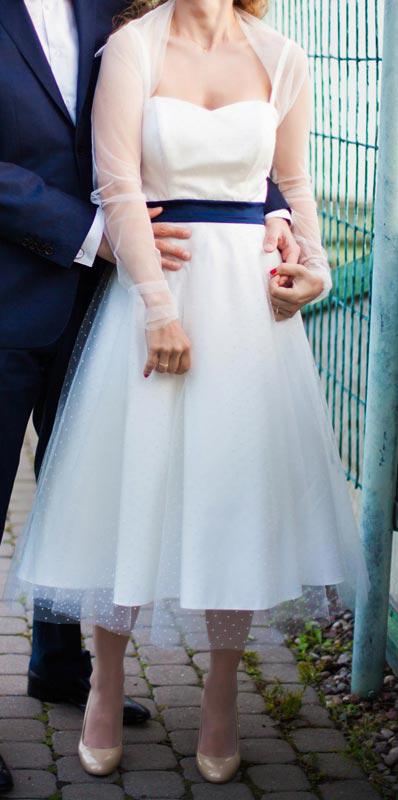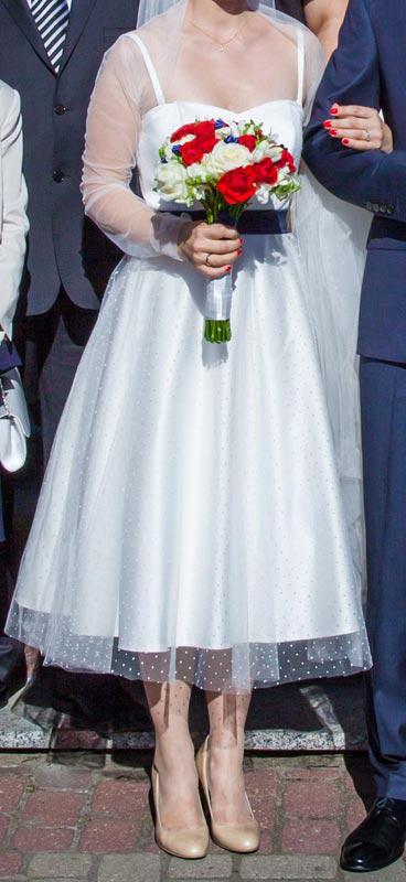 - tkanina: satyna ślubna (niegniotąca i niezbyt mocno błyszcząca) pokryta tiulem w delikatne kropeczki