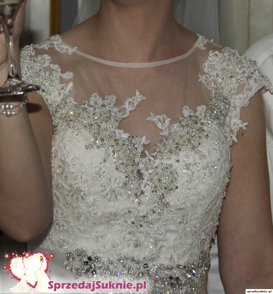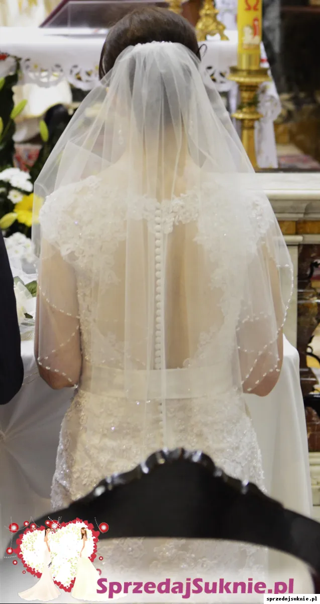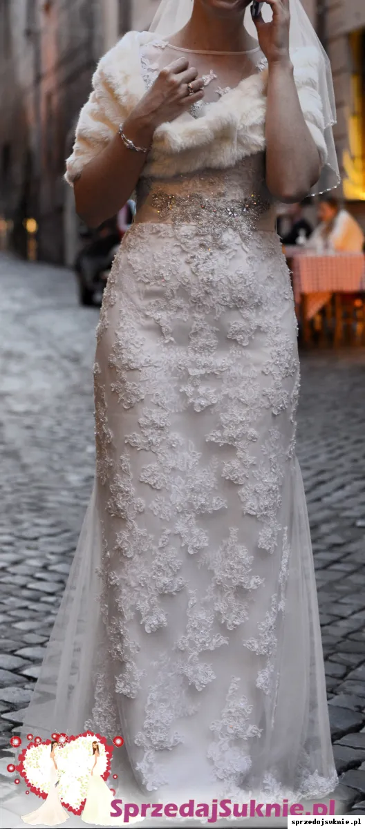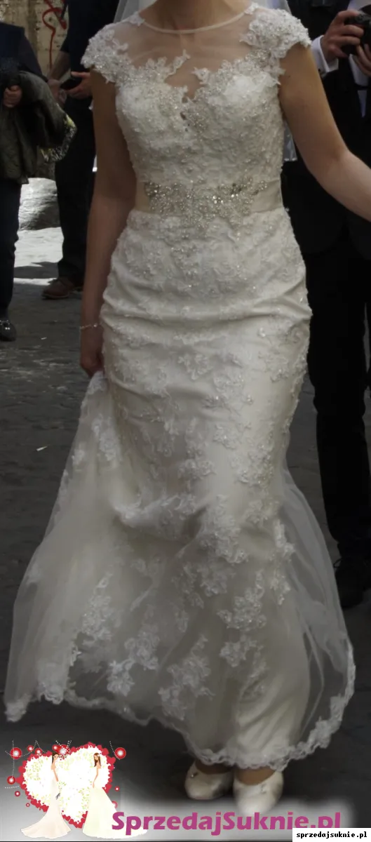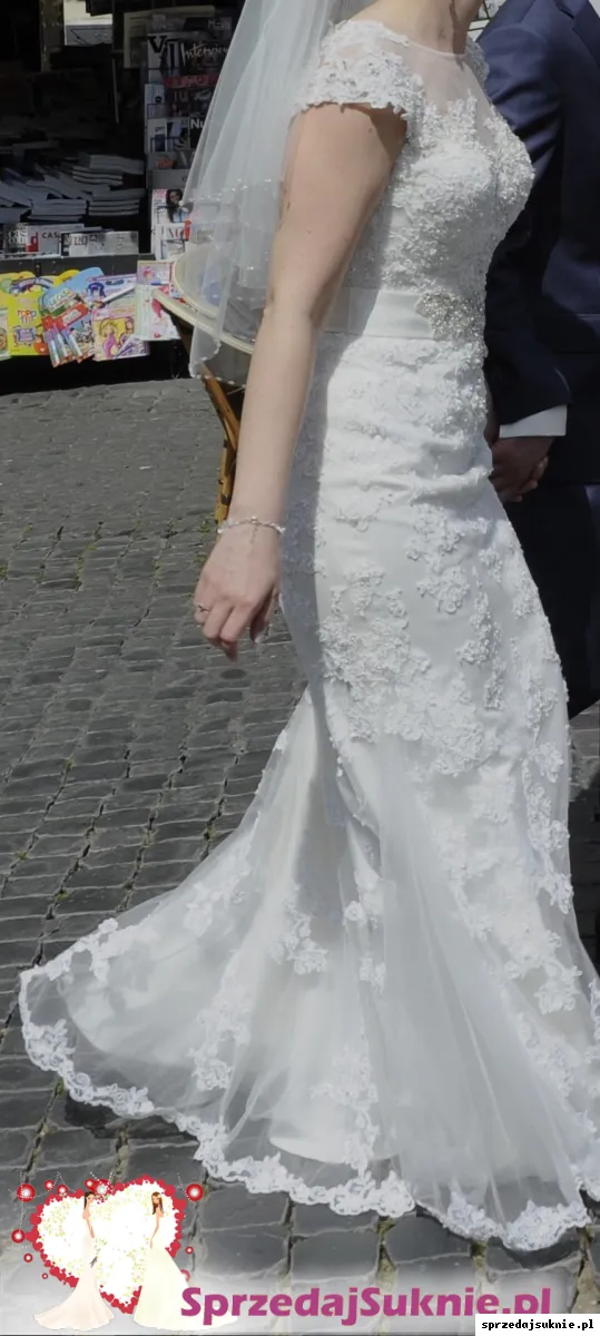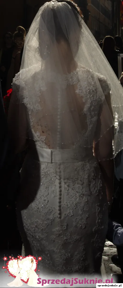 Przepiękna, ponadczasowa, z koronki, z niewielkim trenem. Użyta tylko przeze mnie i wyprana w bardzo profesjonalnej pralni. Stan super. Sprowadzona z Hiszpanii. Zakupiona pod koniec 2014 r.w bardzo eleganckim salonie Abiu, w Warszawie który już nie istnieje. Rozmiar M, można powiedzieć, że S/M.