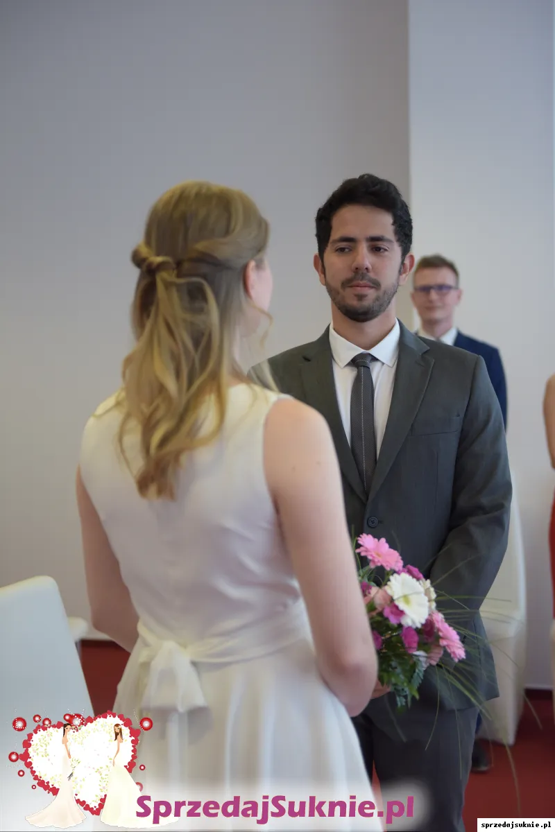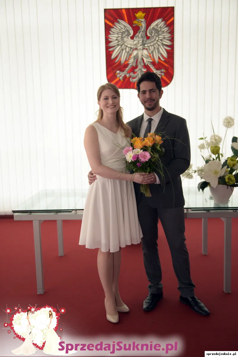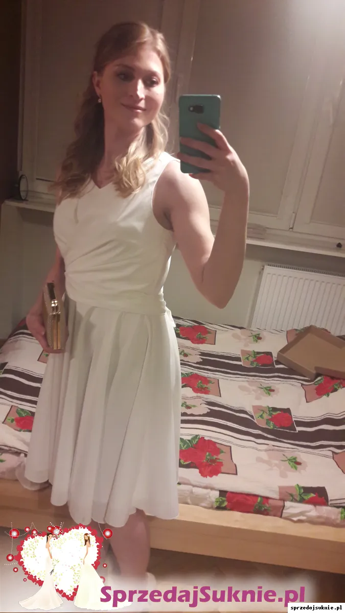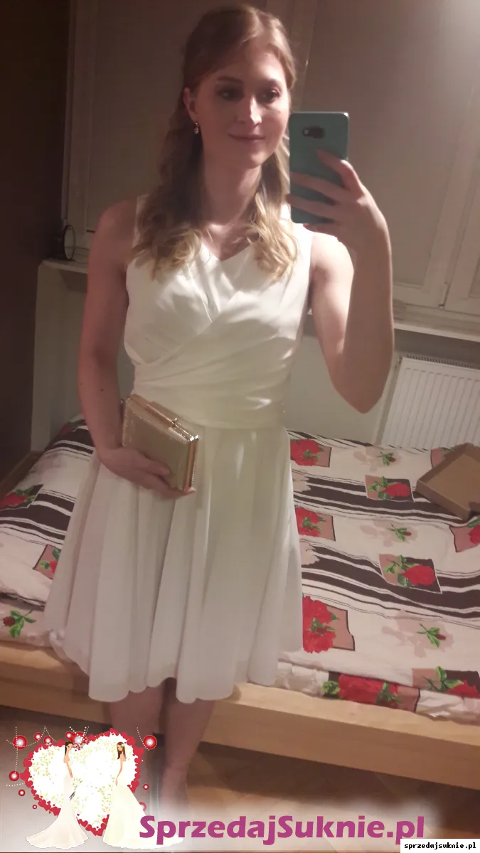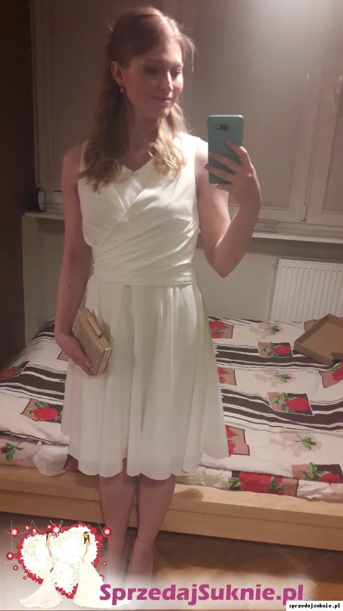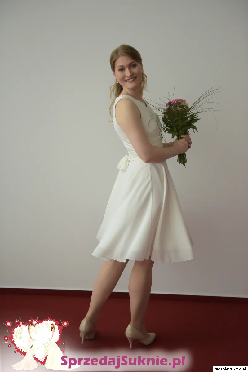 Krótka suknia ślubna do kolan kremowa wiązana z tyłu