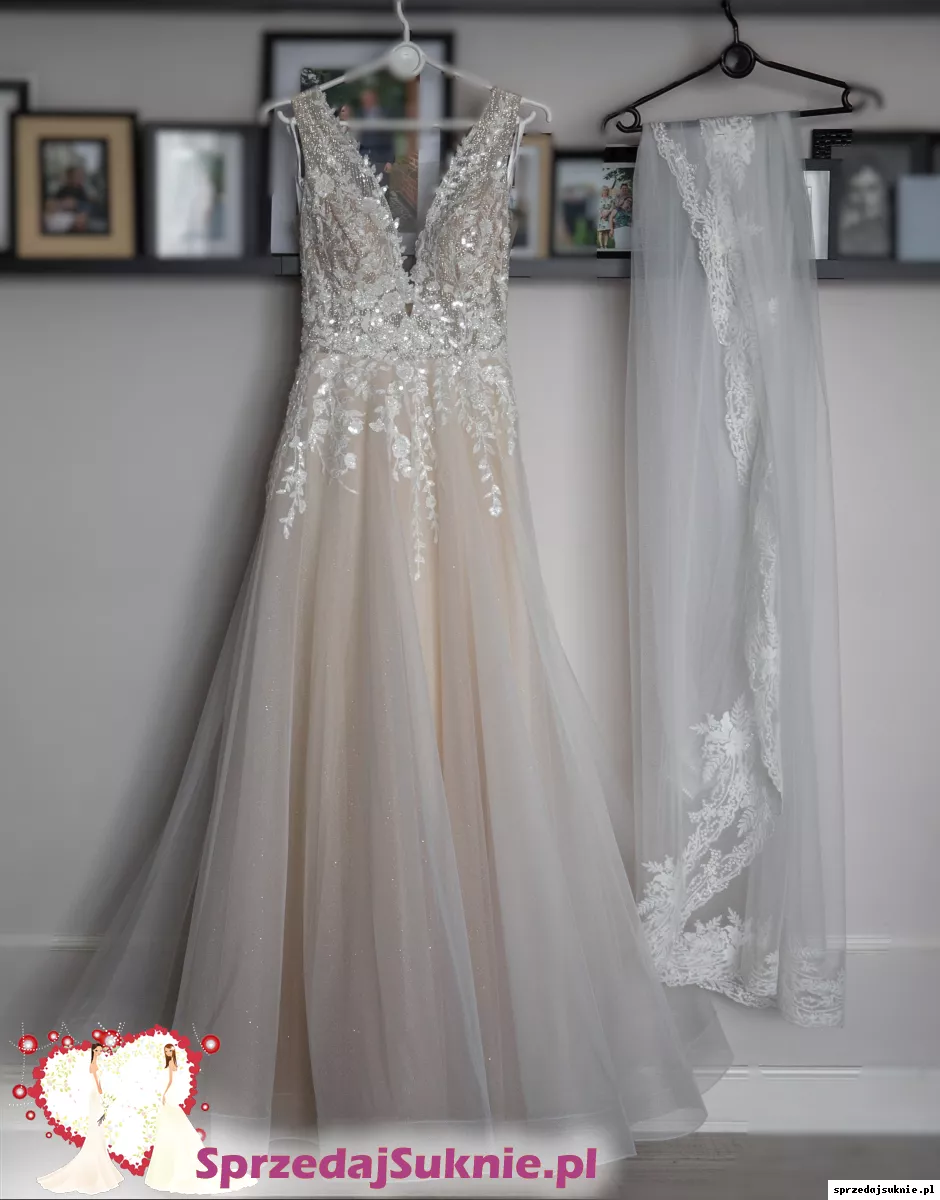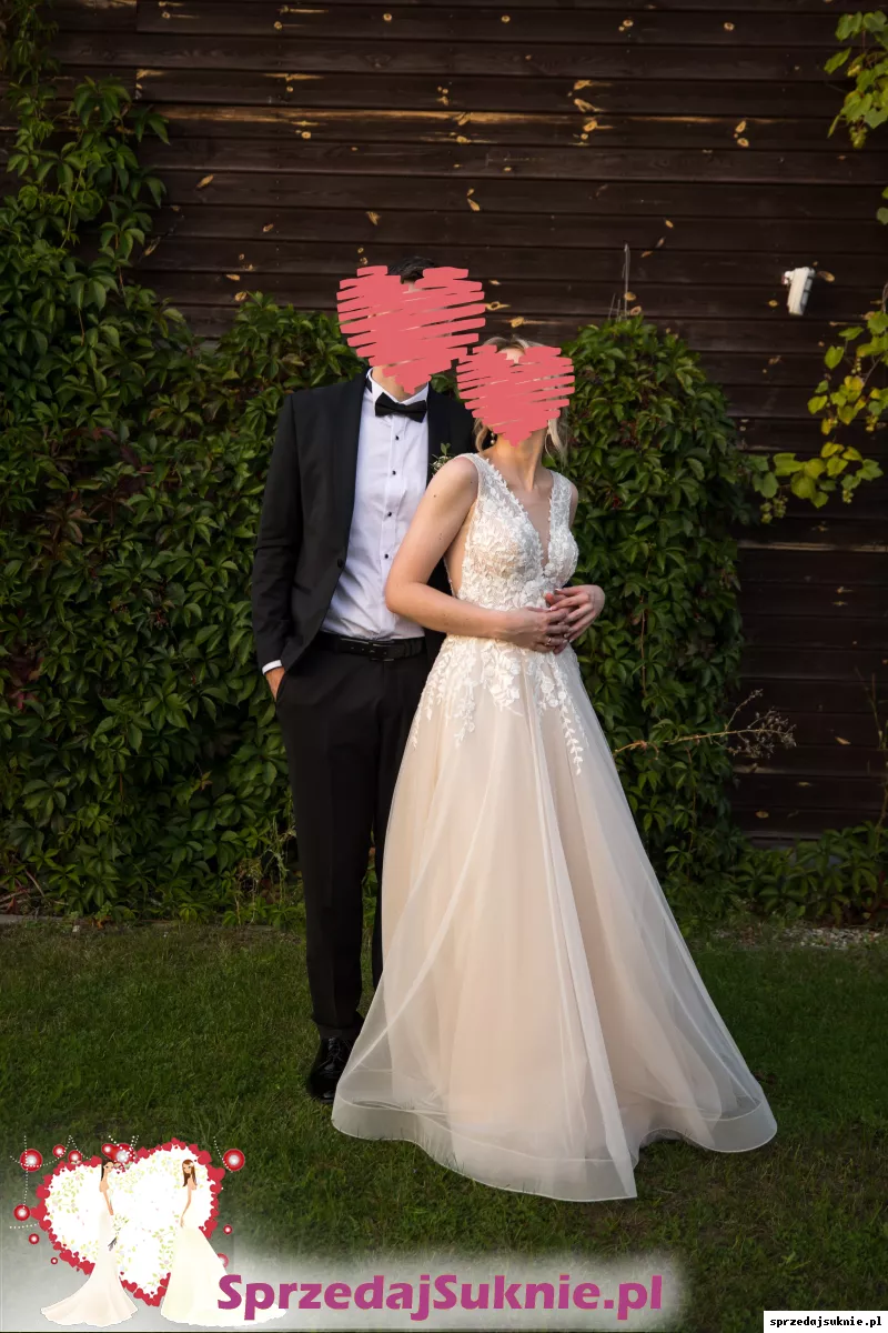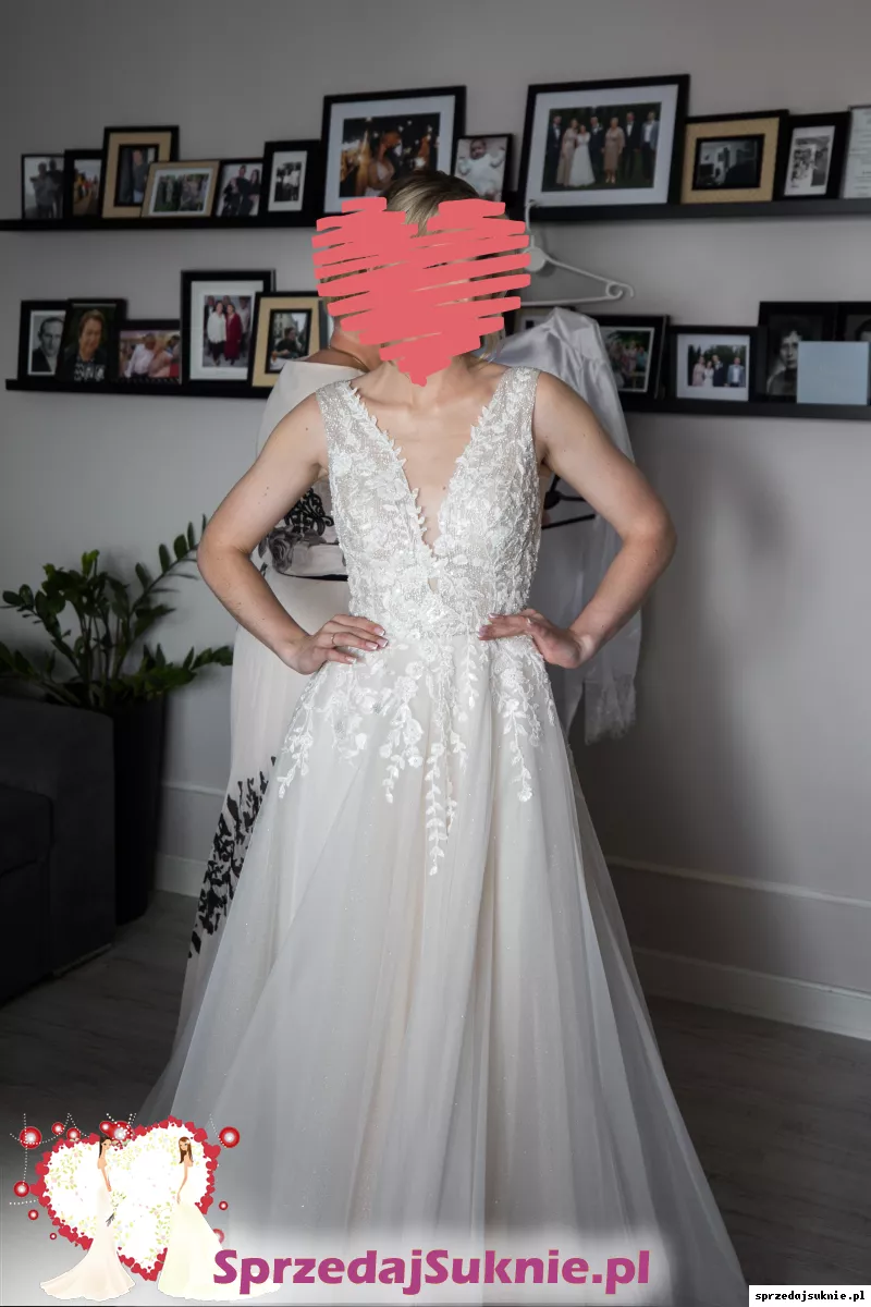 Stan: Suknia założona raz. Stan bardzo dobry, posiada delikatne ślady użytkowania – do odświeżenia/prania.
