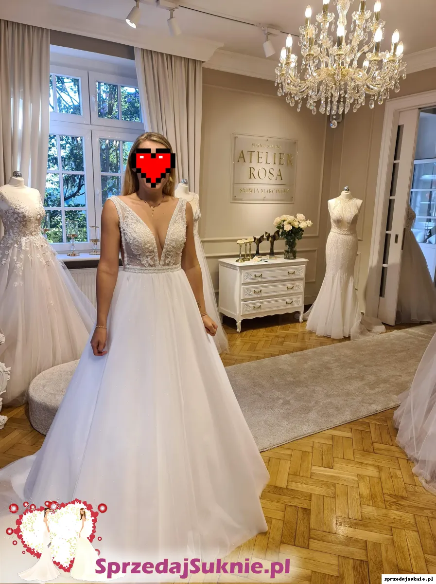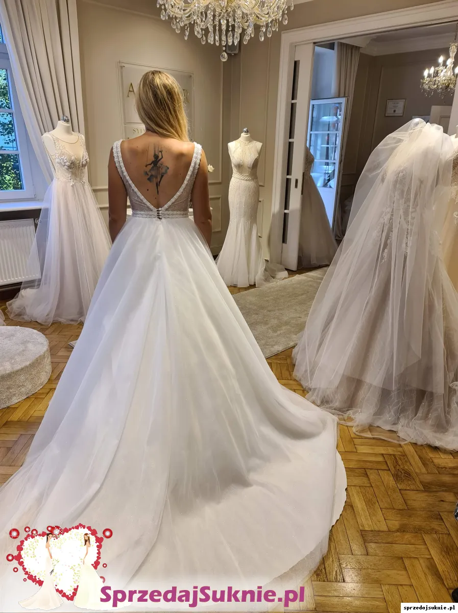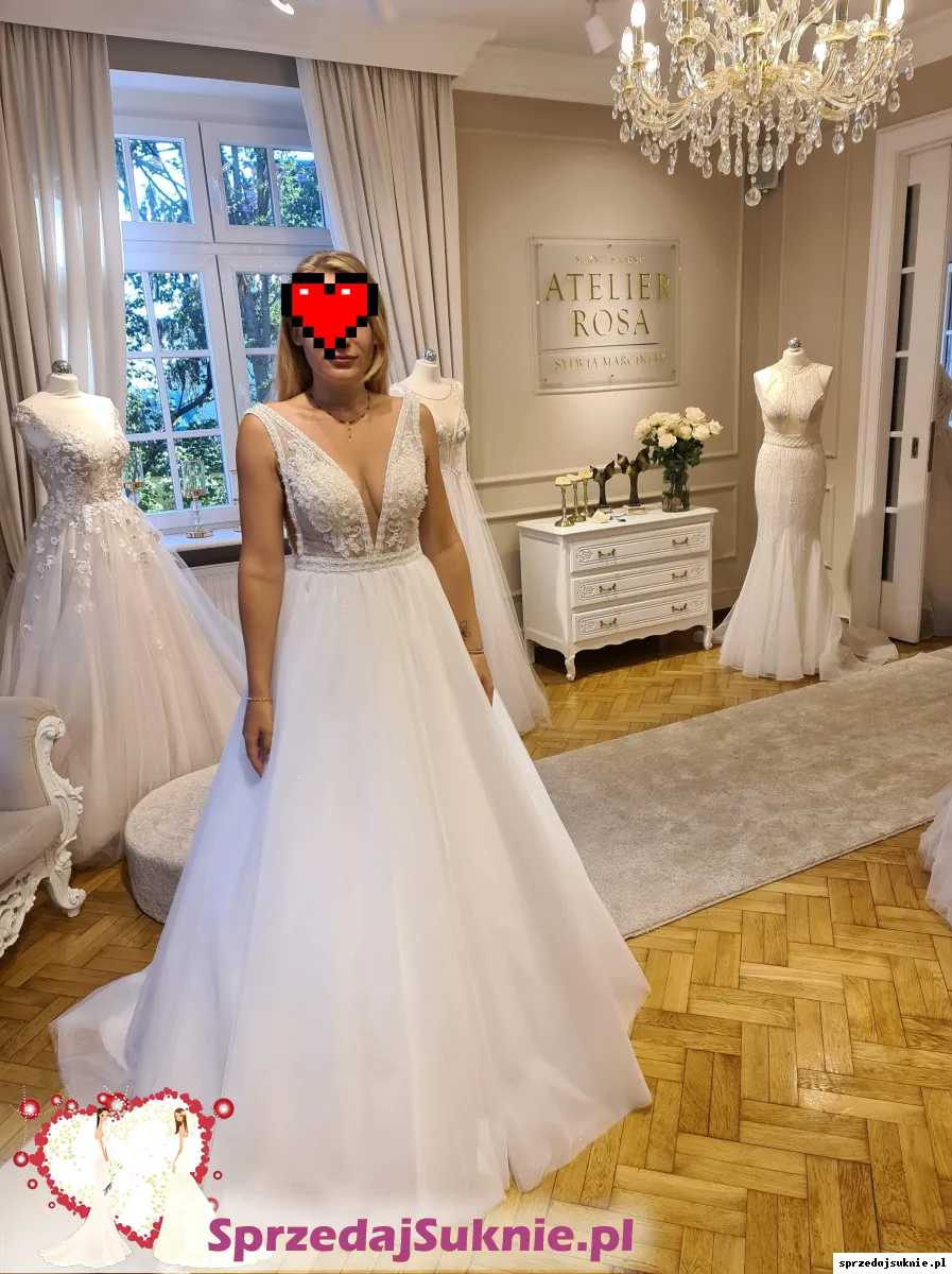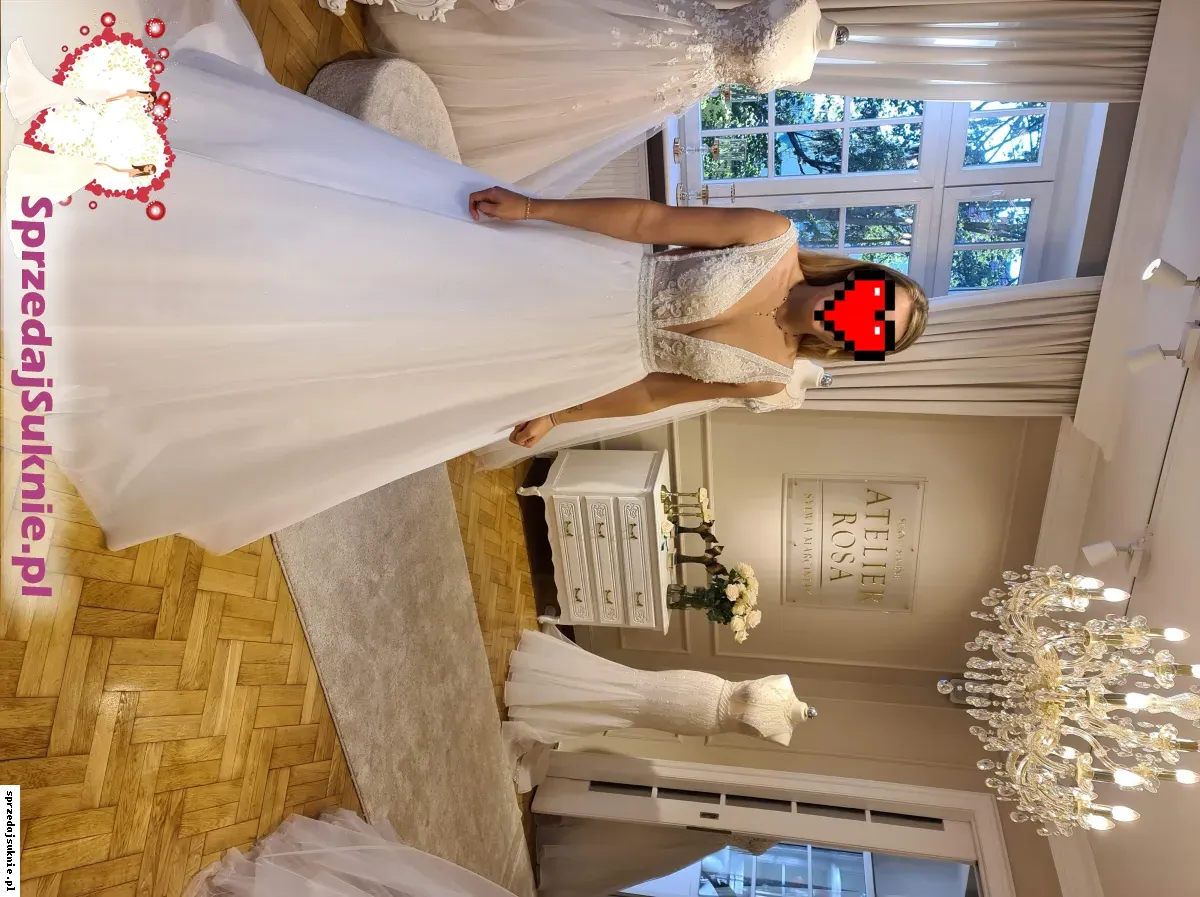 Suknia pochodzi z najnowszej kolekcji Pani Sylwi Marciniak , Atelier Rosa w Zielogorze Górze. Suknia jest nowa nigdy nie założona posiadam do niej koło oraz dwa rodzaje dopinanych rękawków jedne w ozdobnej formie koralików z piórami drugie jako nakrycie ramion w kościele mają formę zwiewnych woali. Dodam gratis welon 3 metrowy . Suknia ma piękny kolor śnieżnobiały warstwa tiulu na wierzchu jest mieniącą, szyta była na wzrost 170 +8 cm obcas. Mogę odsprzedać również buty ślubne białe mieniące rozmiar 40 oraz śliczną ozdobę do włosów w złotym kolorze z perełkami. Zapraszam do negocjacji .