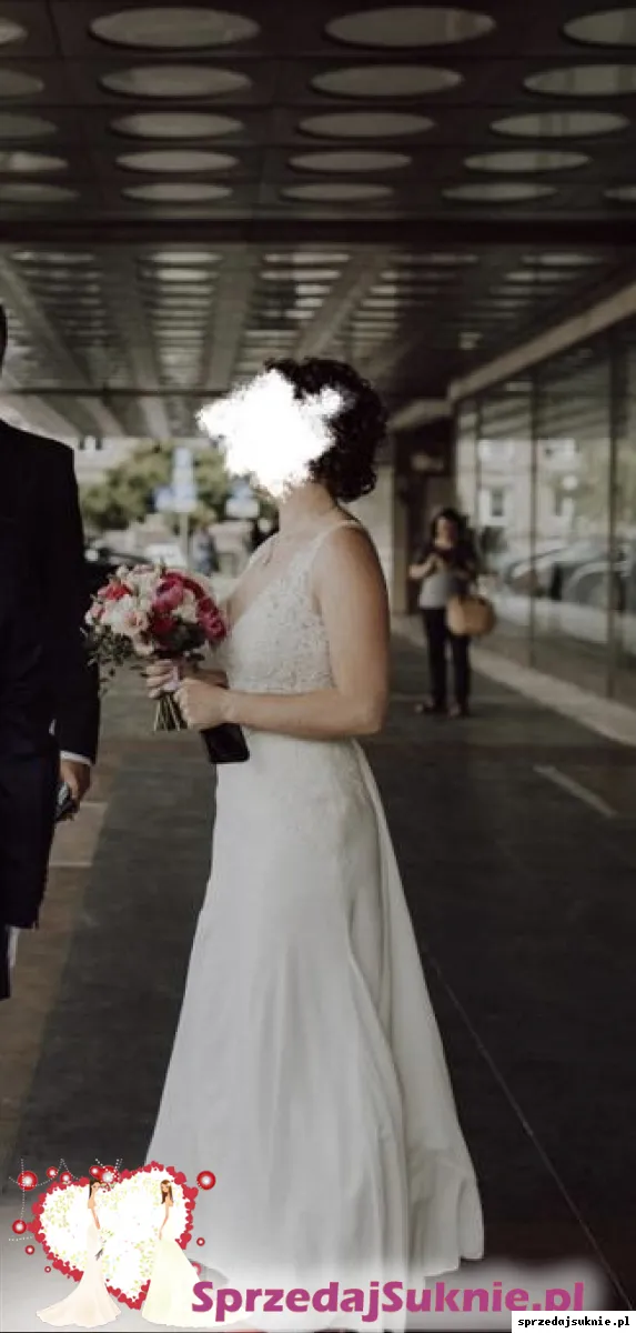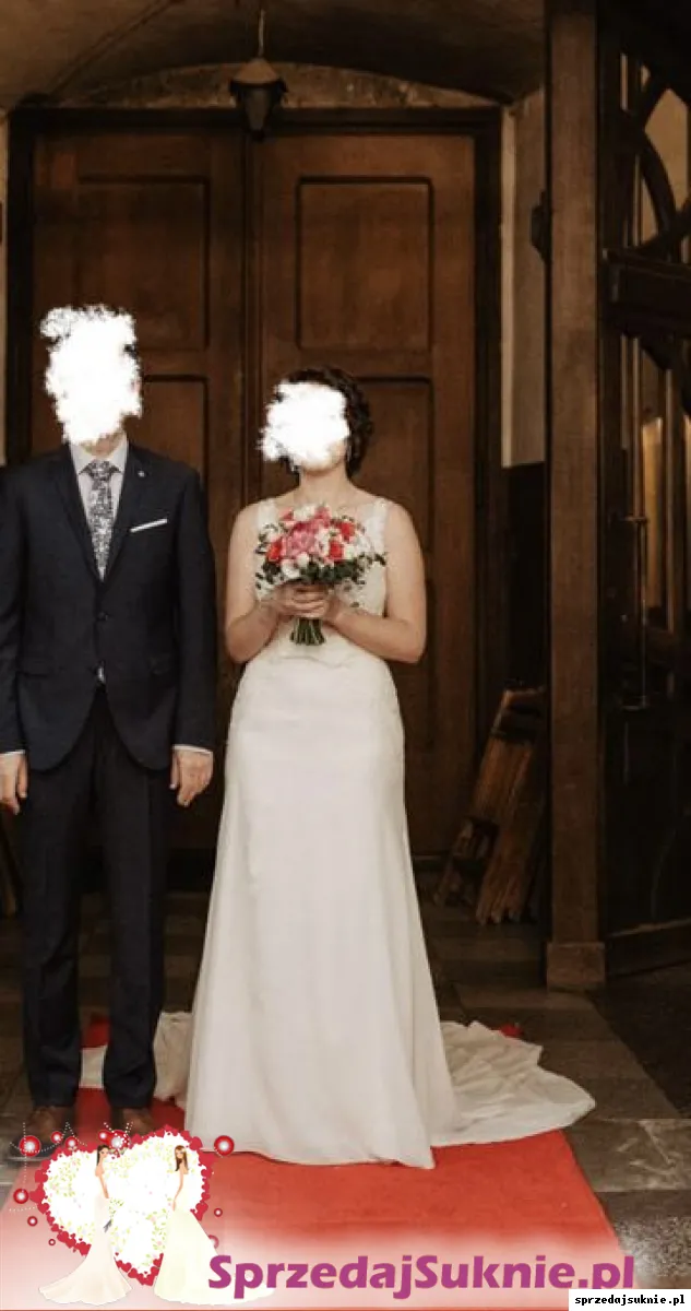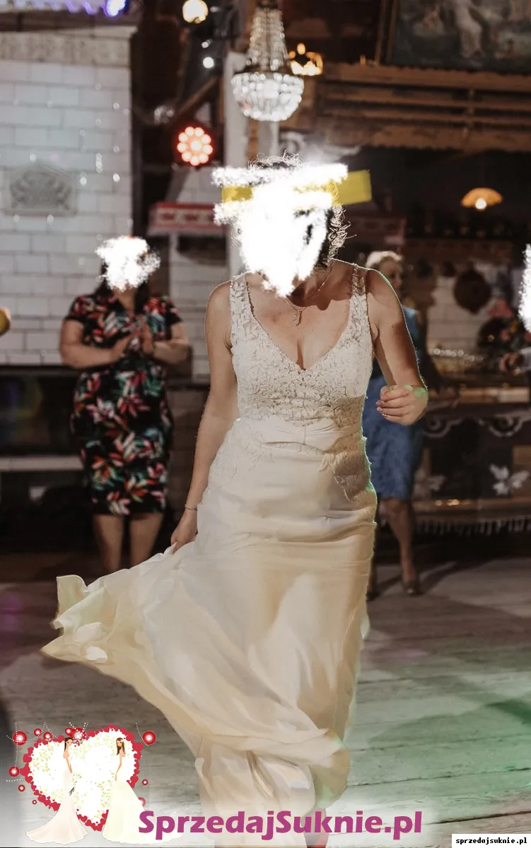 Suknia kupiona w salonie Rosa Clara w lutym 2020 r. za 1800 USD. Przeczekała ponad rok przez pandemię. Ślub odbył się w czerwcu 2021 r., dopiero teraz zdecydowałam się na sprzedaż. Suknia była o 2 rozmiary za duża i została zmniejszona przez krawcową do mojego rozmiaru (36/38) bez obcinania nadmiaru materiału, przez co możliwa jest przeróbka na większy rozmiar. Suknia dobrze się układa, nie drapie ani nie gryzie ;) Ma podpinany tren. Od pasa w górę ma kryształki, dzięki czemu fajnie odbija światło.