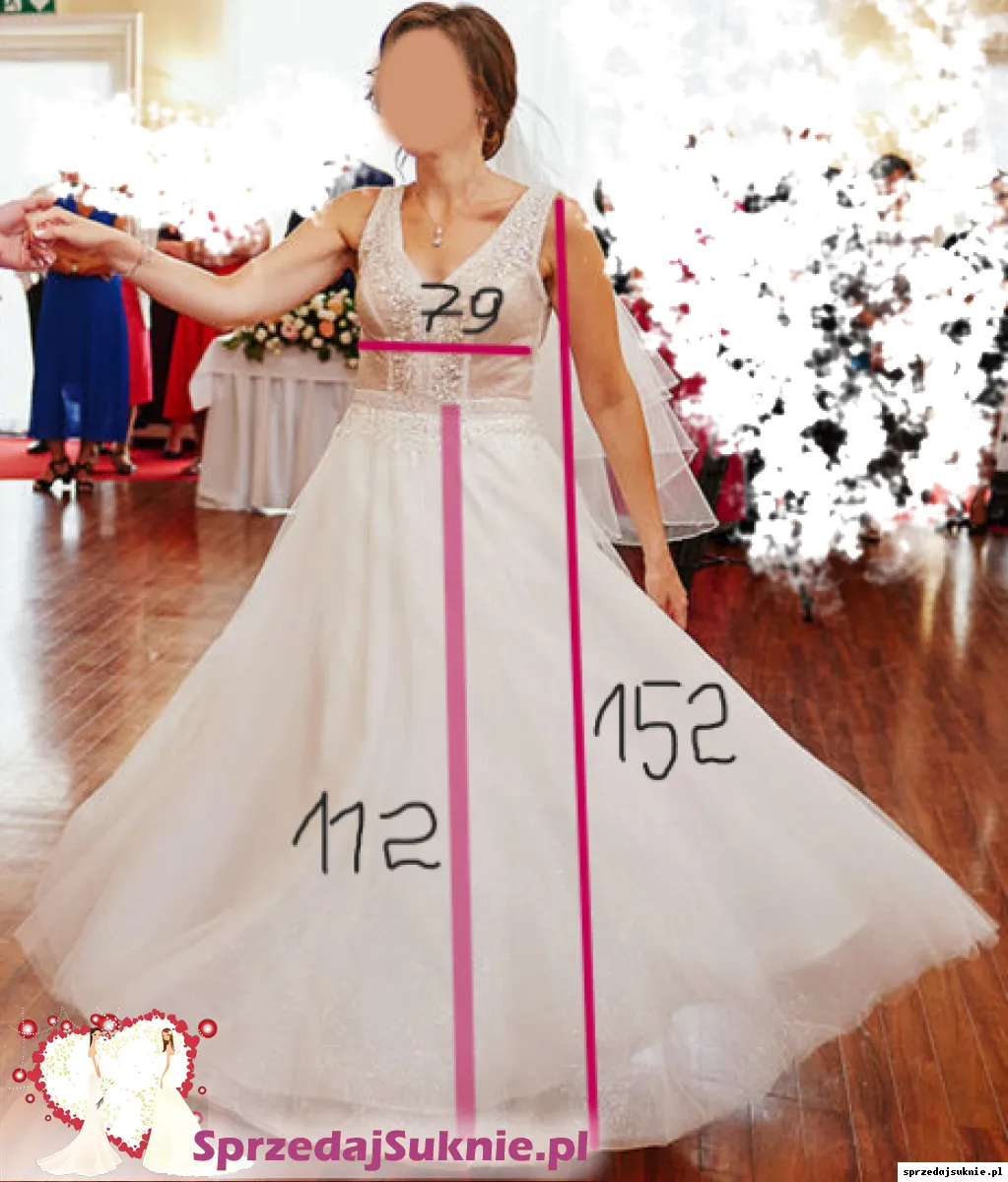 Sprzedam piękną suknię ślubną w kształcie litery A. Zapinana z tyłu na zamek. Wymiary podane są na zdjęciu. Dla chętnej osoby mogę dorzucić krótki welon. Wszelkich dokładniejszych informacji mogę udzielić priv. Zapraszam :)