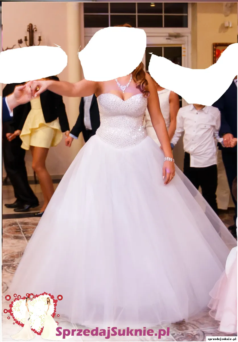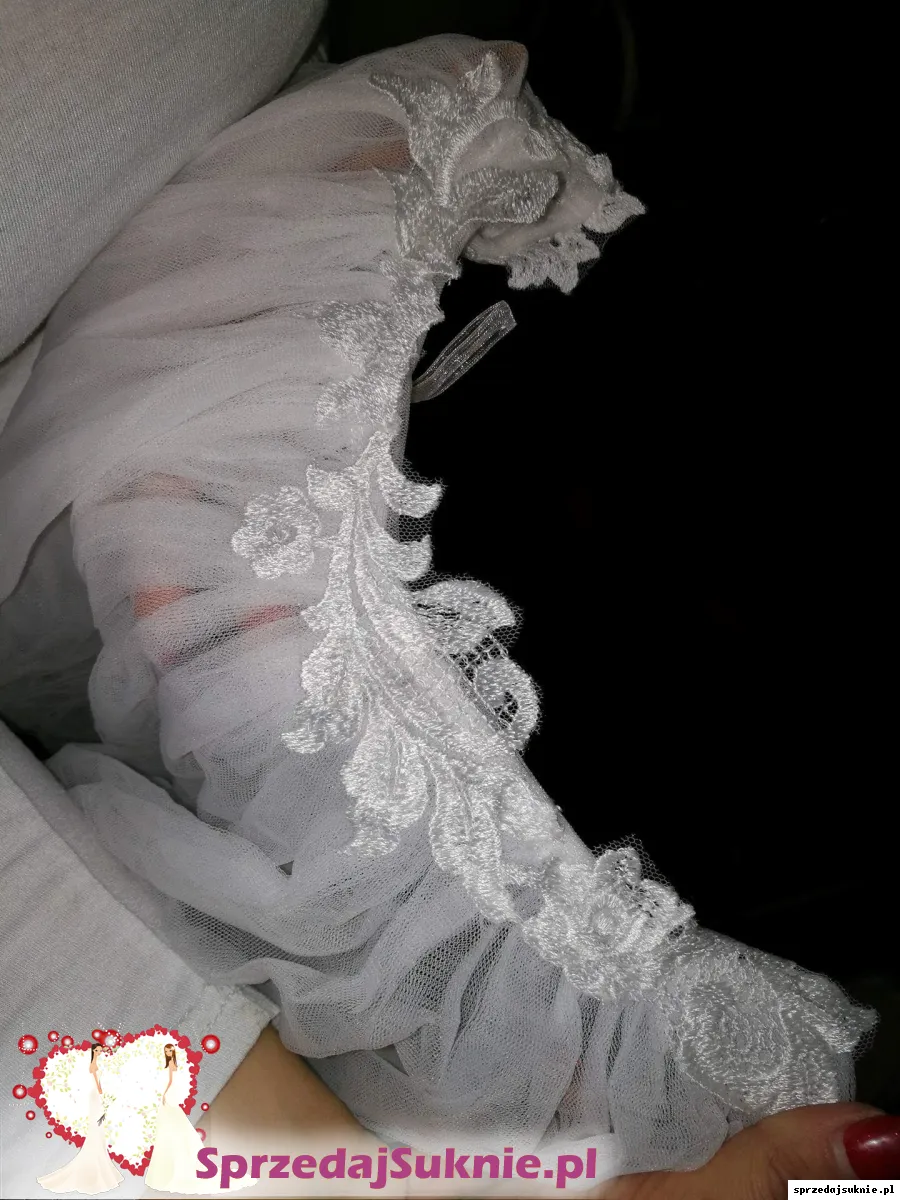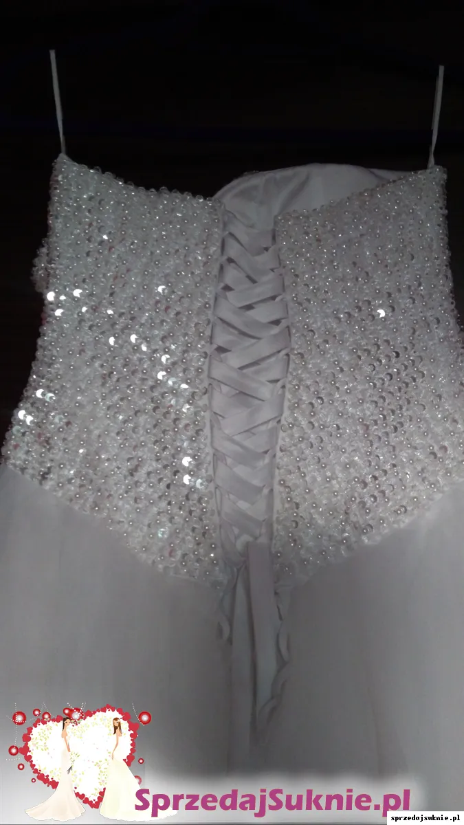 Sprzedam piękną suknię ślubną z lokalnego salonu. Suknia na rozmiar 38-42, regulowana wiązaniem, na wzrost ok 168 cm plus 7 cm obcas, wszyte miseczki (D), na kole. Długość sukni 140 cm od góry gorsetu do dołu. Po ceremonii oddana do prania i drobnych napraw krawieckich. Jak nowa
