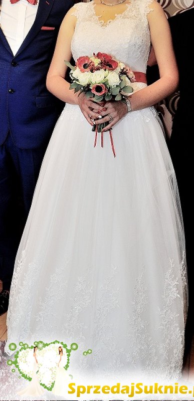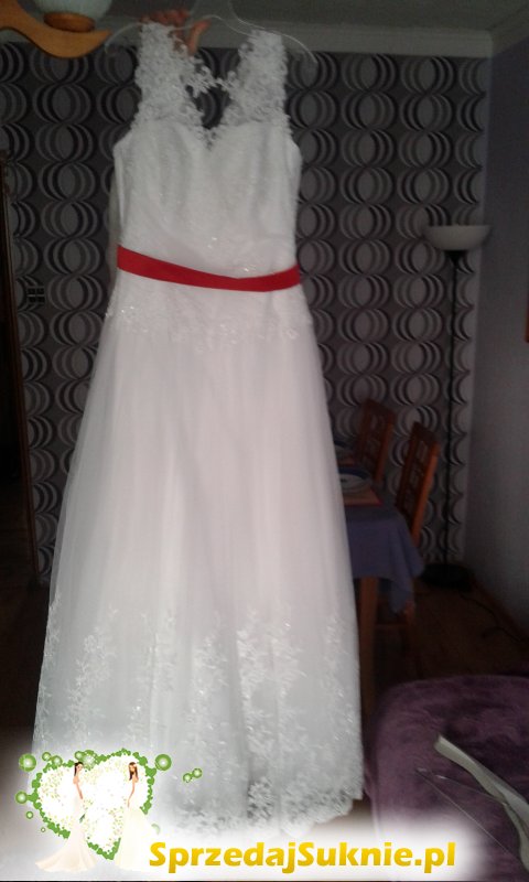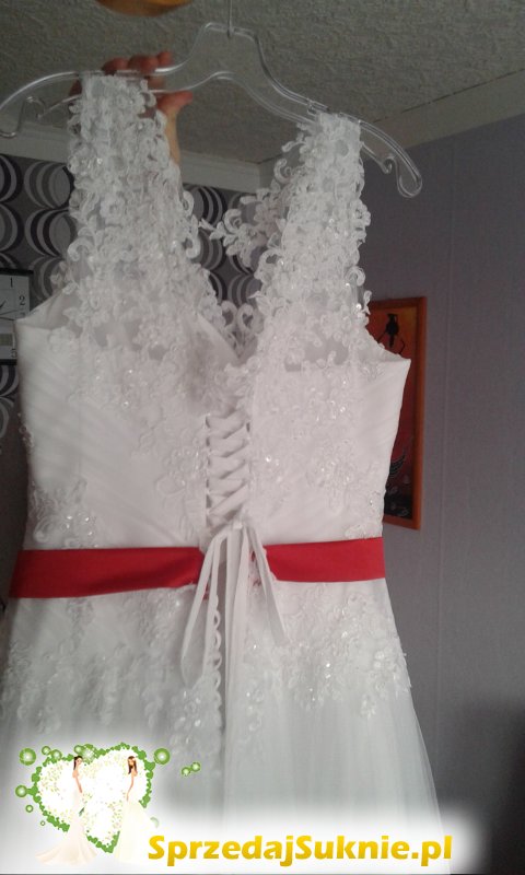 Oferuję do sprzedaży piękna suknię ślubną białą z koronki z dodatkiem czerwonego paska (można usunąć).