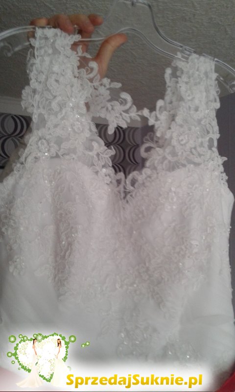 Suknia posiada koło z możliwością wyciągnięcia go. Suknia czysta, zapakowana w pokrowiec - brak uszkodzeń.