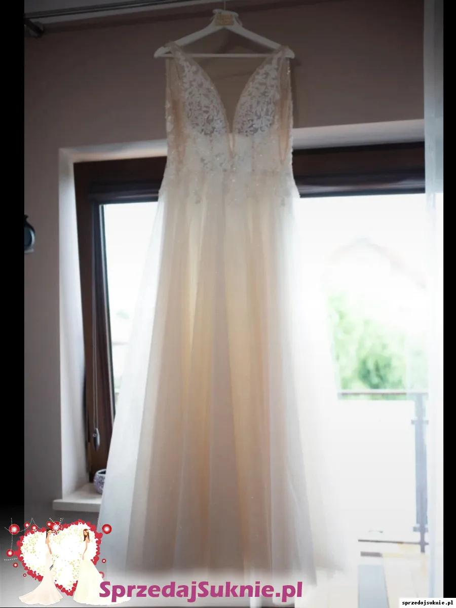 Pierwsza warstwa sukni jest brokatowa, pod spodem kolejna warstwa jest o odcieniu lekkiej brzoskwini i jeśli komuś zależy na klasycznej bieli, to właśnie tej brzoskwiniowej warstwy można się pozbyć. Gorset posiada siateczkę. Dekolt można również bez problemu pomniejszyć, żeby nie był do pępka:)