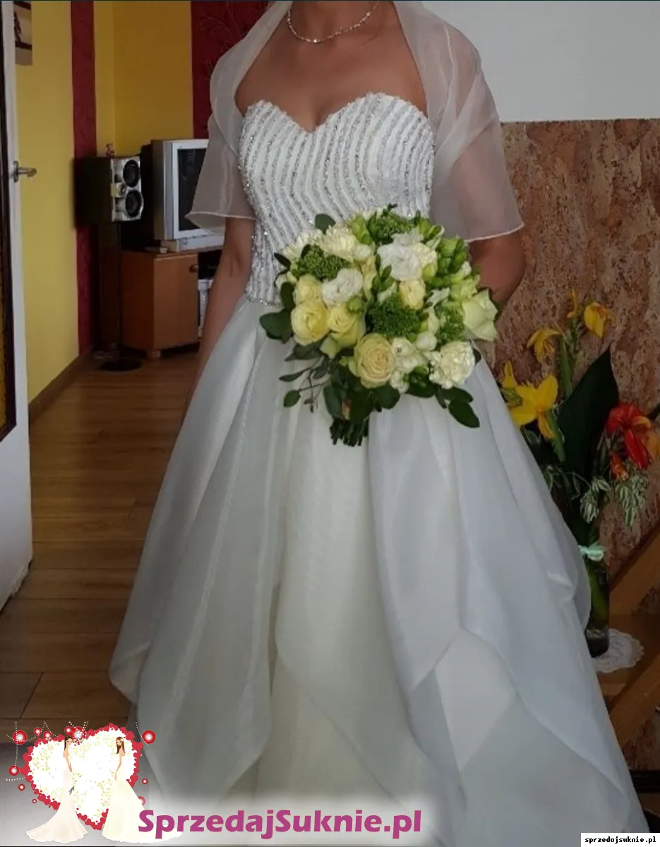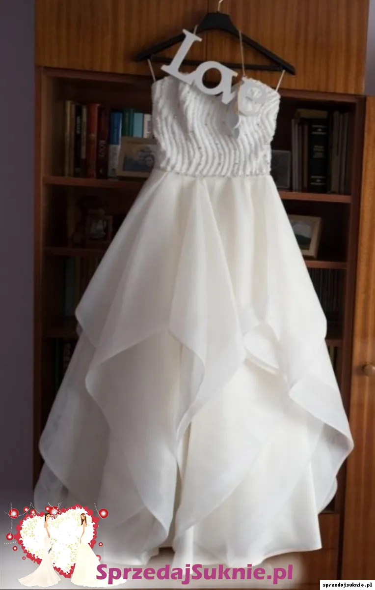 Sprzedam suknię ślubną na wzór modelu Tiplana Annais Bridal. Dół sukni wykonany z falban, które nadają jej niepowtarzalnego uroku oraz wyjątkowego i zaskakującego blasku przypominającego kwiat. Gorset ręcznie wyszywany białymi i srebrnymi kamyczkami. Suknia zapinana na ukryty zamek. Bardzo precyzyjne wykonanie. Suknia bardzo wygodna w tańcu.