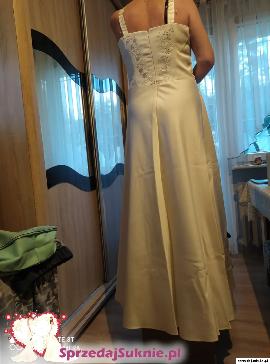 Posiadam piękna suknie ślubną kolor ecru z platynowym haftem.Rozmiar 40-42.Fason pasuje także kobietom w ciąży.Uszyta na indywidualne zamówienie w salonie krawieckim "ANITA" w Rogalinku.Polecam !Bez żadnych uszkodzeń i zabrudzeń,tylko do odprasowania.