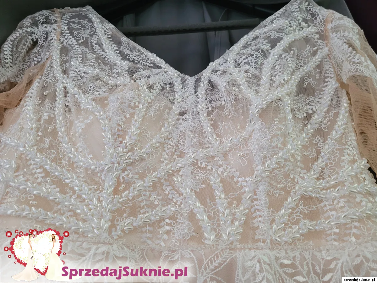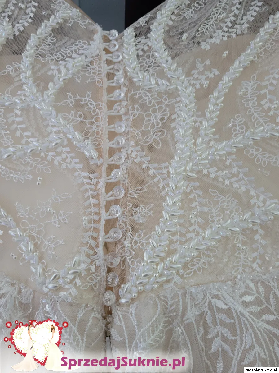 Góra wyszyta z koronki i koralików (3 koraliki są na żyłce i wymagają wszycia - nie widać na zdjęciu, są malutkie), dodatkowo doszyty pasek w tali z przeźroczystych koralików (paseczka nie było w projekcie został doszyty na moje życzenie dodatkowo kilka dni przed ślubem, kilka koralików odpadło z tyłu, ale nie jest to szczególnie widoczne. Można odpróć w razie czego bez problemu)