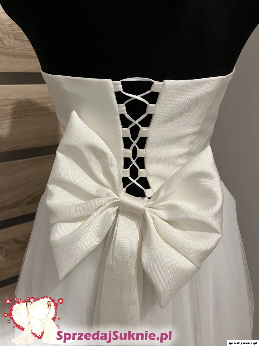 Materiał: Wysokiej jakości, pięknie układa się w ruchu i zapewnia komfort. Gorset jest uszyty z mikado królewskiego, dół składa się z podszewki i kilku warstw tiulu.