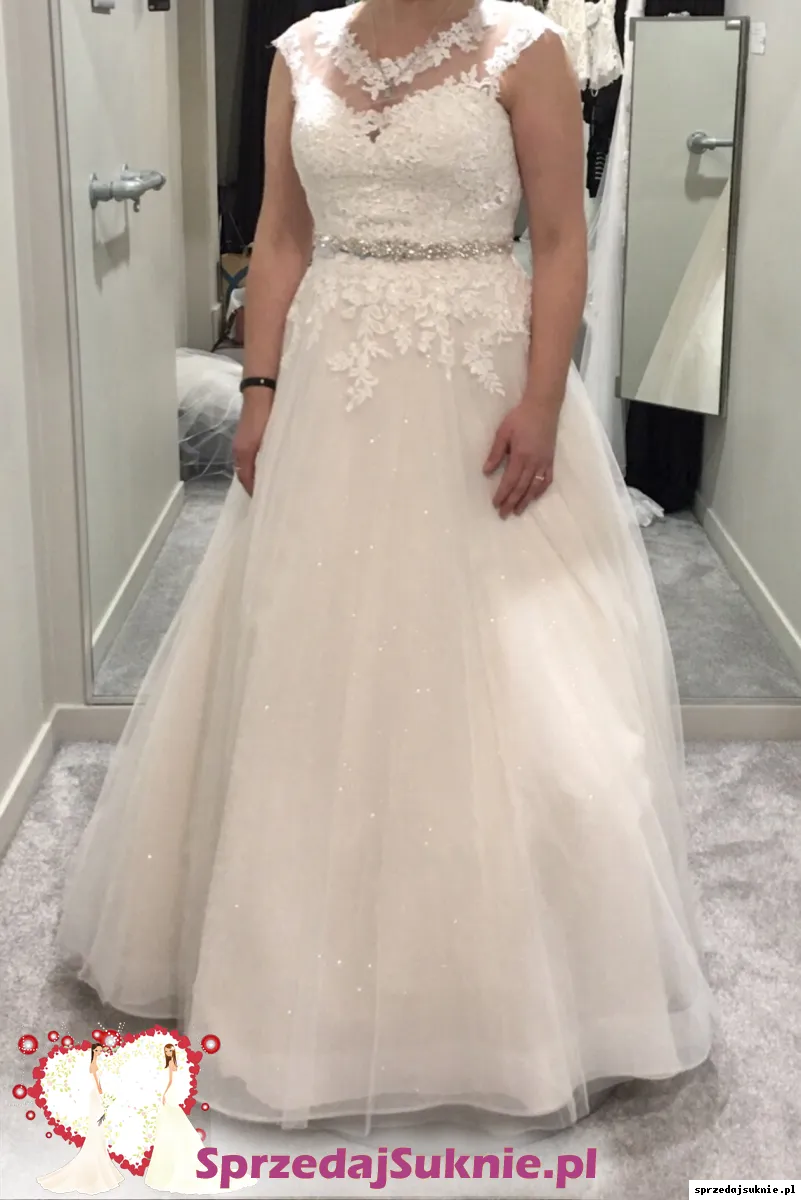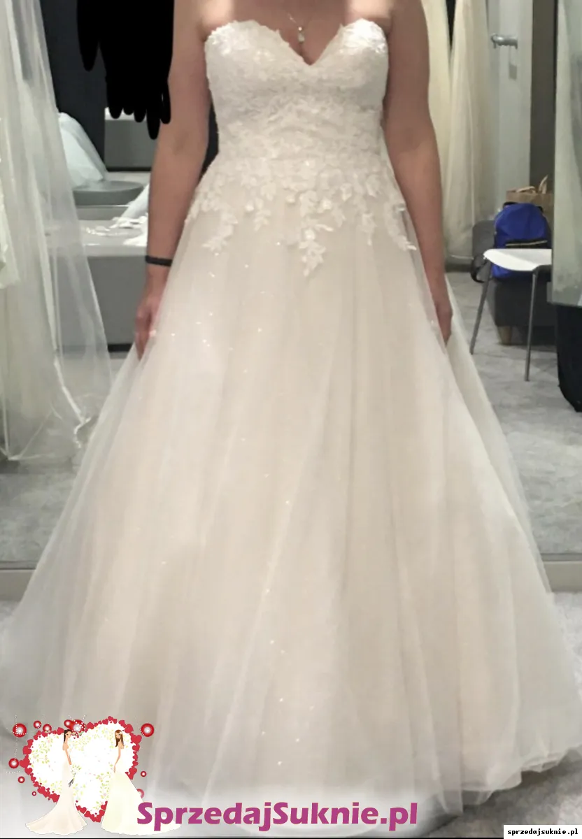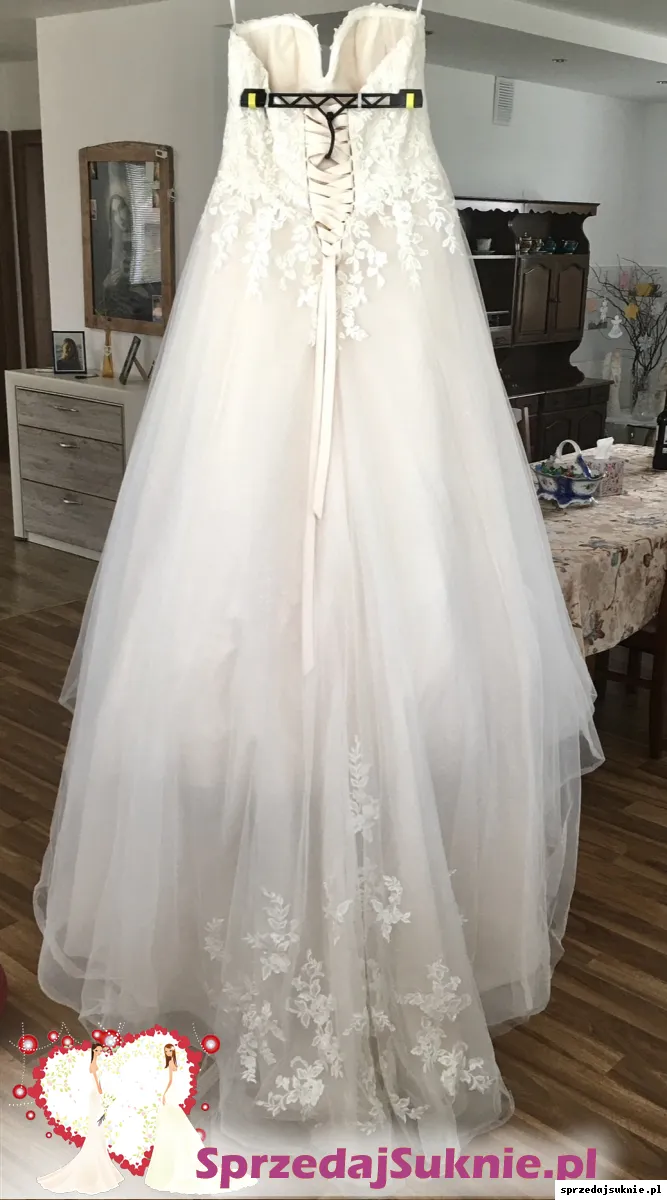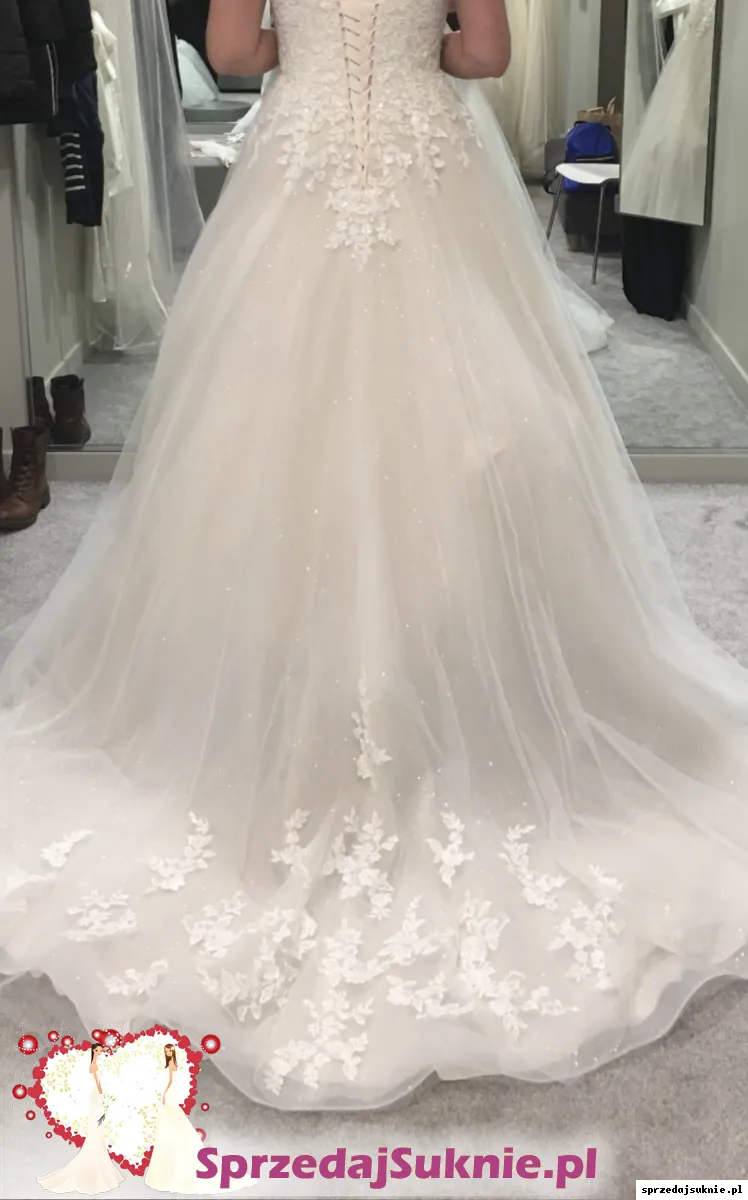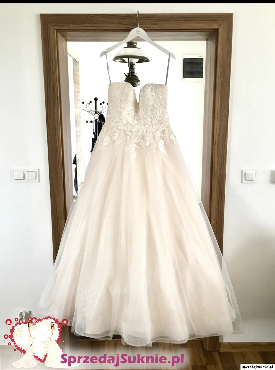 Suknia ślubna bez ramiączek z kwiecistej wyszywanej koronki z delikatnymi cekinami i subtelnym, brokatowy tiulem koloru kość słoniowa + bardzo delikatnym odcieniem brzoskwinki. Posiada wygodny wbudowany stanik. Plecy są sznurowane co zapewnia komfort oraz idealne dopasowanie do sylwetki. Suknia jest dopasowana w biodrach i stopniowo rozszerza się od talii do trenu co nadaje sylwetce mega naturalny kształt! Posiada cudowny długi tren z eleganckim koronkowo- kwiatowym motywem ozdobionym subtelnymi cekinami. Z tylu suknia ma malutki guziczek, na który można swobodnie upiac tren, tak aby była takiej samej długości dookoła.Jest ona praktycznie na każdy wzrost w zależności od wysokosci obcasa. Suknia w całości jest pełna romantyzmu oraz szyku i elegancji.