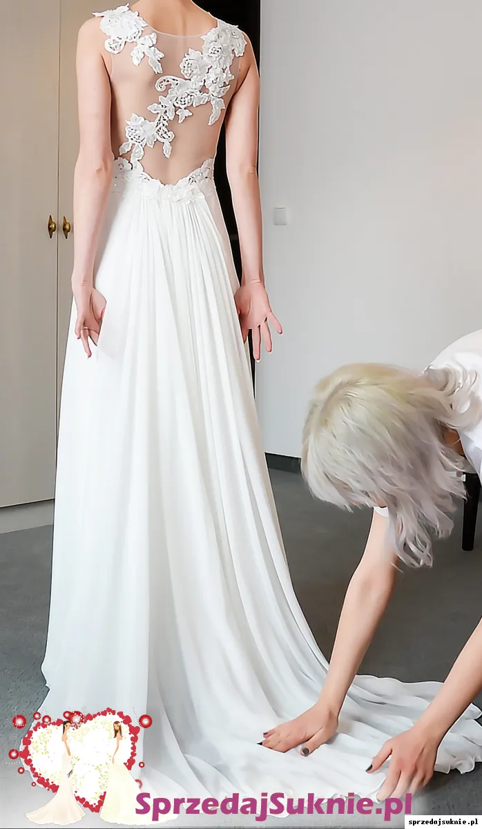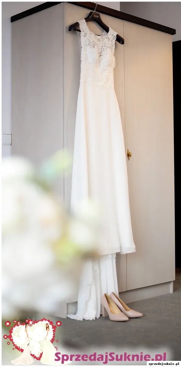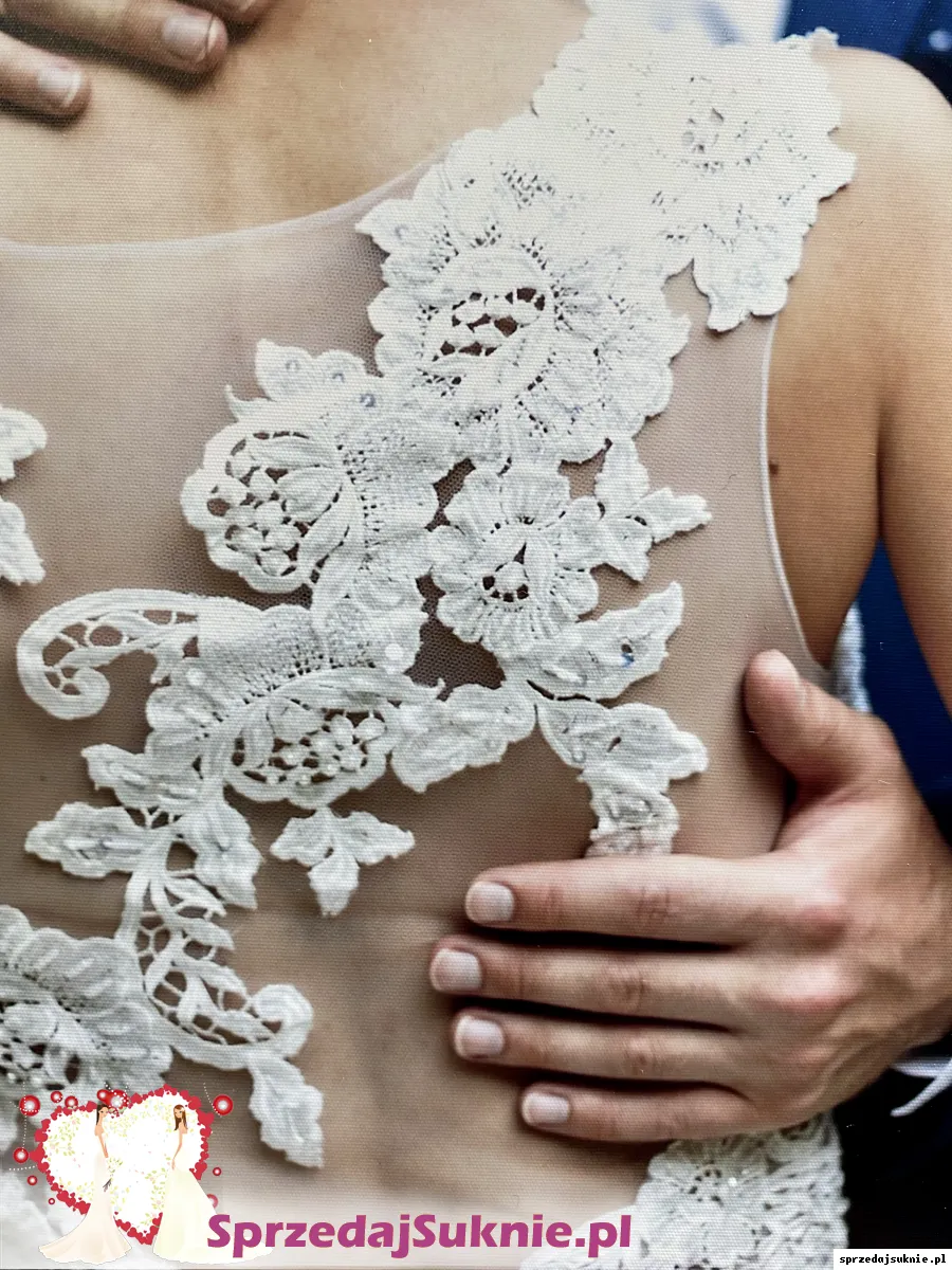 Suknia przypadnie do gustu minimalistkom, pięknie podkreśla urodę, delikatne zdobienia przy koronce typu koraliki.