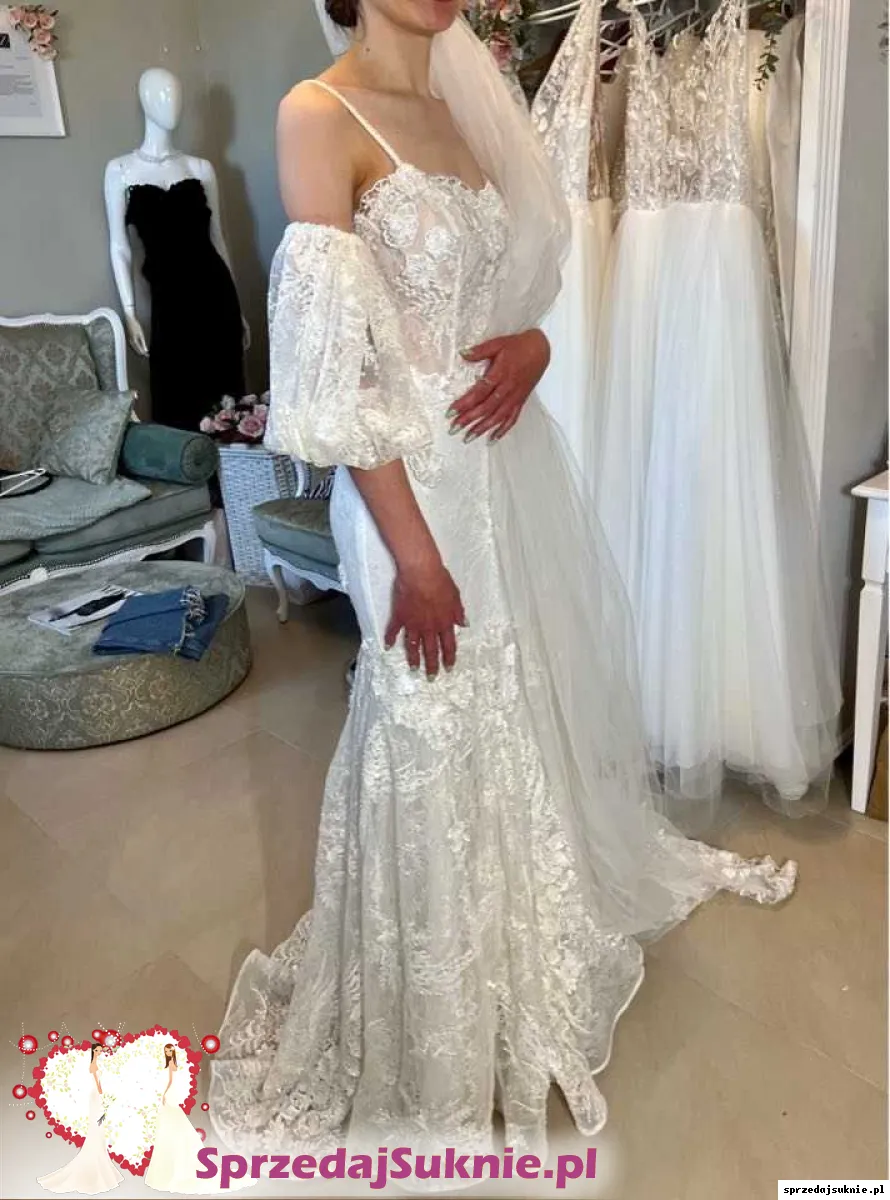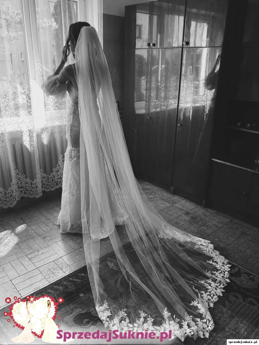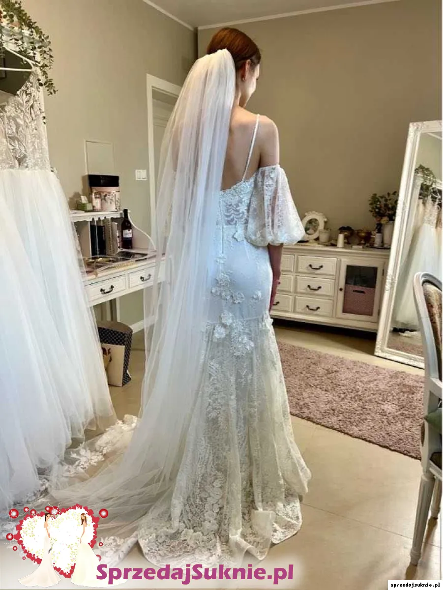 Śliczna suknia ślubna z bufkami oraz długim obszytym welonem