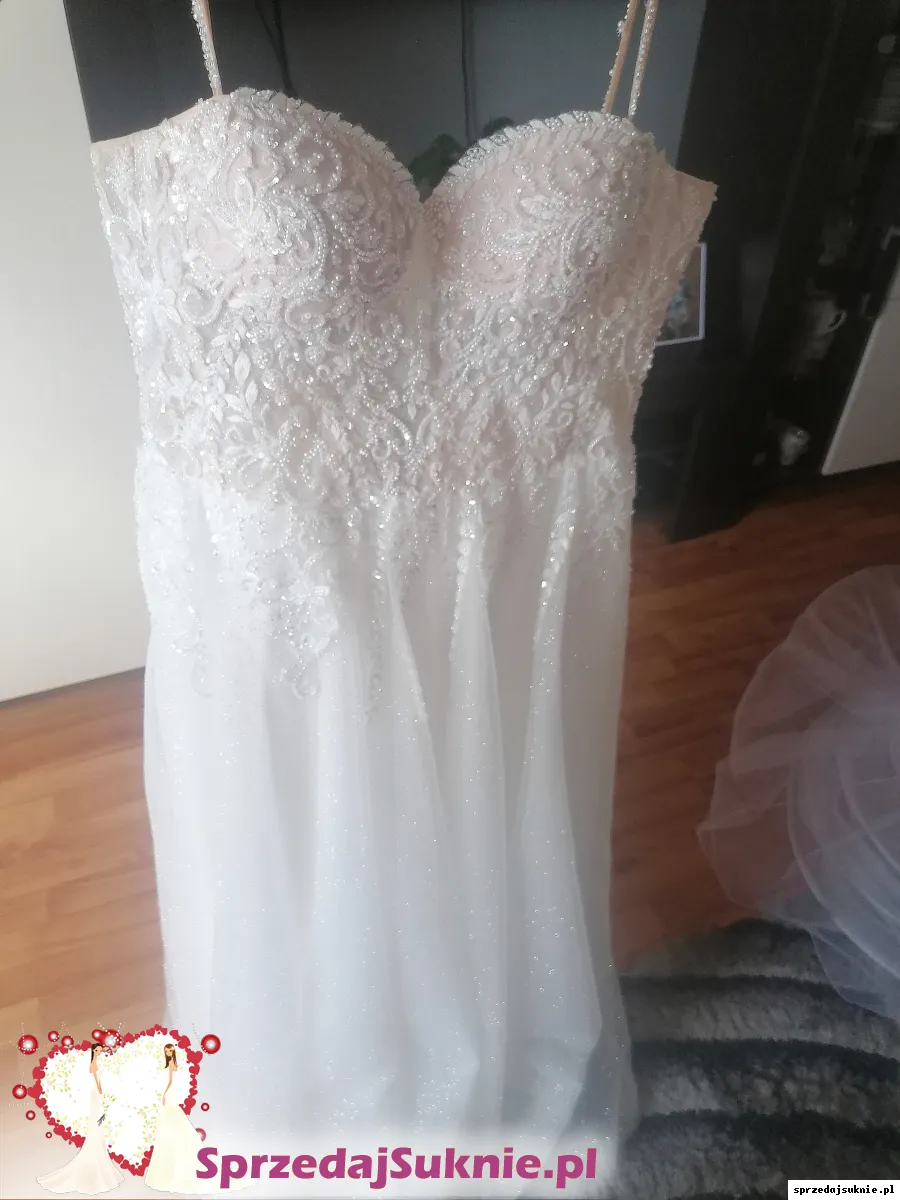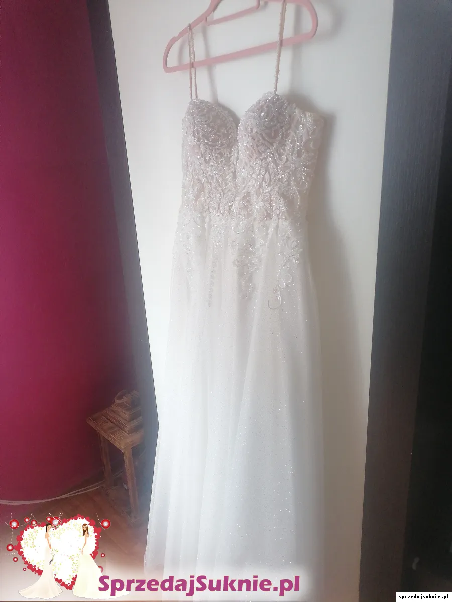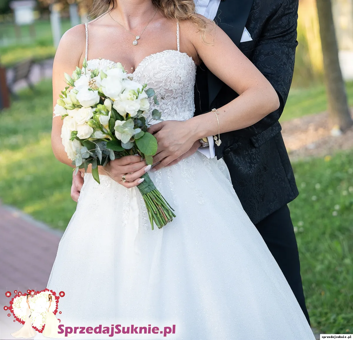 Suknia jest piękna mimo że rozmiar 42 niesamowicie mnie wyszczupliła w tym dniu czułam się jak księżniczka, cała pięknie się mieni błyszczy. Użyta 2 miesiące temu. Są do niej rękawy w komplecie do kościoła idealnie się sprawdzą plus koło 3 w zestawie. Wzrost 165 buty miałam płaskie na miarę szyta w salonie Mariolu Sosnowiec. Jest regulowana pasem z tyłu i dopiero suwak więc spokojnie można ją dopasować do swojego ciała i każdych piersi, dokładne wymiary chętnie podam gdy wpadnie komuś w oko. Oczywiście nic nie zniszczona Gorąco polecam sama drugi raz już nie ubiorę więc cóż :)