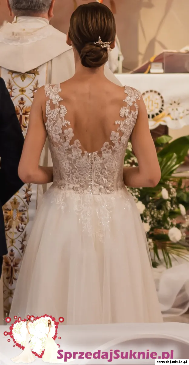Sprzedam przepiękną suknie ślubną w stylu księżniczki, dekolt i plecy wycięte w literkę V, zakupiona w salonie w 2024 roku. Góra z błyszczącymi elementami, naszyte na cielistą siateczkę, zapinane na ozdobne guziczki z tyłu. Dół zapinany na zamek, cztery warstwy tiulu, z czego jedna warstwa brokatowa, przez co pięknie się mienia przy odbiciu słońca oraz w sztucznym świetle w pomieszczeniu. Założona na jednodniowy ślub (krótka sesja zdj. była w trakcie wesela).