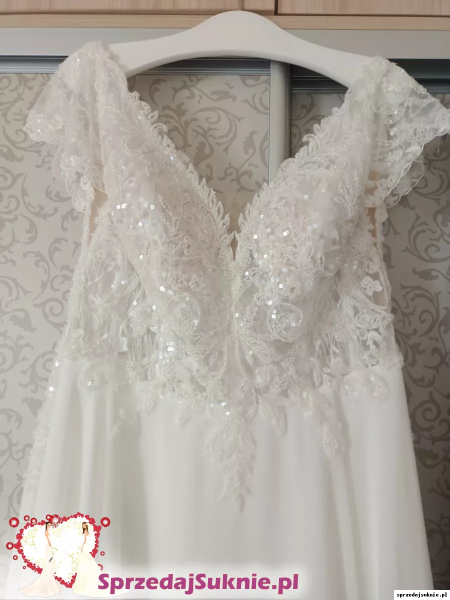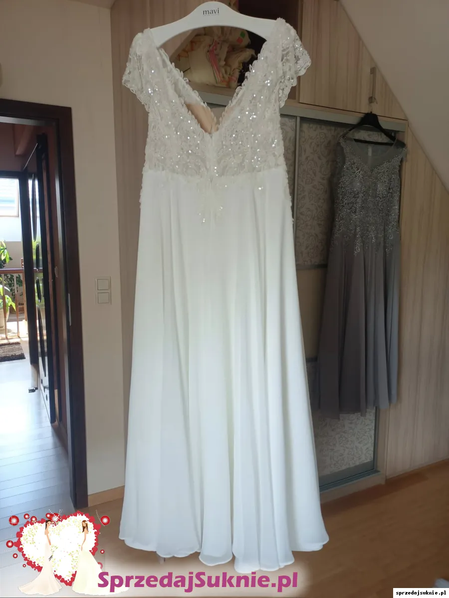 Sprzedam śliczna suknię ślubną kupioną w salonie MAVI w Otwocku, lekką, przewiewną koloru ecru z efektowną zdobioną koronką z perełkami i cekinami z wbudowanym stanikiem i pięknym wycięciem na placach. Jest już po czyszczeniu. Bardzo wygodna.