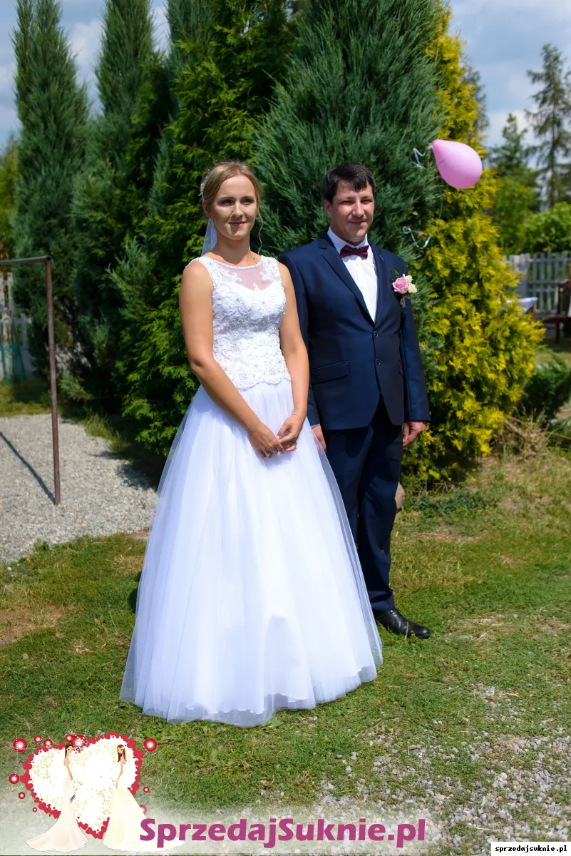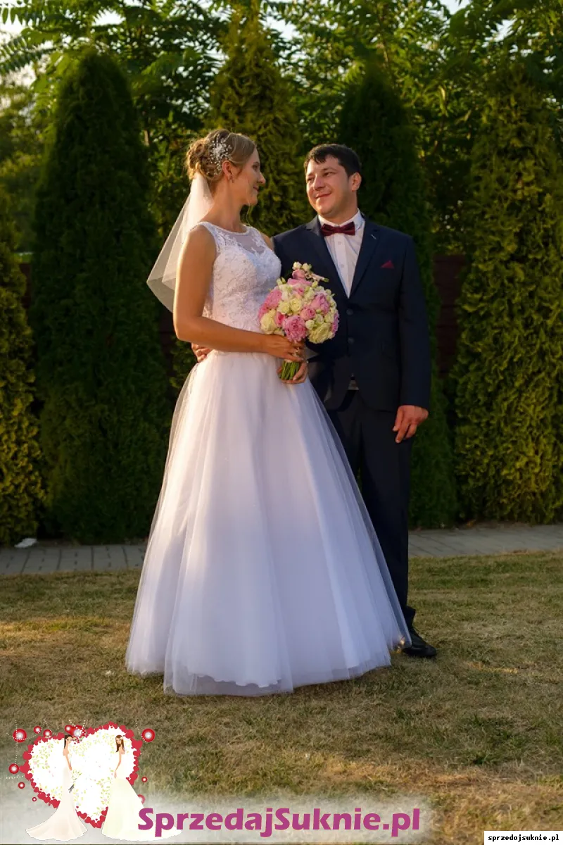 Witam. Mam do sprzedania suknie ślubną w rozmiarze 40/42 na wzrost 172 cm + 2 cm obcas. Suknia w kolorze białym. Zakupiona w salonie Dalida w Tarnobrzegu. Góra sukni składa się z gorsetu obszytym koronką ze zdobionymi diamencikami. Dół z tiulu, z kołem. Pod jedną warstwą jest delikatny brokat, który bardzo ładnie się prezentuje zwłaszcza przy świetle dziennym. Suknia jest w idealnym stanie, bez uszkodzeń. Dodatkowo w cenie pokrowiec, welon i ozdoba do włosów. Zapraszam do przymiarki.Więcej informacji na priv.
