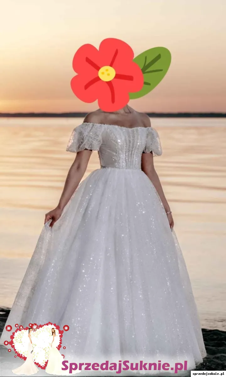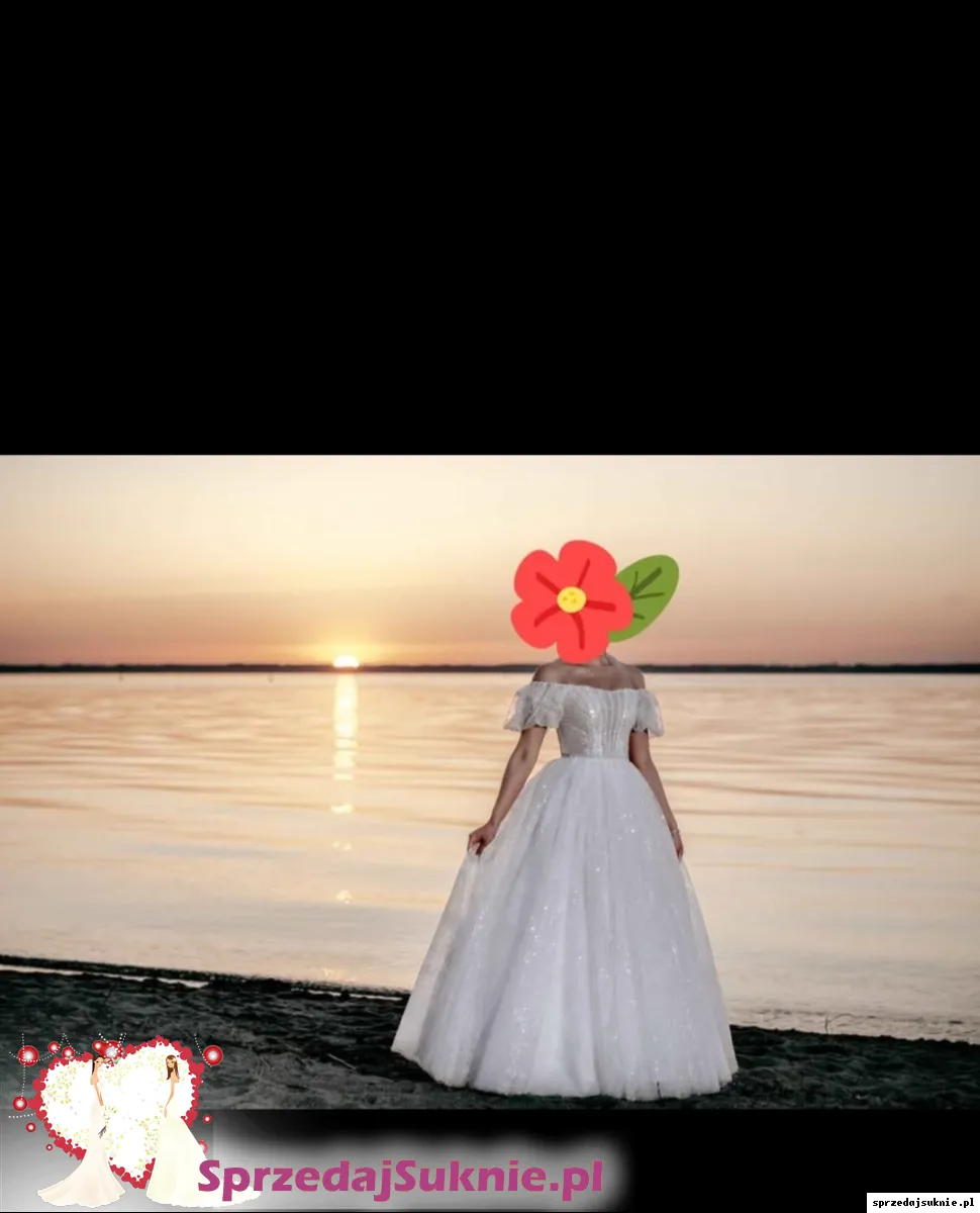 Sprzedam suknię ślubną (rozmiar 36) szytą na miarę, która ubrana została tylko raz. Sukienka odczyszczona. Jej kolor to biel w wersii off-white. Dół sukienki składa sie z halki i kilku warstw tiulu natomiast zewnętrzna warstwa to błyszczący haft. Jest gorsetowa, pięknie wiazana z tyłu. Gorset przyozdobiony w błyszczący haft, (perełki i cekiny). Rękawki bufiaste można mieć spuszczone na ramionach lub założone do góry (wygodne podczas tańca, całą rękę można podnieść do góry).