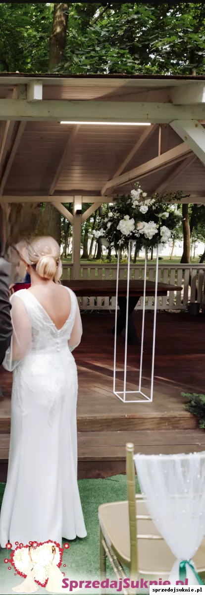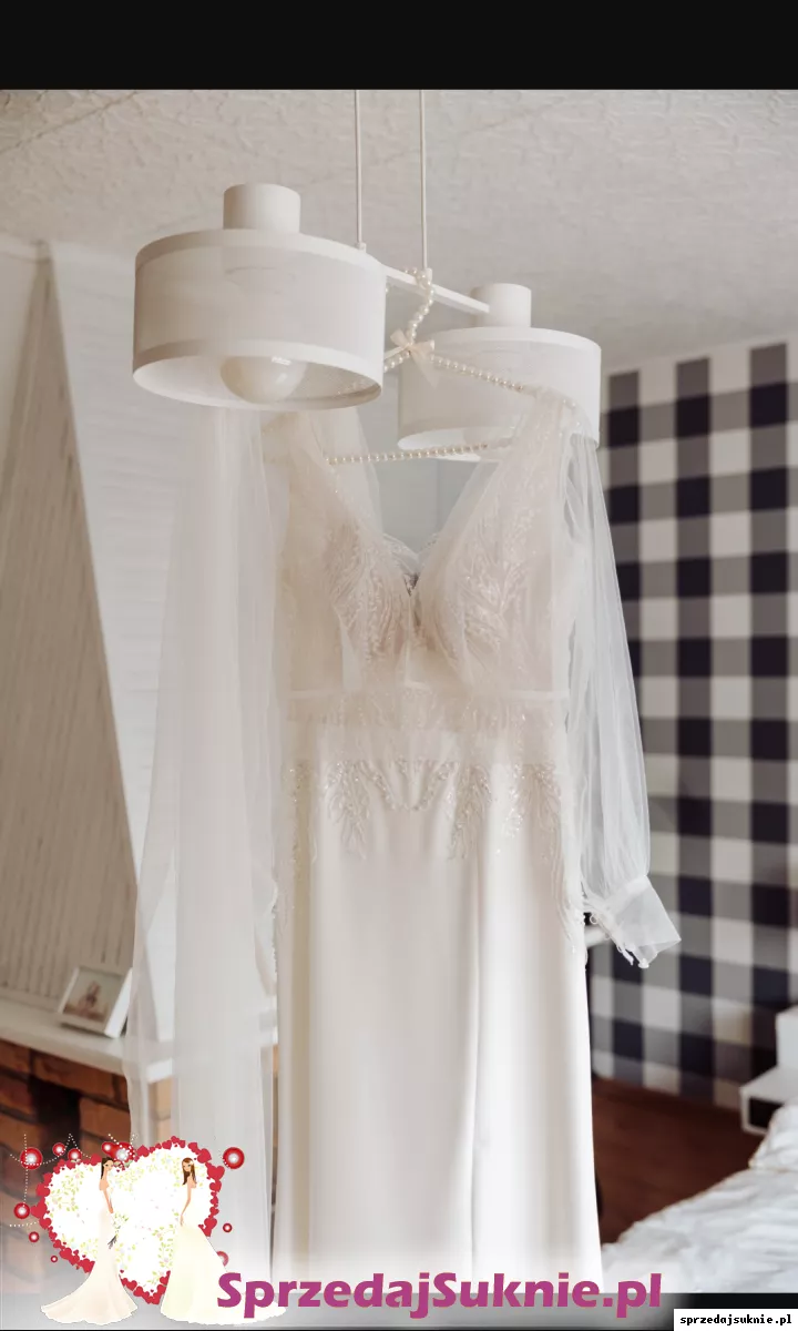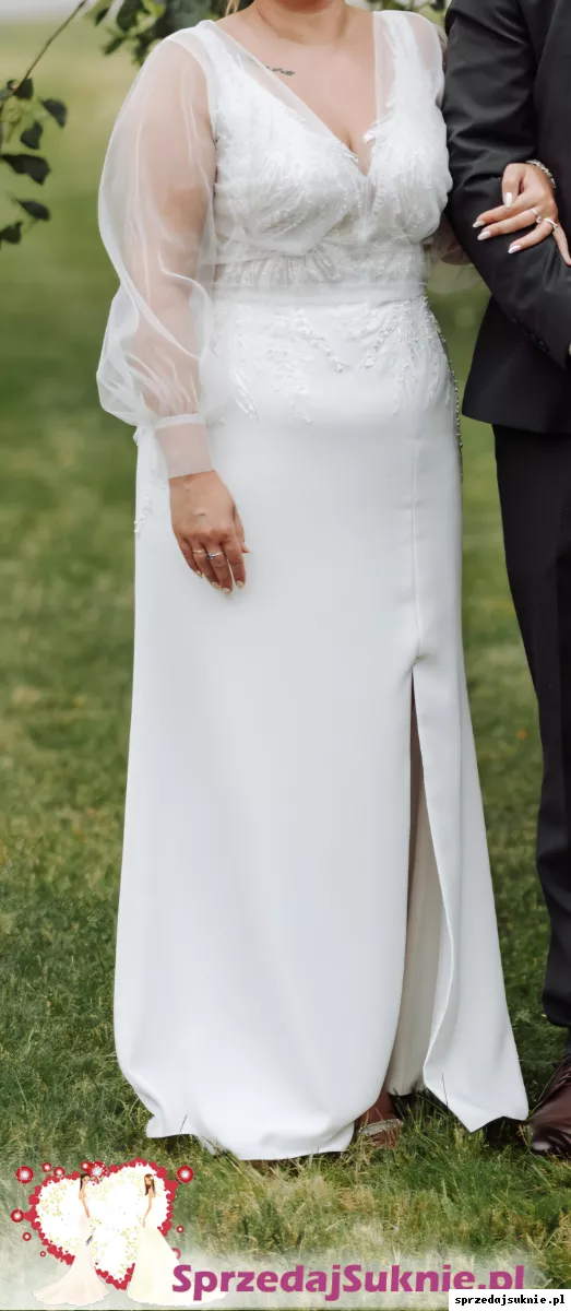 Suknia zakupiona w salonie w Poznaniu w 2024 roku. Założona tylko raz. Do sukni na zamówienie doszte zostały długie rękawy, są bardzo wygodne na ukryte zatrzaski na ramionach, bardzo łatwo można je ściągnąć. Suknia skrócona na wzrost ok 160 cm. Bardzo wygodna.