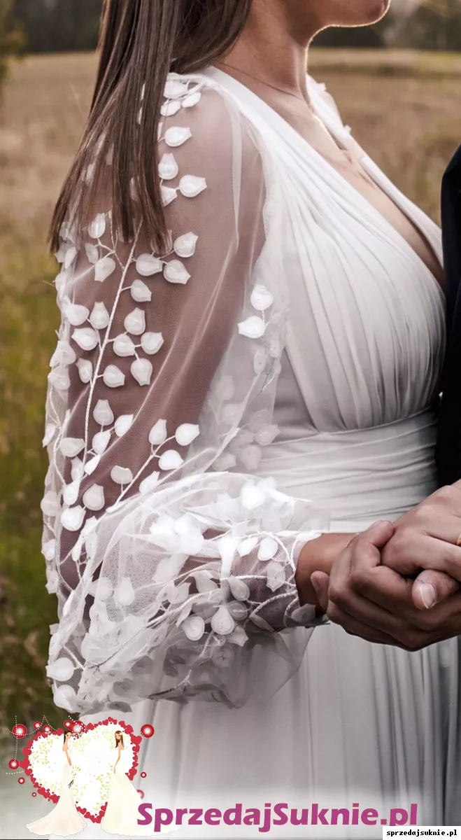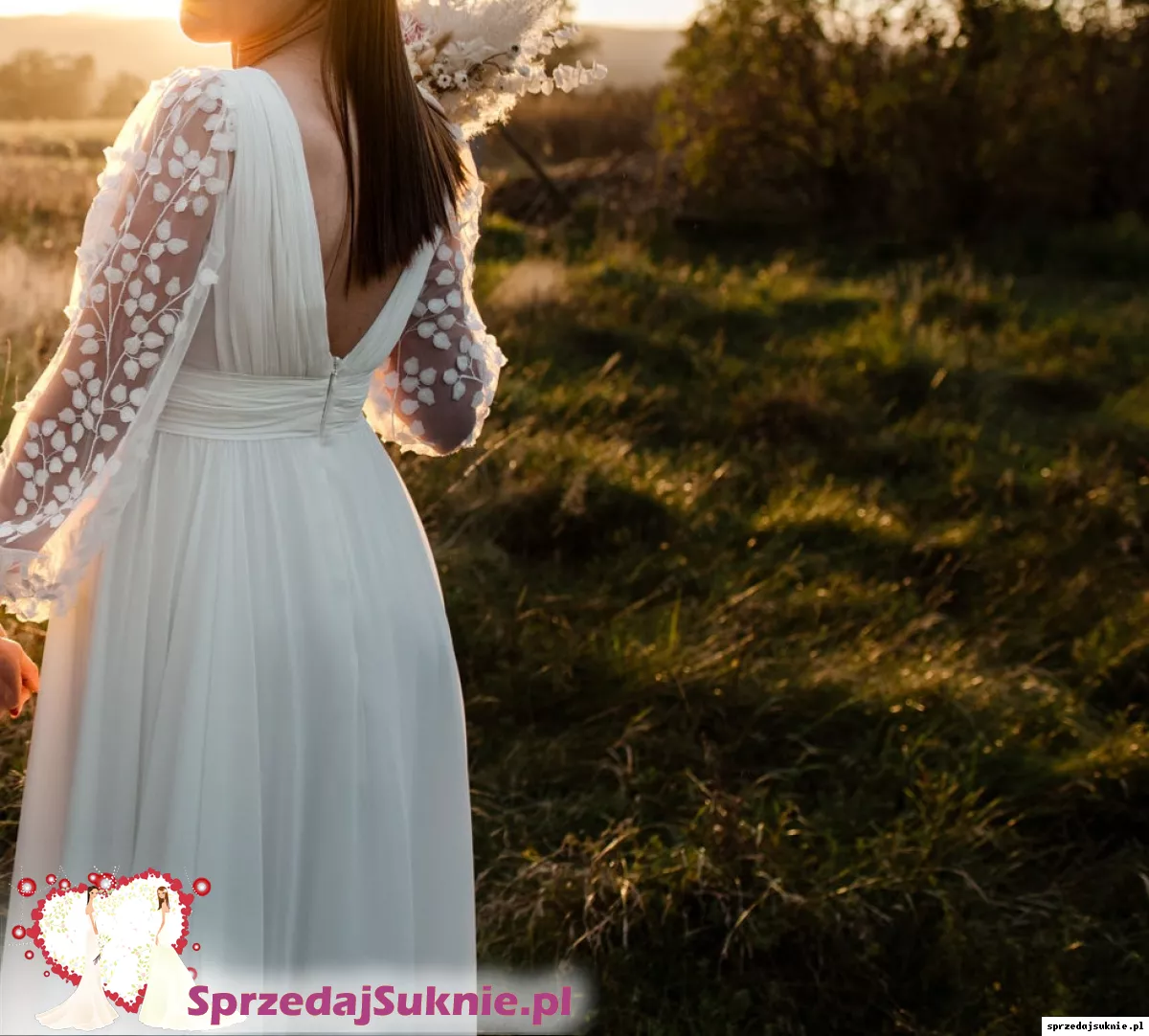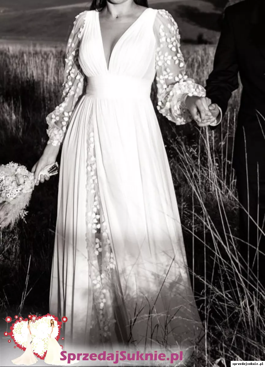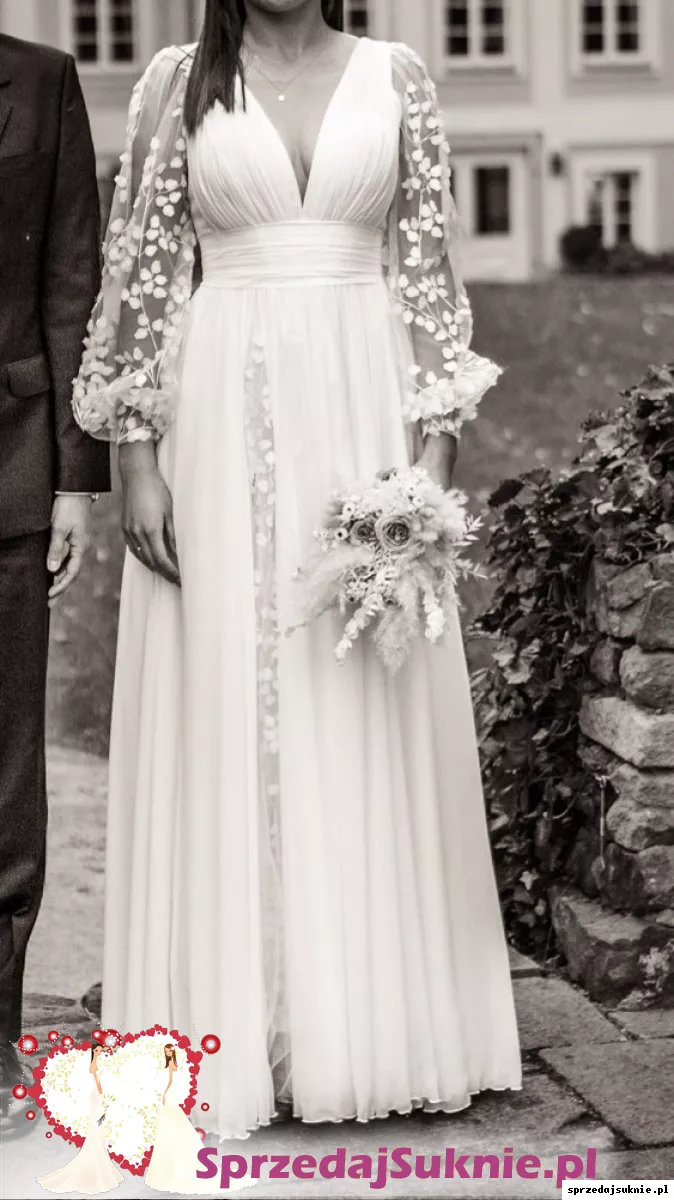 Szyta na wzrost 180cm + mały obcas. Biust około 100cm. Biodra luźne. Głęboki dekolt, na plecach również wycięcie + głęboki rozporek na nodze, długie rękawy z przepięknymi dekoracjami kwiatowymi. Długość sukienki łatwa do skrócenia. Możliwość przymiarki w Kaliszu lub wysyłka.
