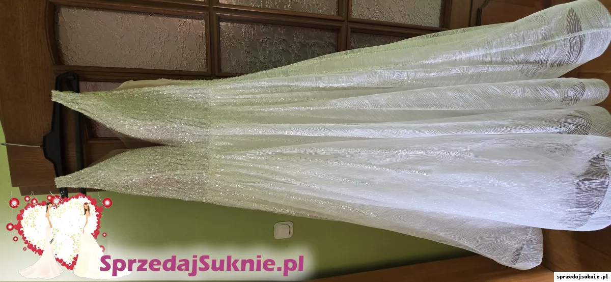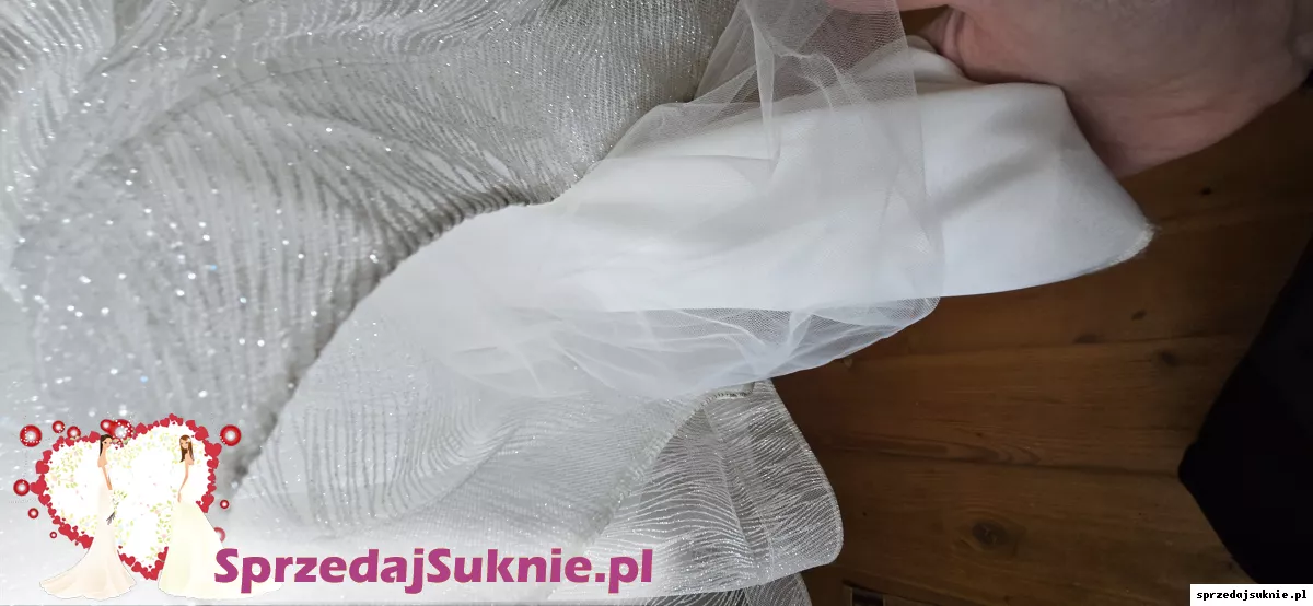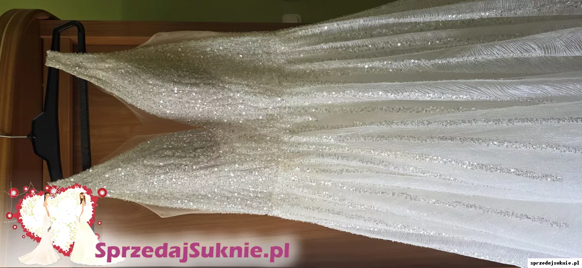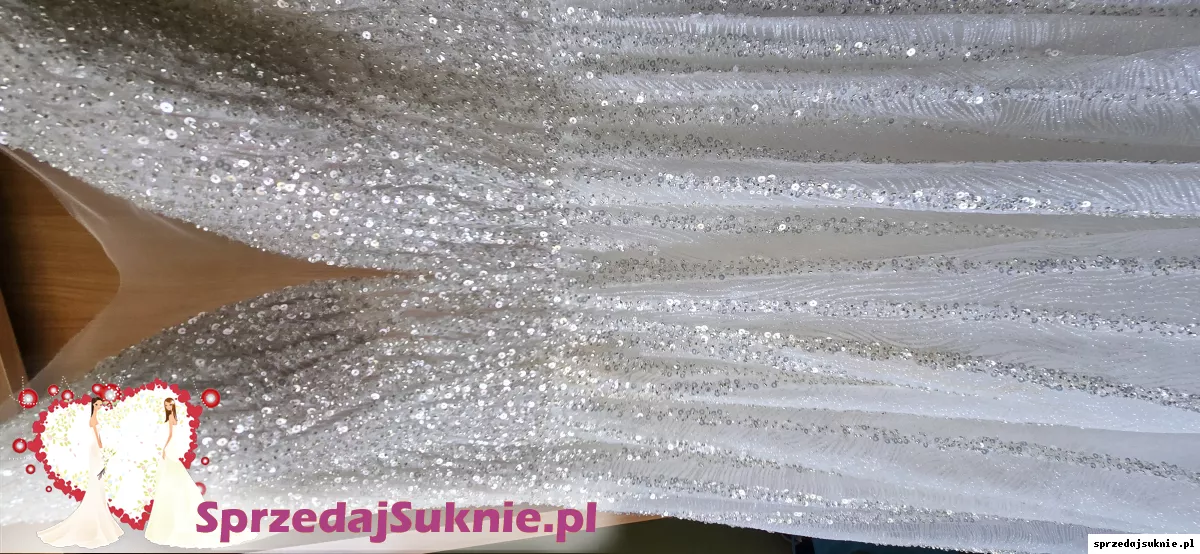 Witam,sprzedam suknię ślubną w bardzo dobrym stanie kupiona w 2023 r w salonie sukien slubnych.Długość całkowita 143 cm ,2×41 cm w biodrach ,wbudowane miseczki,obcas byl 8 cm.Zapinane na 11 przezroczystych guzikow i zamek.Ozdobne cekiny.Zapraszam do kontaktu i przymiarki sukni.