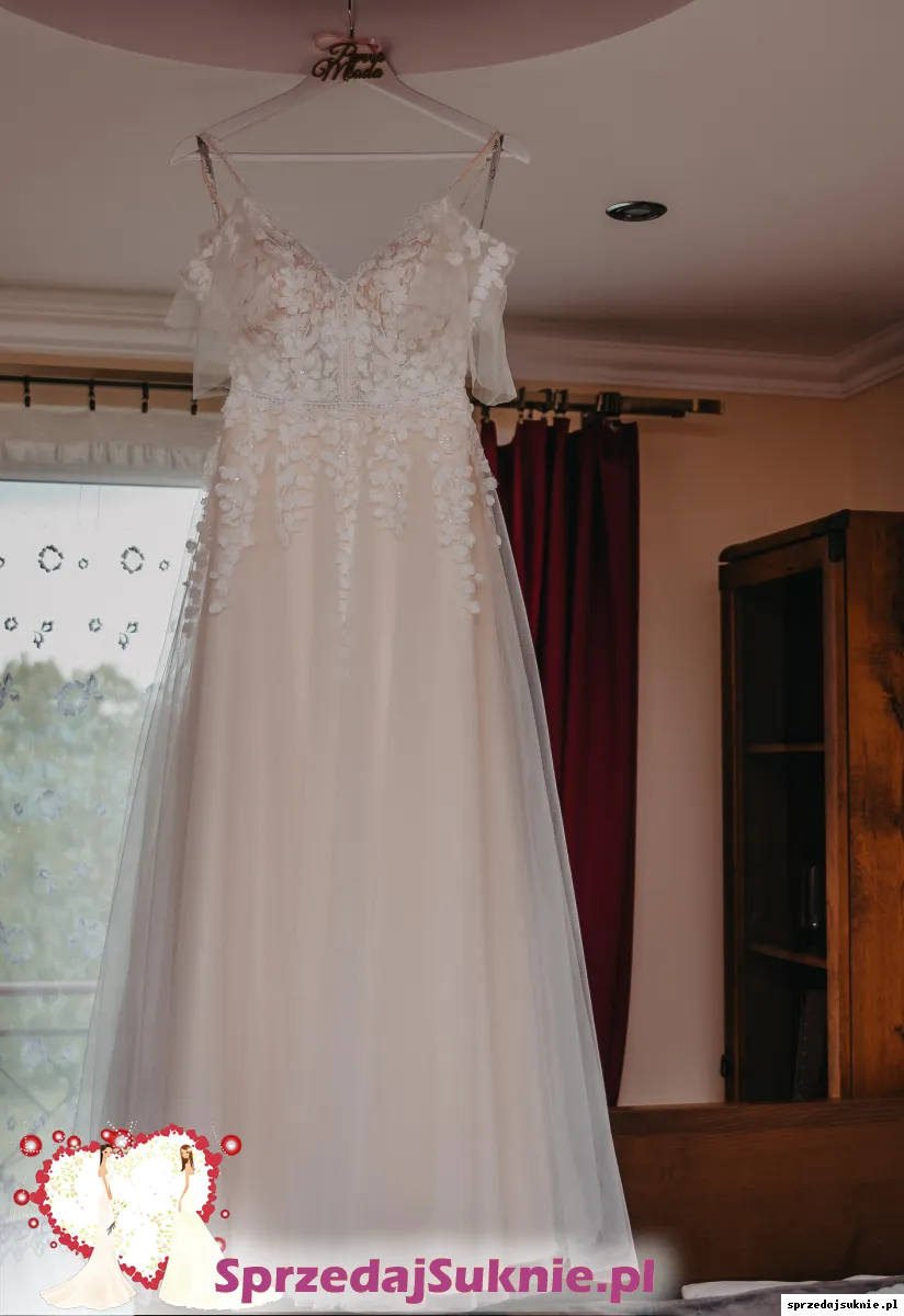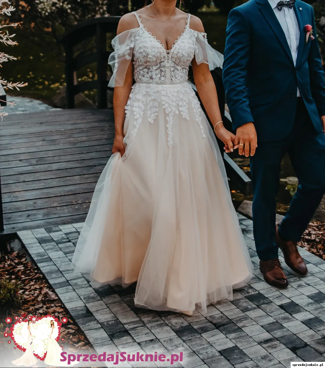 Sprzedam suknię ślubną z kolekcji The One 2022. Suknia posiada krój litery A, dodatkowo posiada koło w rozmiarze S (nieużywane). Kolor Ivary. Rękawki są odpinane. Suknia na wzrost 162+ obcas 5 cm. Rozmiar :S