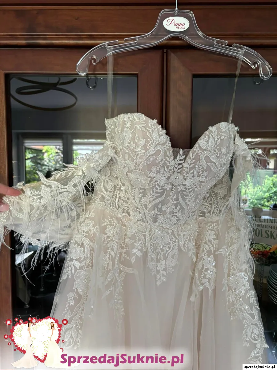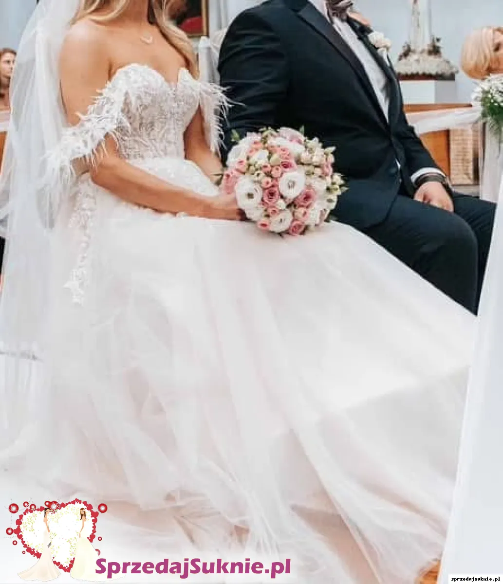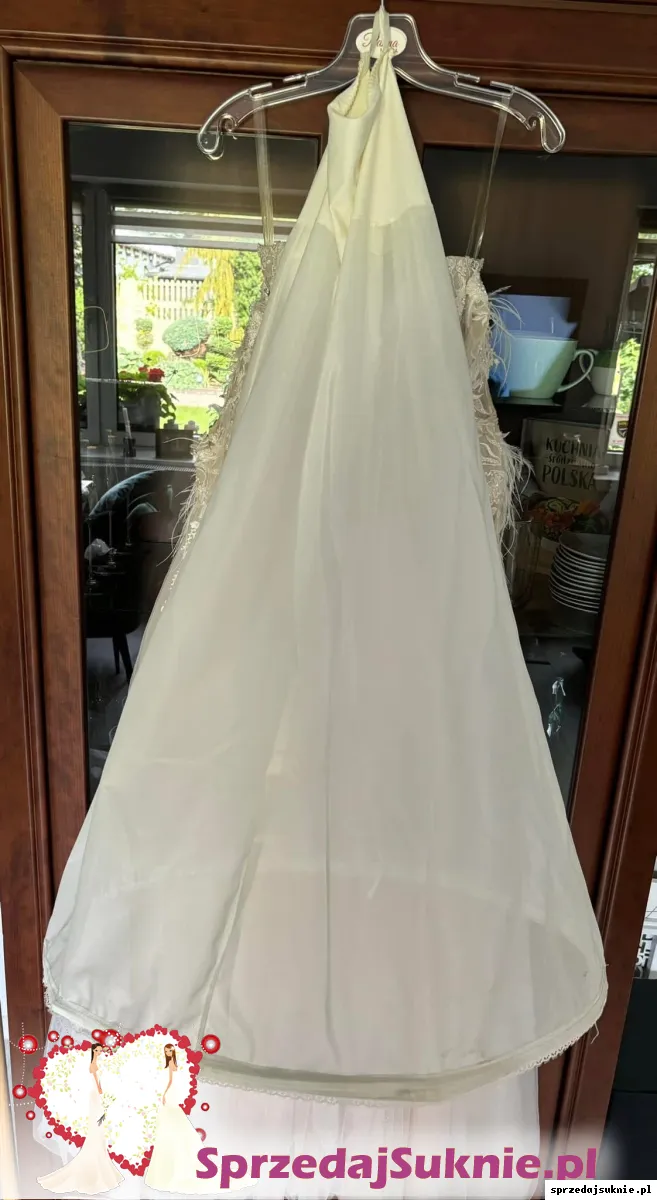 Sprzedam suknię ślubną w kolorze kremowym z odcieniem różu. Rękawki można odpiąć - przy jednym brakuje guzika, rozmiar S, miseczka C, na wzrost 176. Cena 4000 zł do negocjacji ze względu na to, że należy wyprać suknię.