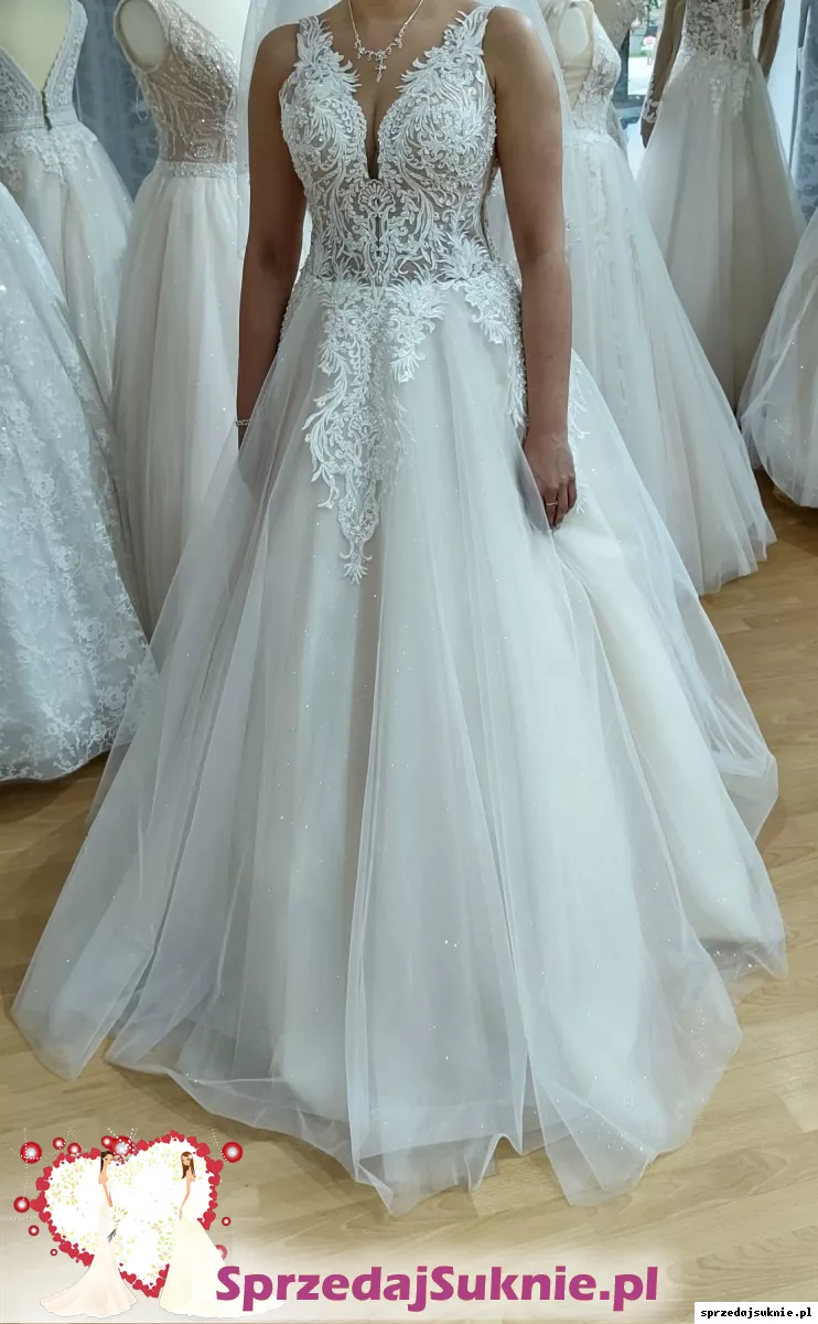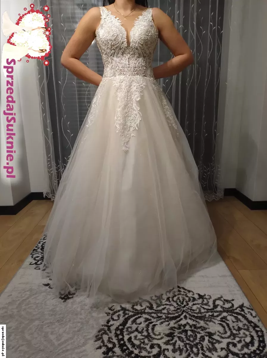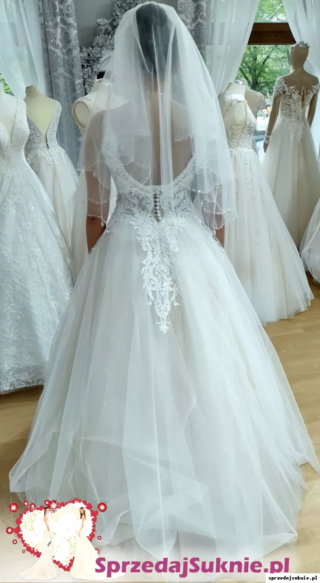 Sprzedam piękną suknię ślubną typ Princessa w rozmiarze 38/40 szyta na wymiar. Suknia jest biała, ale posiada jedną warstwę cielista i jedna z połyskującym brokatem. Bardzo wygodna, nie jest ciężka. Dodatkowo posiadam do sukni koło i bolerko w kolorze białym. Cena sukni z dodatkami 1500,00 zł.