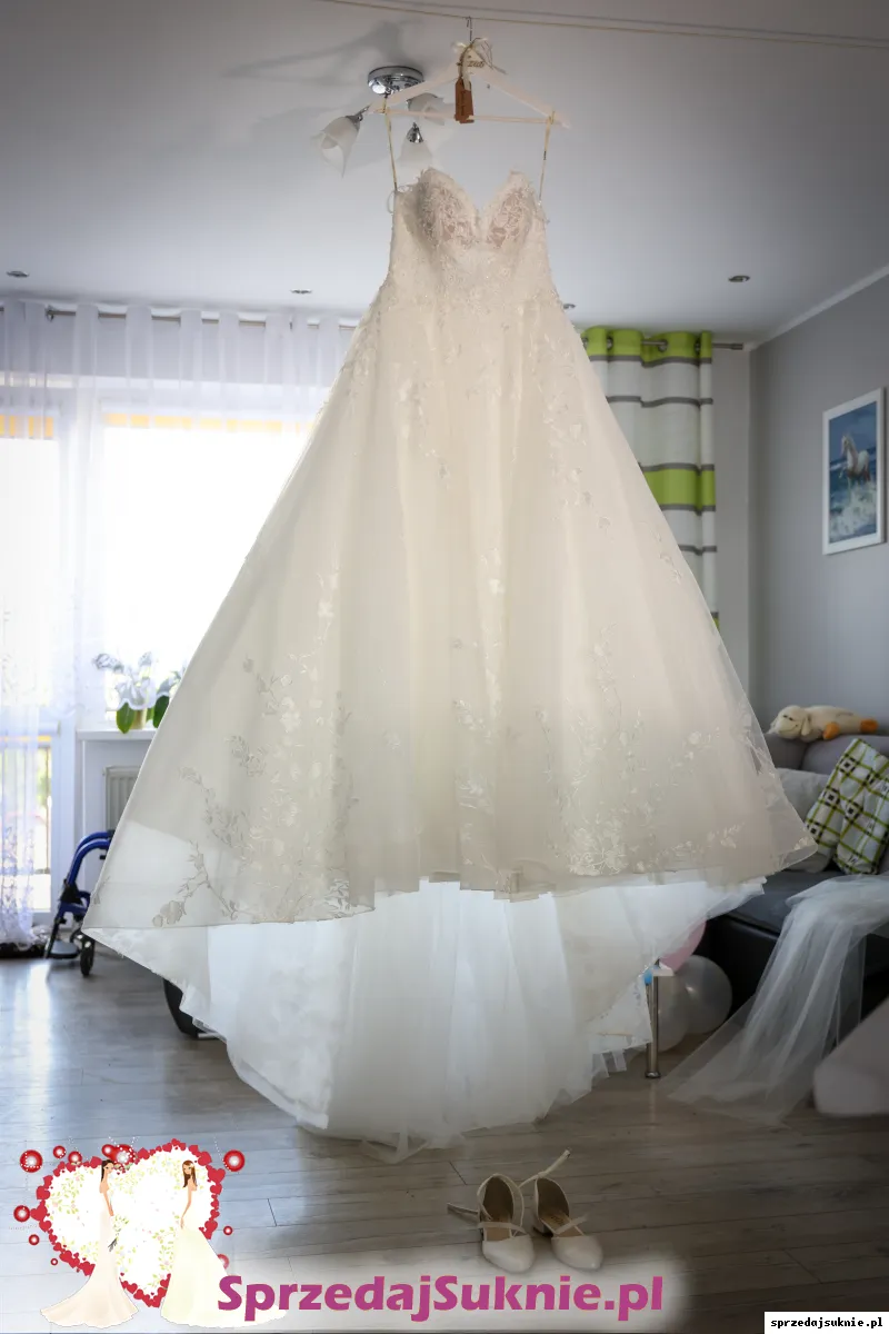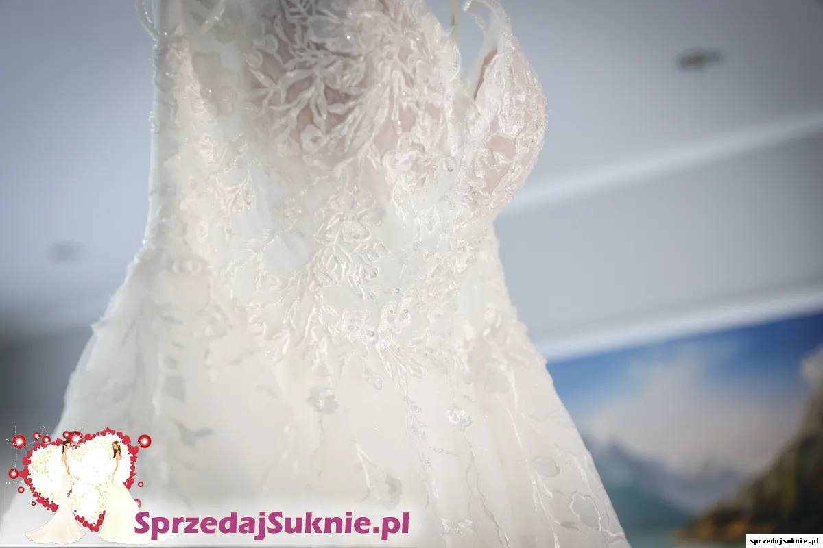 Sprzedam elegancką suknię ślubną w stylu glamour w kolorze ivory zakupioną w salonie La Vie Belle w Bydgoszczy. Suknia w kształcie litery A o rozmiarze 46 uszyta na wzrost 175 + 2 cm obcas. Suknia charakteryzuje się dużym dekoltem na plecach oraz długim podpinanym trenem z elementami koronki. Koronkowy gorset sukni wykończony fiszbinami powoduje wyszczuplenie sylwetki. Gorset jak i ramiączka pokryte koralikami i cekinami. Suknia pięknie mieni się w tańcu jak i w świetle reflektorów. Dół sukni również posiada warstwę tiulu zdobionego w mieniący się brokat. W sukni wszyta halka z kołem. Idealna suknia na ten wyjątkowy dzień!