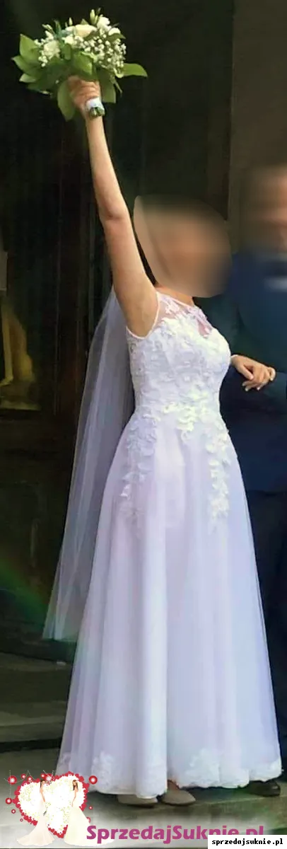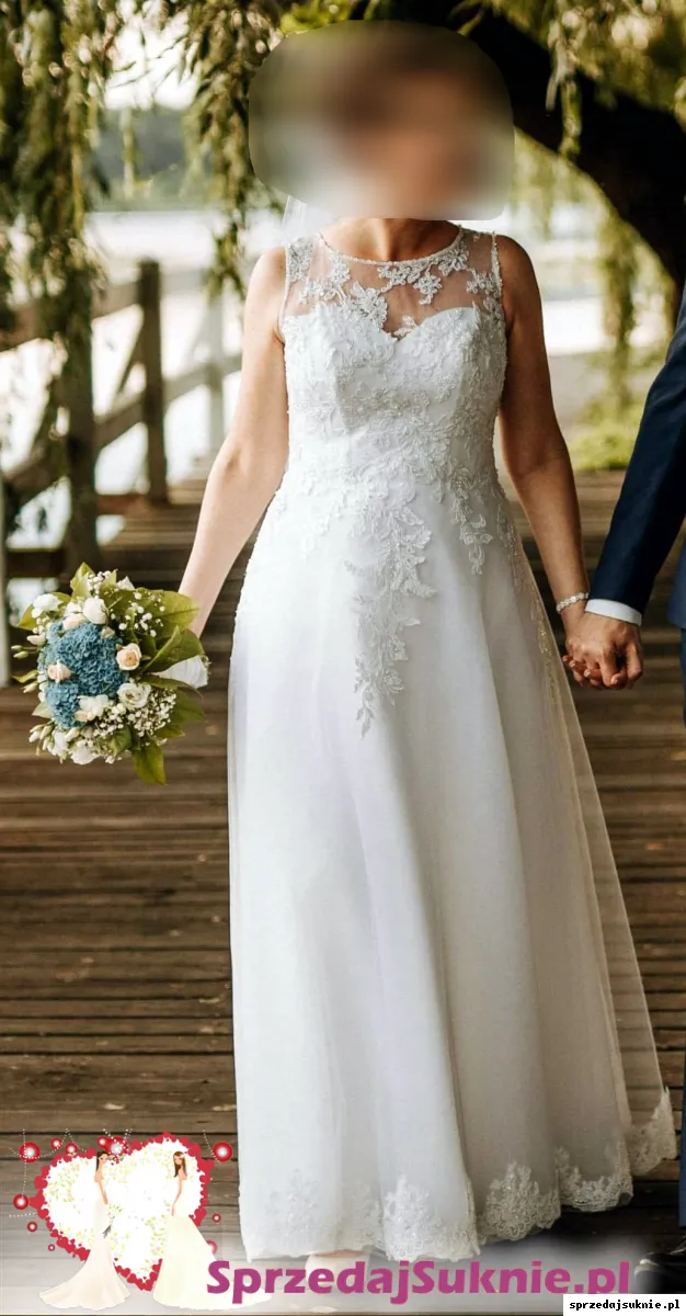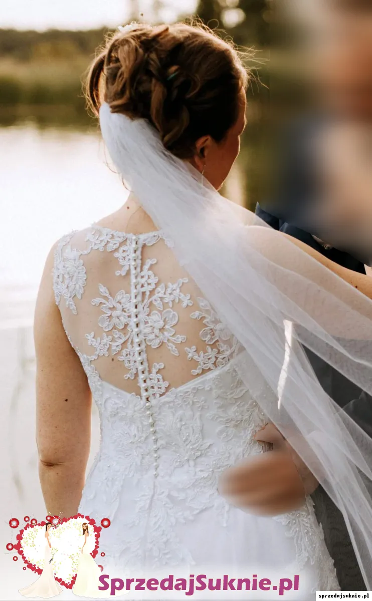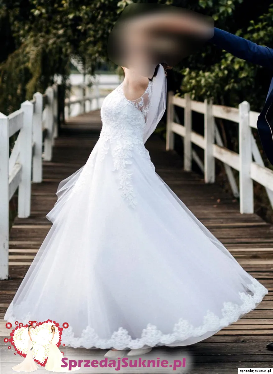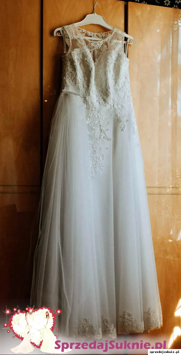 Klasyczna sukienka w rozmiarze 40, o kroju litery A, z dopasowaną, subtelnie zdobioną górą, zapinaną na rząd guziczków - na wzrost 168 plus obcas 6 cm. Spódnica tiulowa, możliwość odprucia szlaku na dole. Wyczyszczona i gotowa dla nowej właścicielki. Lekka i wygodna. Gratis welon - gładki, również klasyczny, sięga nieco za talię.