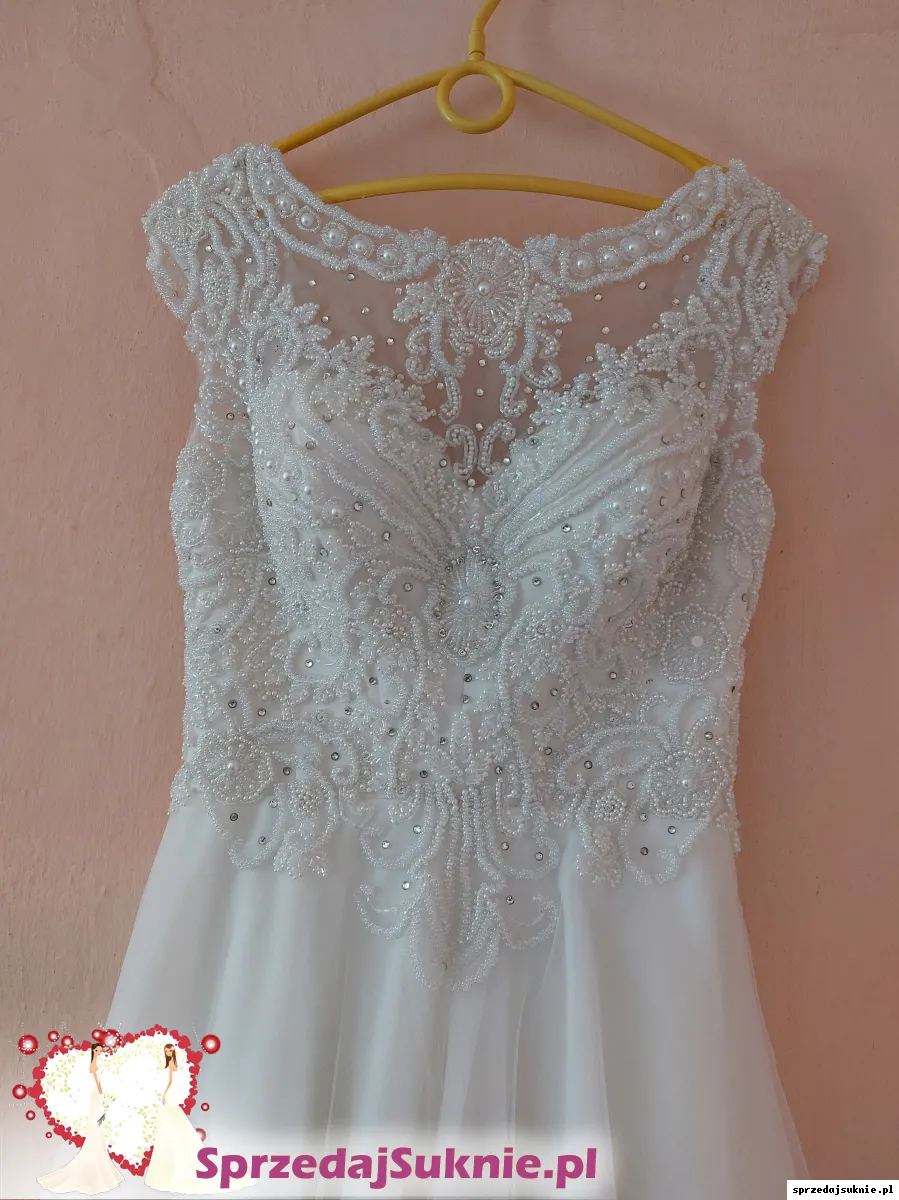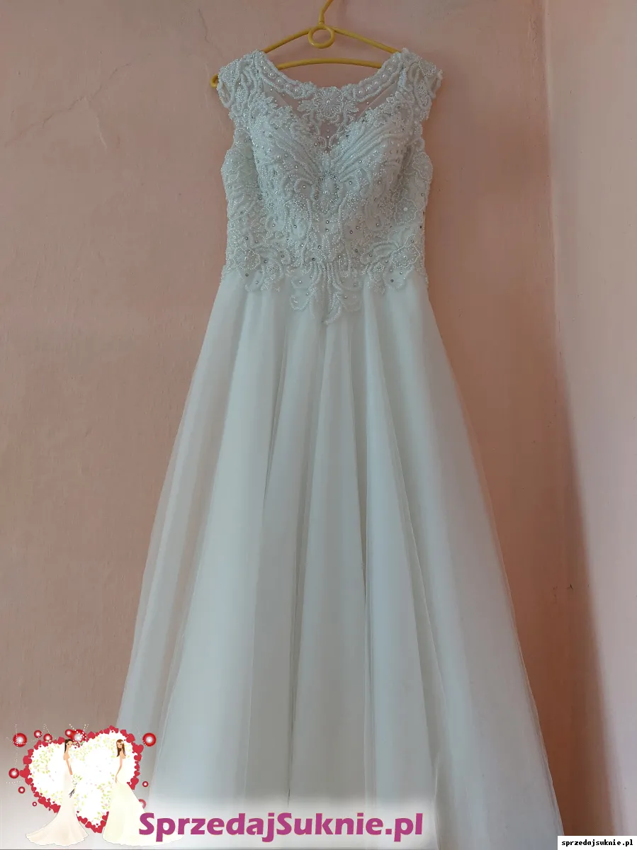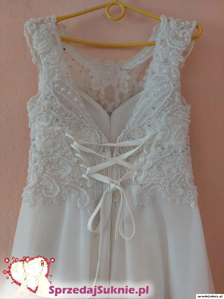 Witam, mam do sprzedania piękną suknię ślubną w fasonie Princessa. Suknia szyta na wzrost 164 cm., pas 75 cm., w biuście 80cm. Suknia jest w kolorze jasnego ecru. Górę sukienki zdobią przepiękne drobne perełki i kryształki, przód dekoltu półokrągły, natomiast uwagę zwraca tył sukienki wycięty w kształt V z przyciąganą w talii wstążką. Dół sukni wykonany jest z kilku warstw tiulu posiada halkę z kołem dzięki czemu suknia ładnie się układa i nie przeszkadza w poruszaniu się. Suknia wyprana w pralni chemicznej. Polecam i zapraszam do kontaktu tel. 660611804 cena 1300 do negocjacji, dokładam welon do ceny.