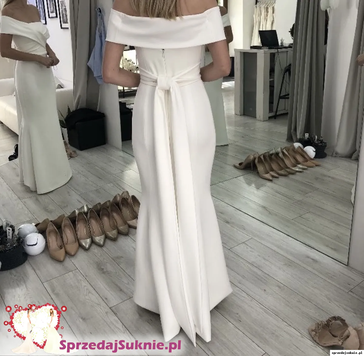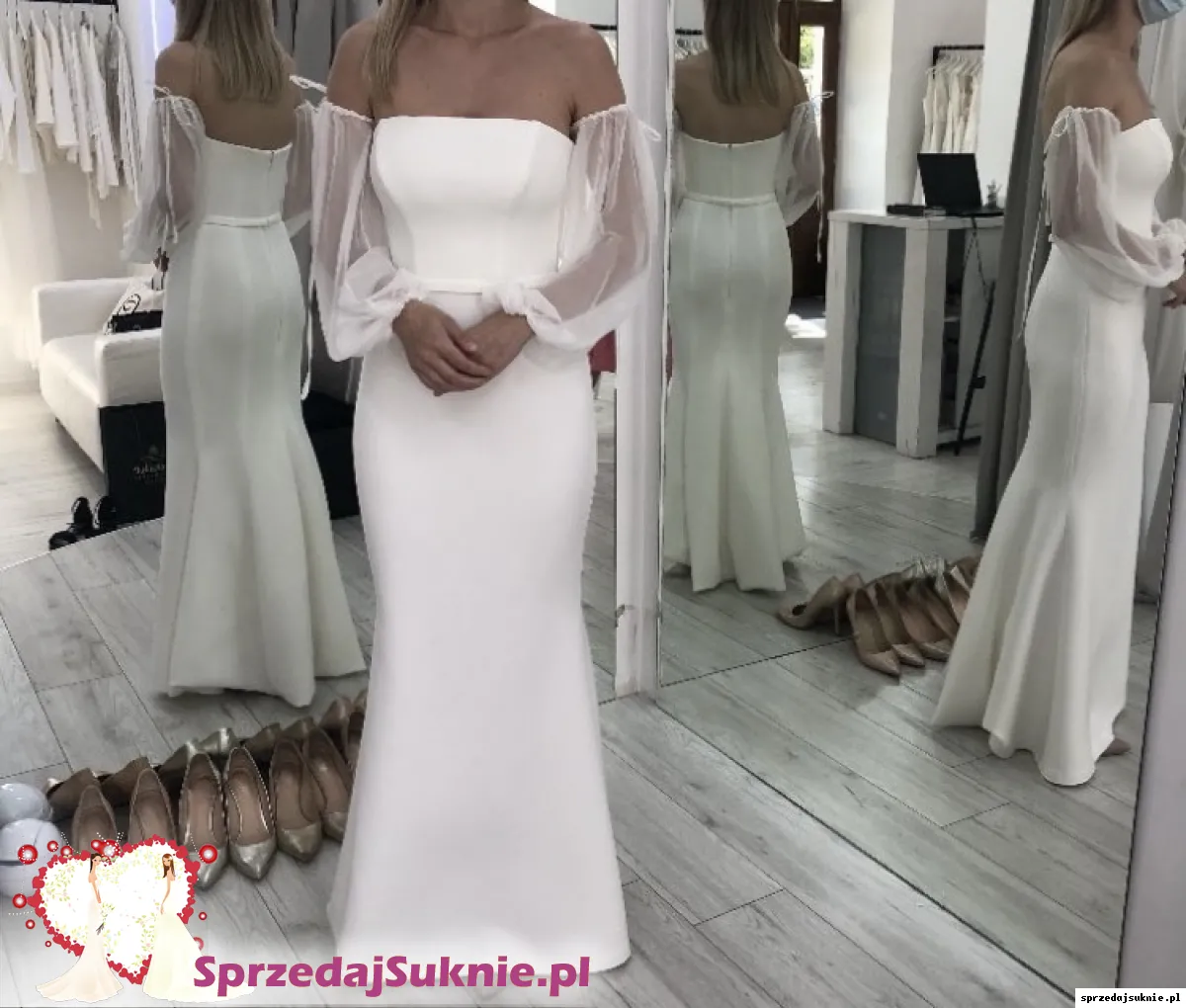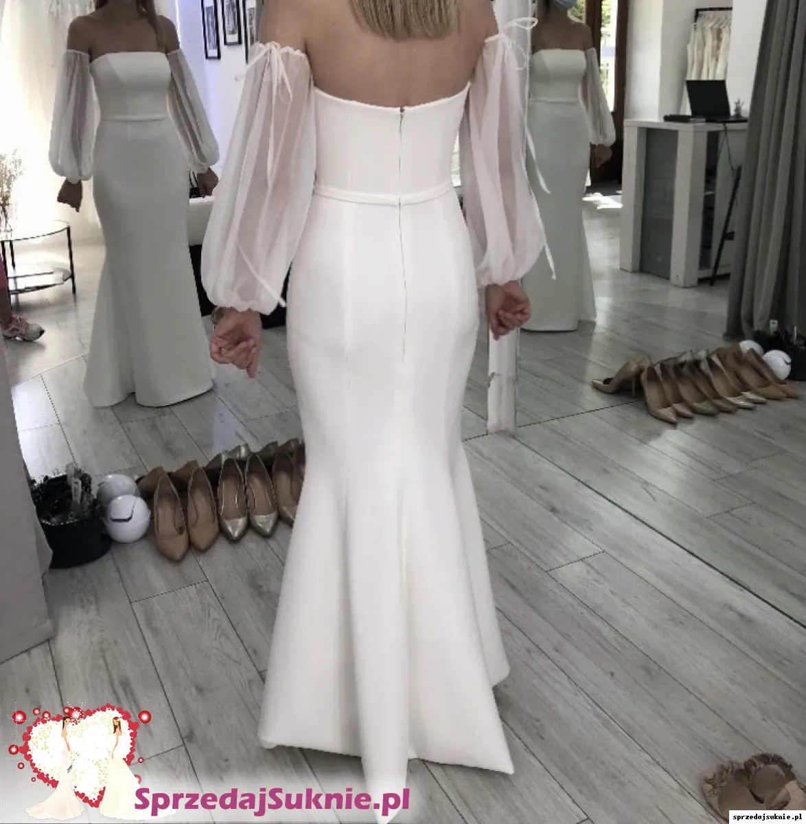 Bazą jest dopasowana sukienka rybka, natomiast w zależności od doboru dodatków: szarfy, rękawków lub ozdobnych ramiączek może wyglądać zupełnie inaczej.