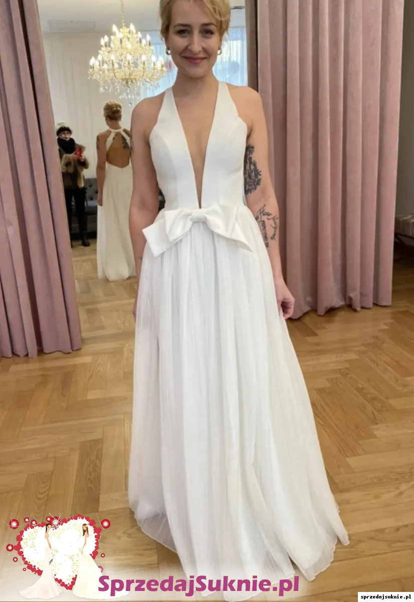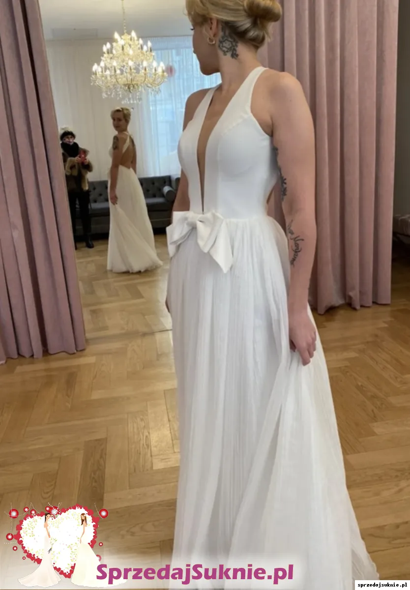 Kupiona w salonie Charlotta Bridal Atelier w 2023 roku (cena 4 000z艂). Dla dziewczyny 170cm wzrostu, na p艂askim obcasie. Na dole sukni niewielkie zabrudzenia do odczyszczenia. Prosty kr贸j dzi臋ki kt贸remu mo偶na zaszale膰 z dodatkami.