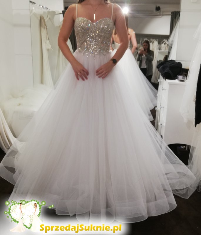 Sprzedam używaną suknię ślubną Justina Aleksandra model88062. Kolor ivory/nudę. Suknia zapinana na suwak. Ma tren z możliwością podpięcia. Rozmiar 8.