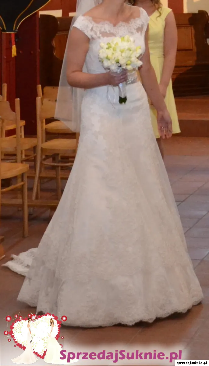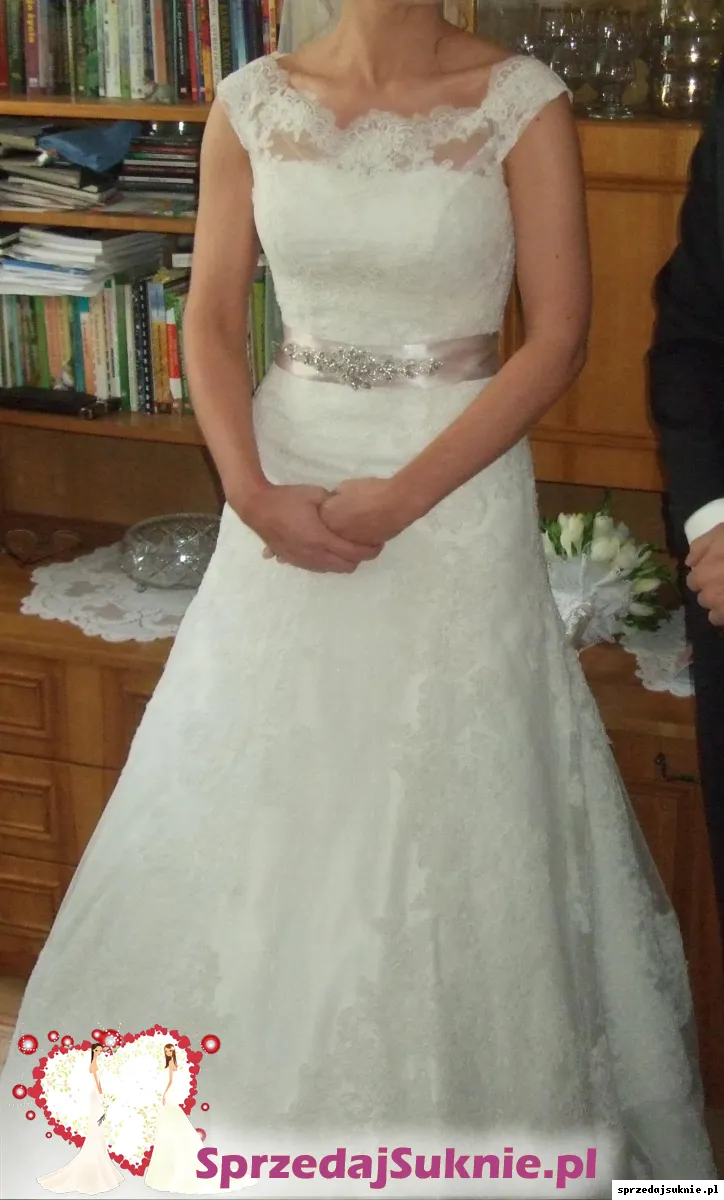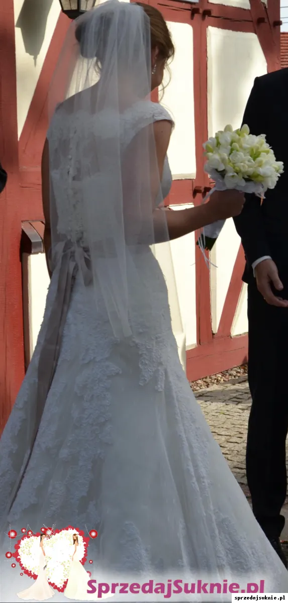 Przepiękna suknia, bardzo wygodna. cała wykonana z koronki, z gorsetem, zapinana z tyłu na guziczki, suknia posiada tren, który można podpiąć na guziczek. Suknia ma też halkę na kole, która jest niezależna i nie trzeba jej zakładać. Ma dodatkowo wykonane z prześlicznej delikatnej koronki bolerko, również zapinane na guziczki z tyłu. Bolero jest z dekoltem w łódkę, przez co pięknie podkreśla ramiona. Kolor to złamana biel. Dodatkowo jest pas w kolorze liliowym, którego oczywiście nie trzeba zakładać. Dodaję także welon. Mogę wysłać więcej zdjęć. Suknia wisi na wieszaku, jest zabezpieczona w odpowiednim futerale. Wymaga oczywiście odświeżenia.