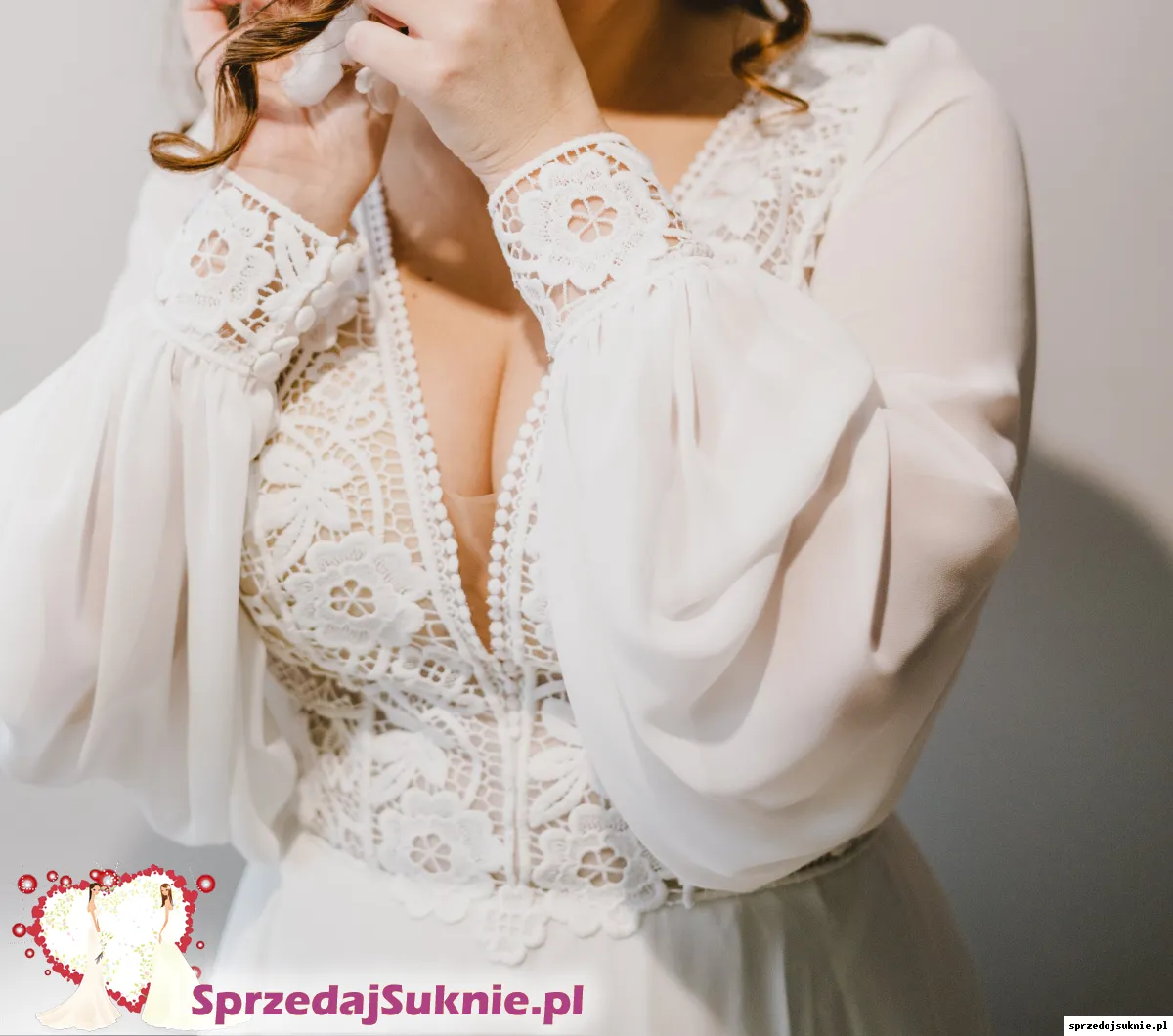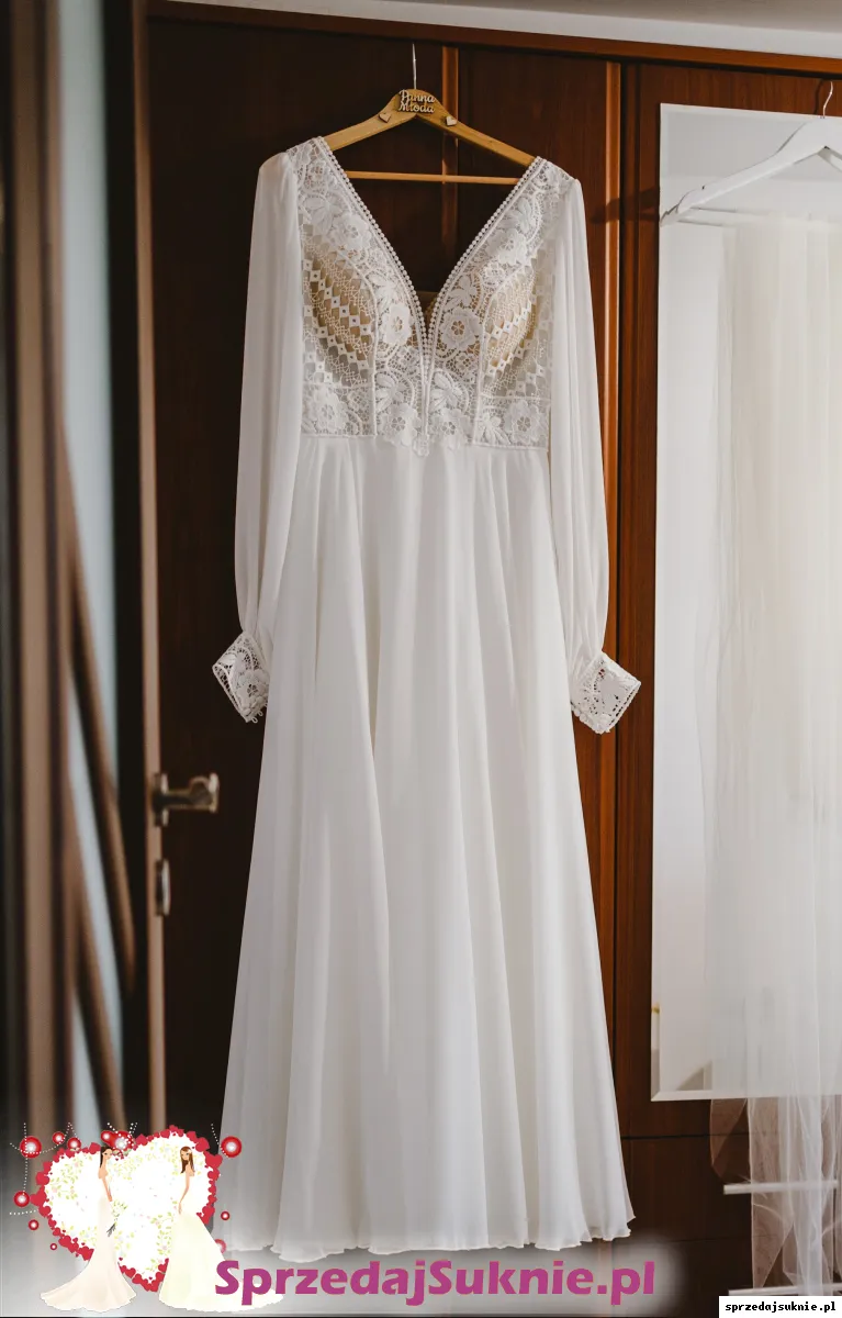 Sprzedam suknię ślubną w stylu Boho z długimi, zwiewnymi rękawami z muślinu. Sukienka i rękawy pięknie układają się przy każdym ruchu, są bardzo wygodne i w żaden sposób nie ograniczają ruchów.
