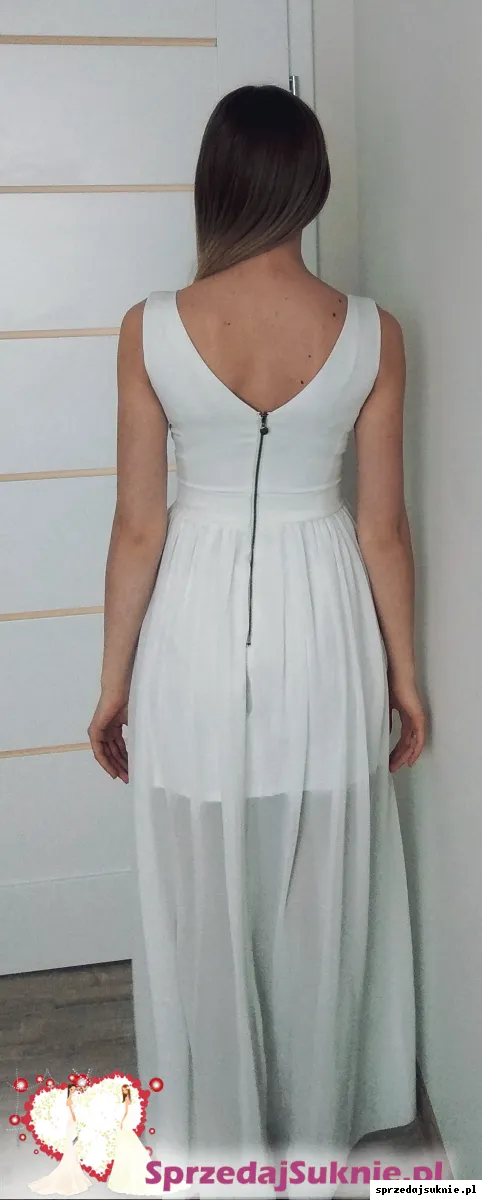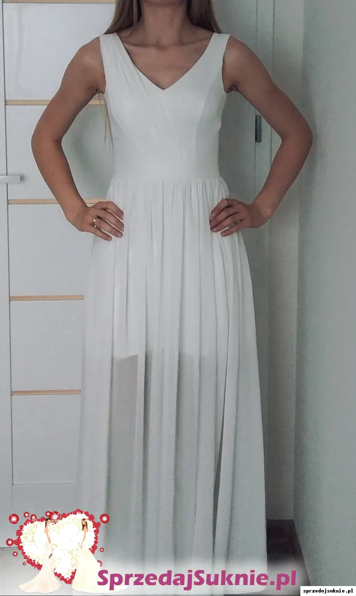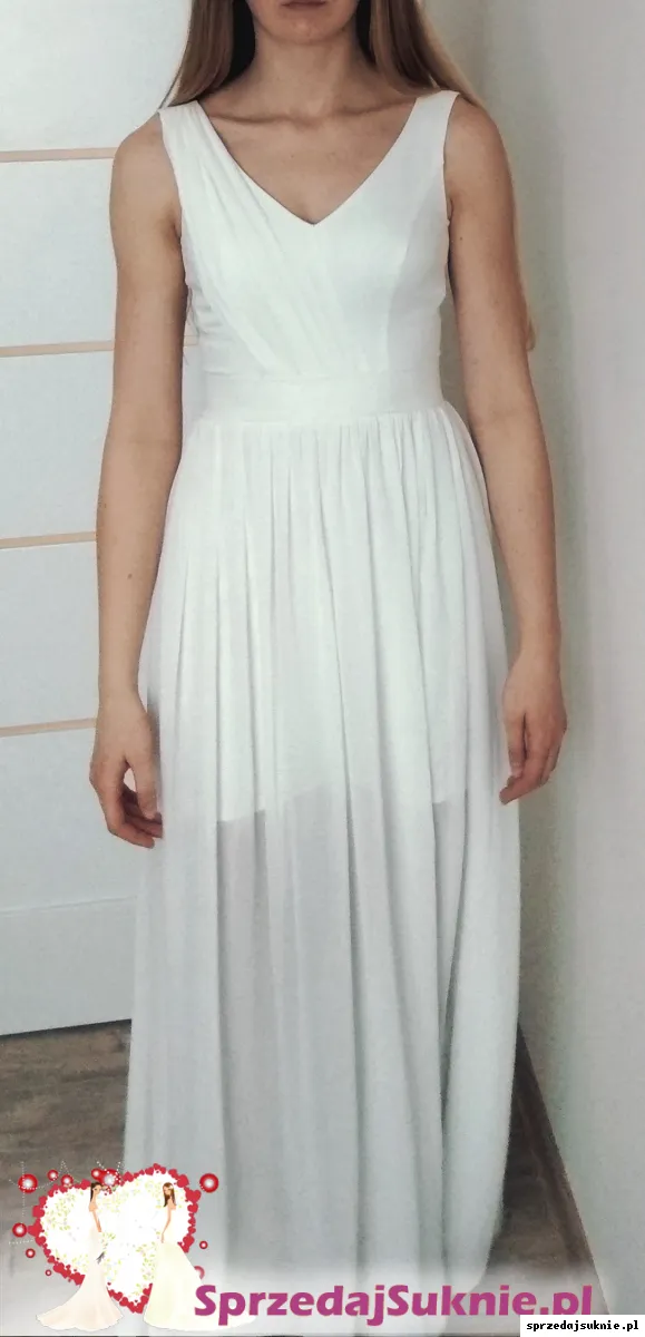 Śliczna maxi sukienka w kolorze śmietankowej bieli. Rozmiar 36, pasuję również na małe 38. Idealna na poprawiny, czy też ślub cywilny. Zwiewny dół. Na żywo prezentuję się znaczenie lepiej :) zainteresowanym podeślę więcej zdjęć :) istnieje możliwość wysyłki.
