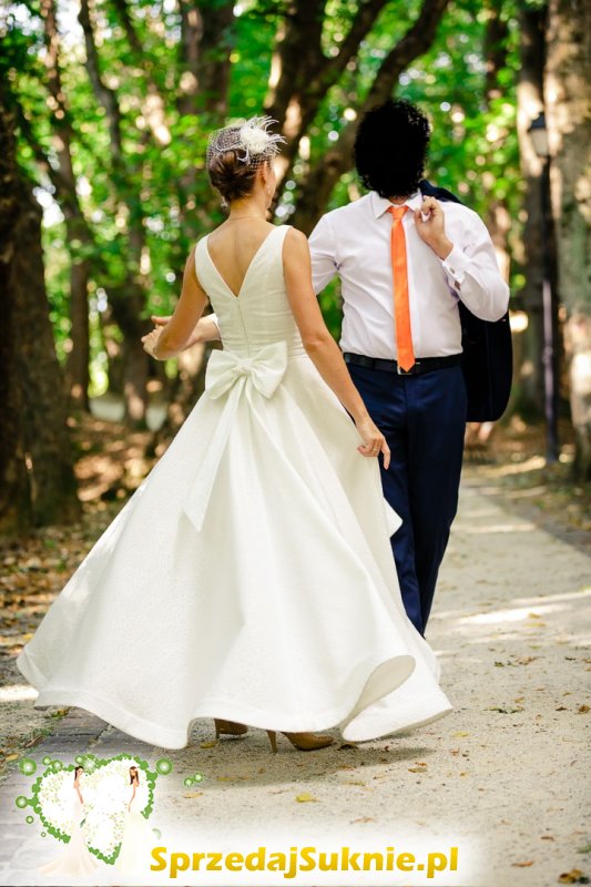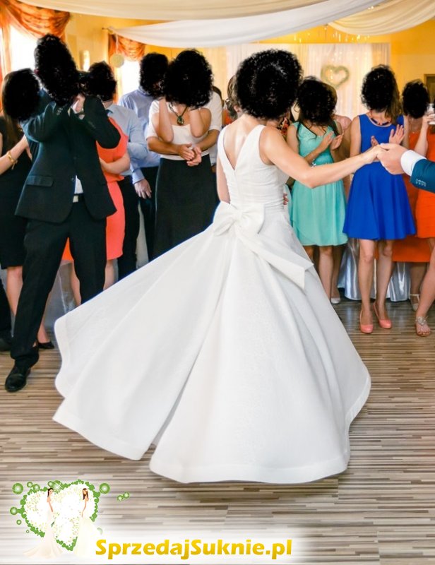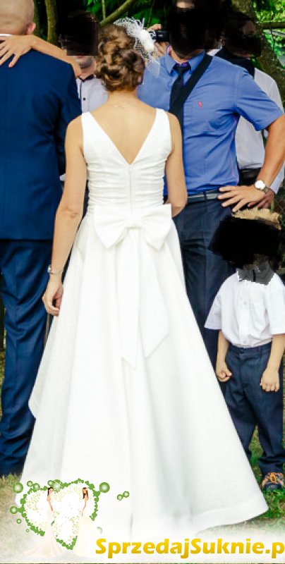 Suknia jest asymetryczna - krótsza z przodu i dłuższa z tyłu, w kolorze śmietankowej bieli. Dopasowana w talii, podkreśla biust oraz posiada wycięcie na plecach. Materiał jest dwustronny z wytłaczanym wzorem. Z tyłu odpinana kokarda oraz zapięcie na zamek błyskawiczny.