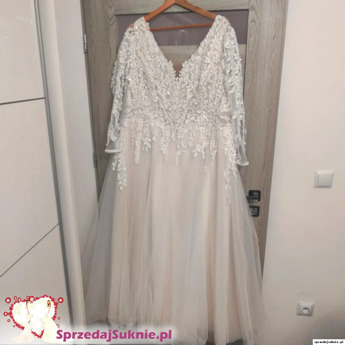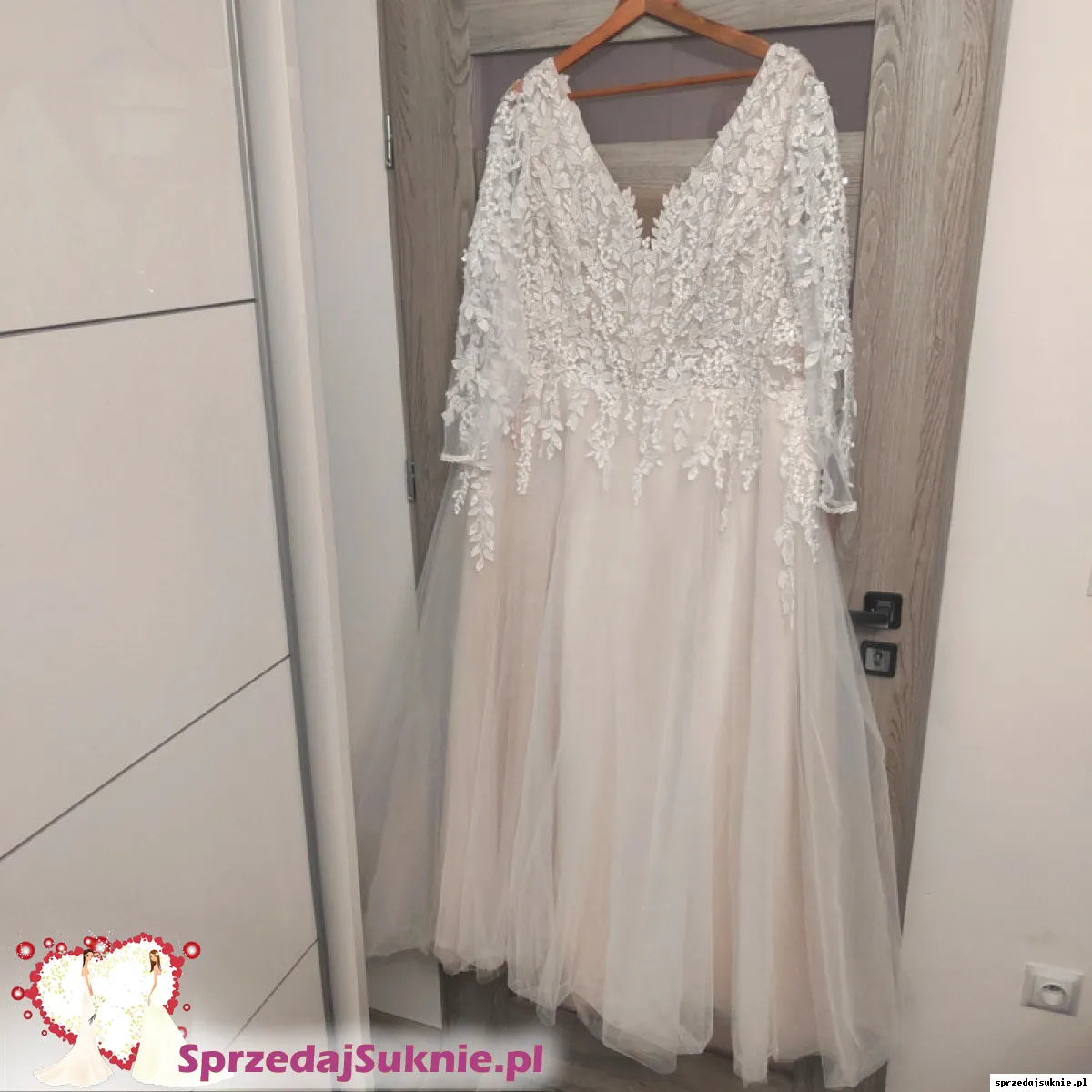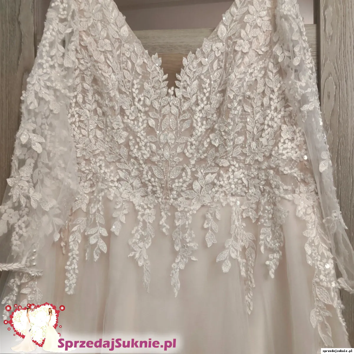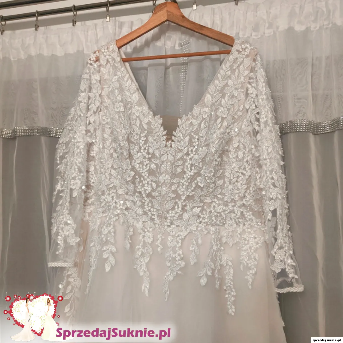 Sprzedam suknię ślubną , wg mojego projektu Z rękawkiem i pięknymi naszyciami . Z tyłu zapinana na zamek i guziczki Po weselu oddana do pralni, ubrana na godzinę do sesji w plenerze Wymaga odświeżenia