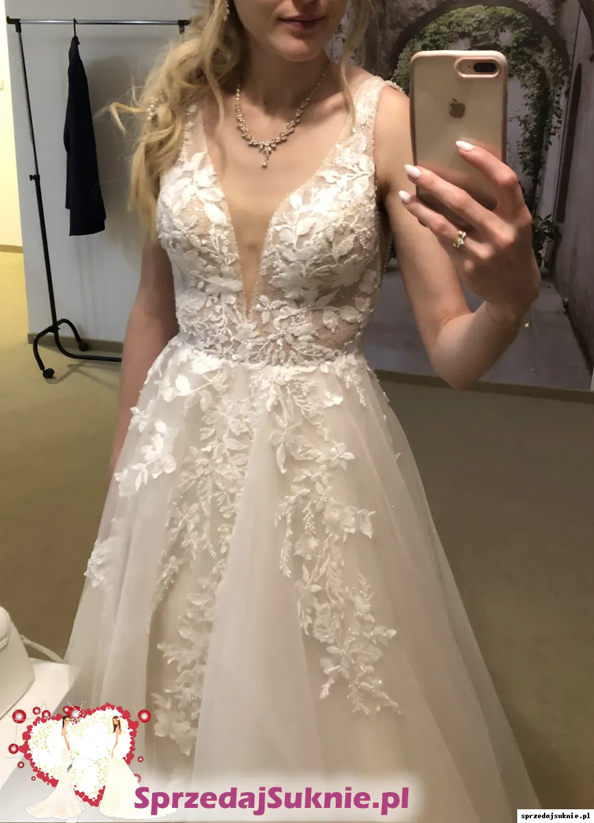 Sprzedam suknię kupioną w salonie ślubnym Victoria. Ma odcień bieli delikatnie wpadającej w ecru, dzięki czemu jasna karnacja wygląda lepiej. Była zwężana pod moje wymiary, więc rozmiar to 34. Ma wszyte poduszki dla lepszego wyeksponowania i ułożenia biustu. Pięknie zdobiona, bardzo efektowna, zapięcie z tyłu na zamek. Dodatkowo można dobrać piękny delikatny welon. Ja mam 173 cm, miałam obcas 7 cm. Przyniosła mi dużo szczęścia, liczę, że trafi w dobre ręce : ) Możliwość przymierzenia w Toruniu.