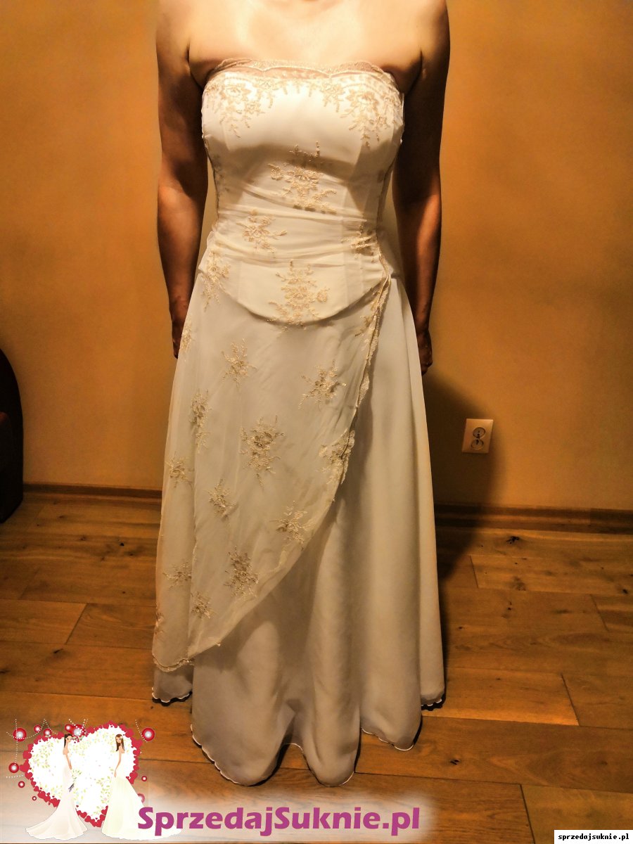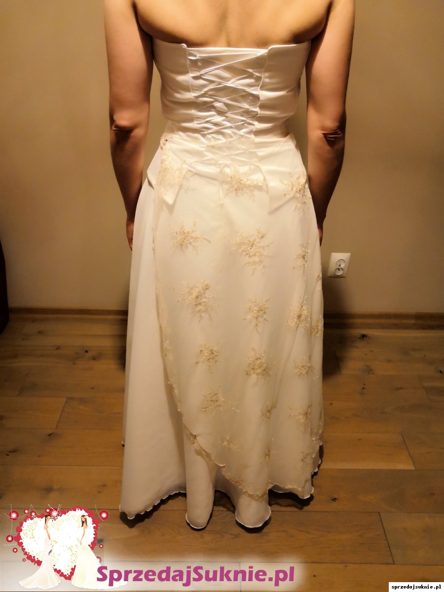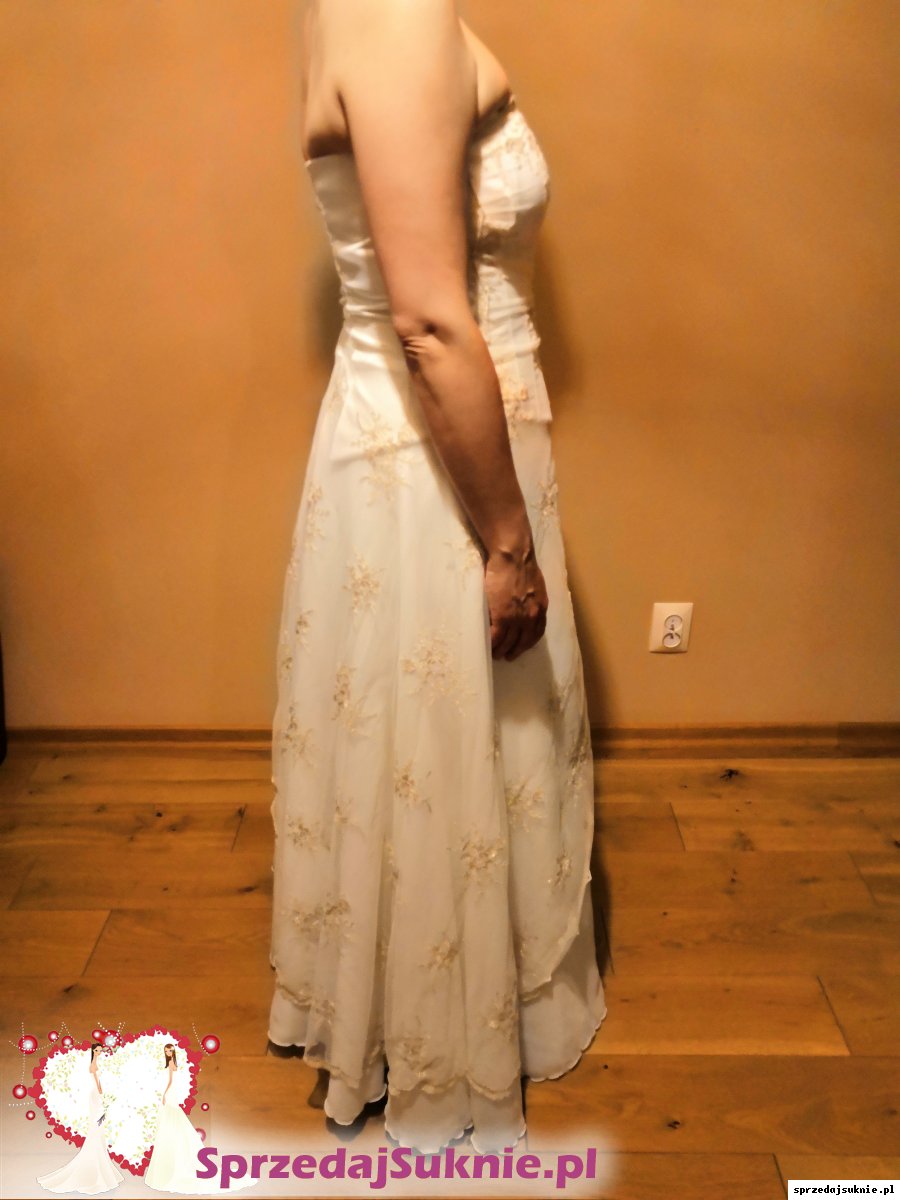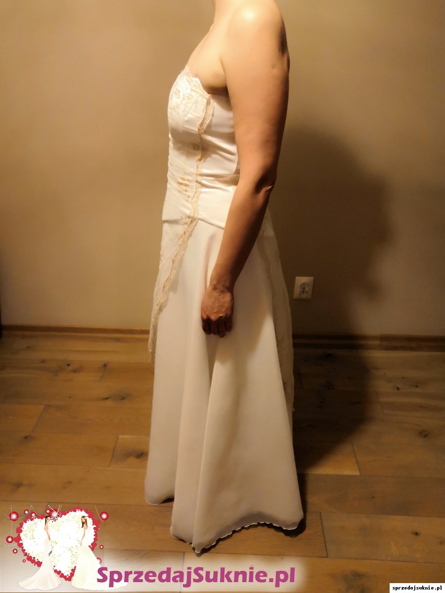 Suknia składa się z halki, lejącej i delikatnej spódnicy (bez trenu) oraz sznurowanego gorsetu z satyny ze stylową koronką opadającą na spódnicę. Koronka z haftowanymi ciemnozłotą nitką motywamy kwiatowymi. Bardzo elegancka i ponadczasowa.