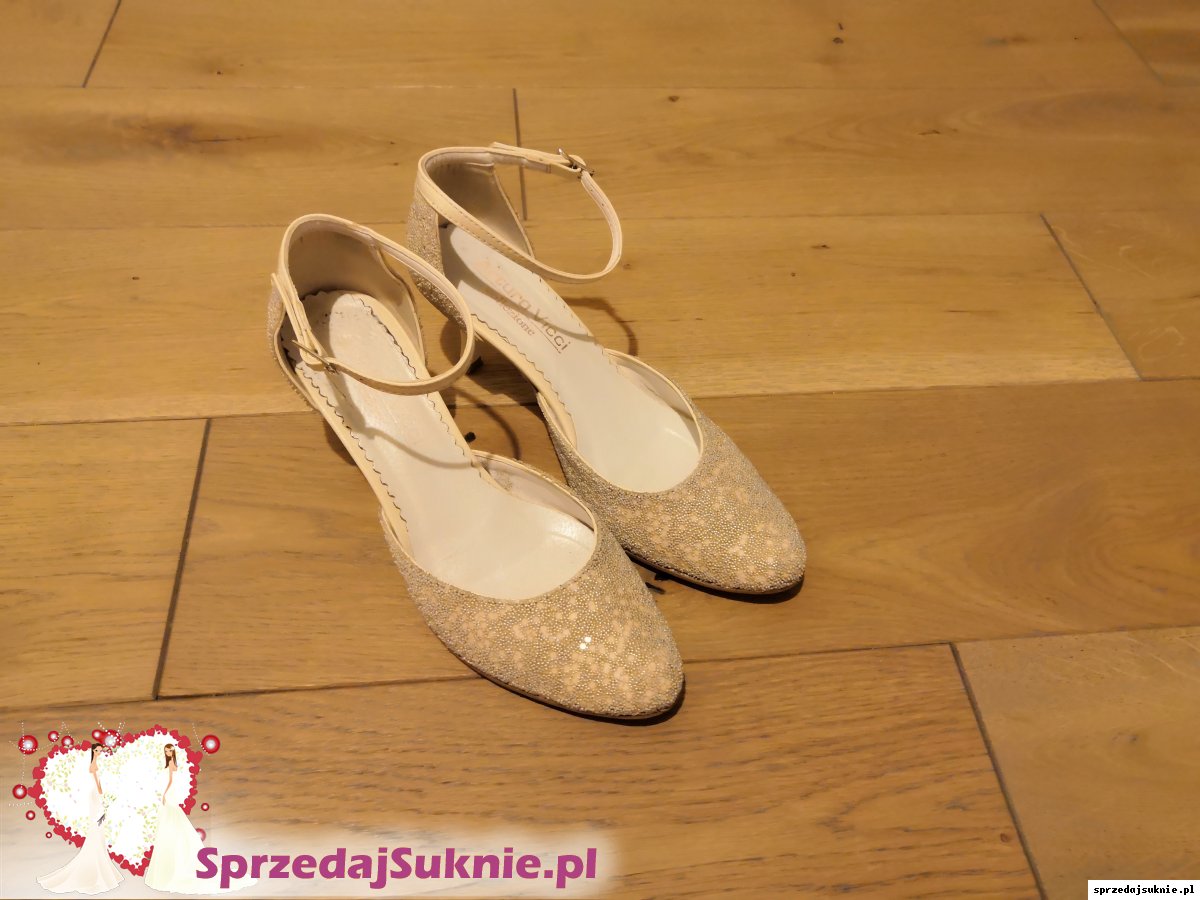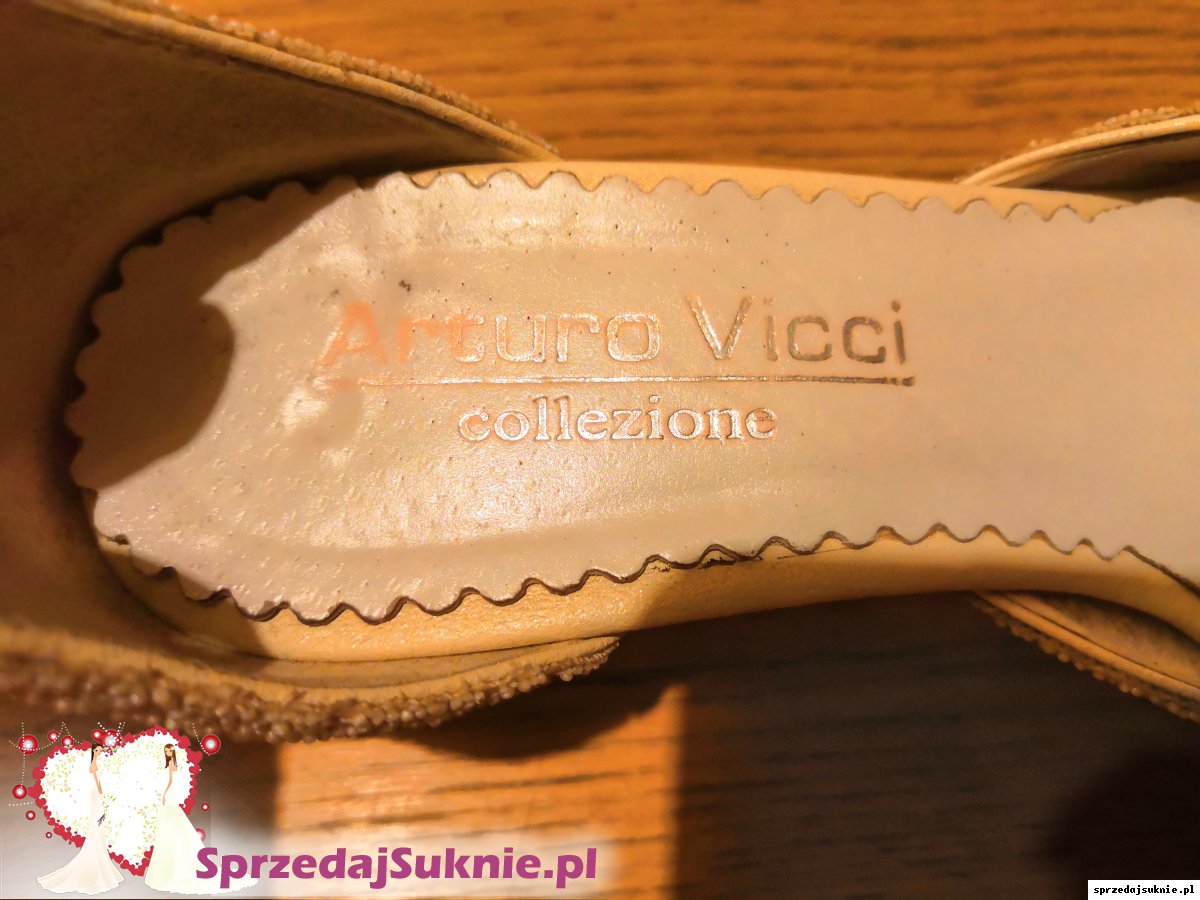 Możliwość dokupiena do sukni butów marki Arturo Vicci pokazanych na zdjęciach, rozmiar 36, obcas ok 5 cm. Zapinane w kostce, ozdobione wzorem z lekko połyskujacymi drobniutkimi perełkami. Buty wyczyszczone. Używane tylko raz.