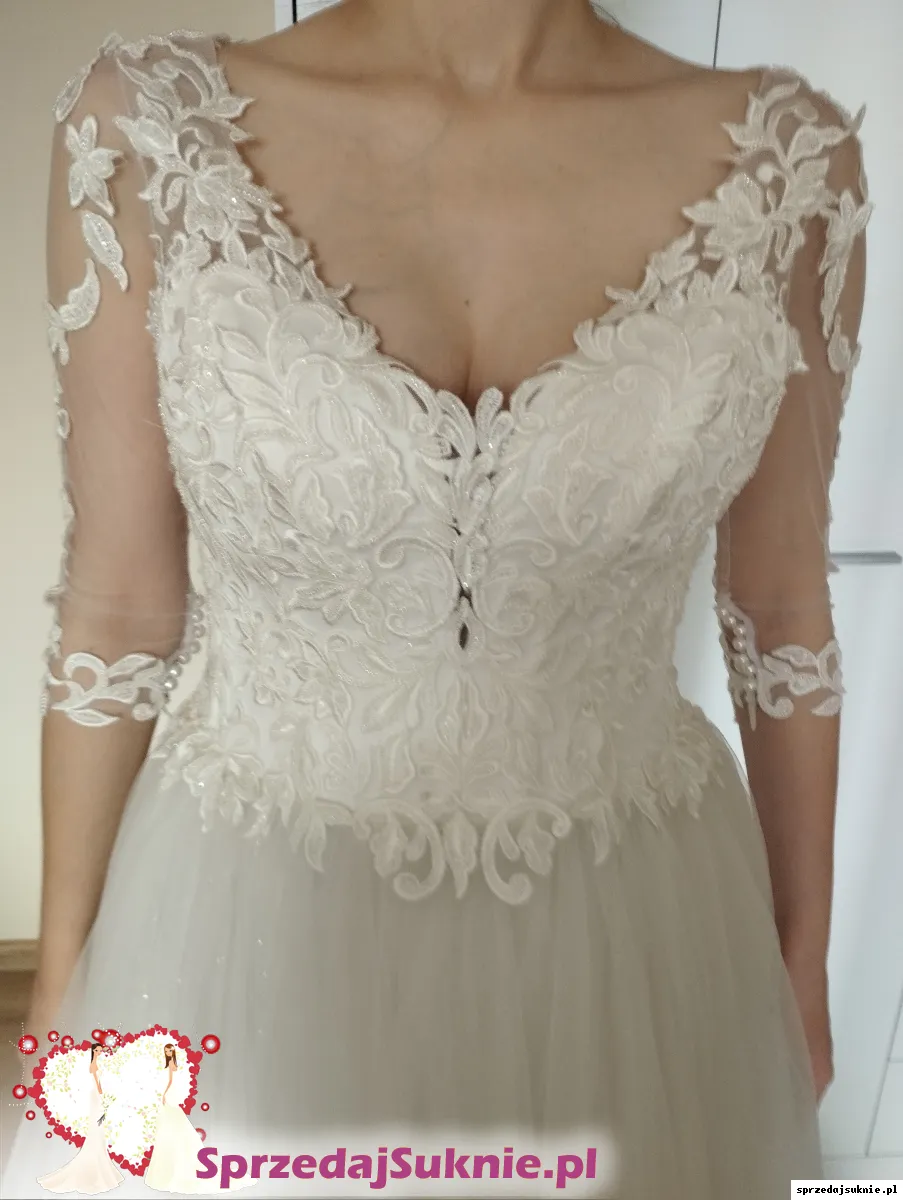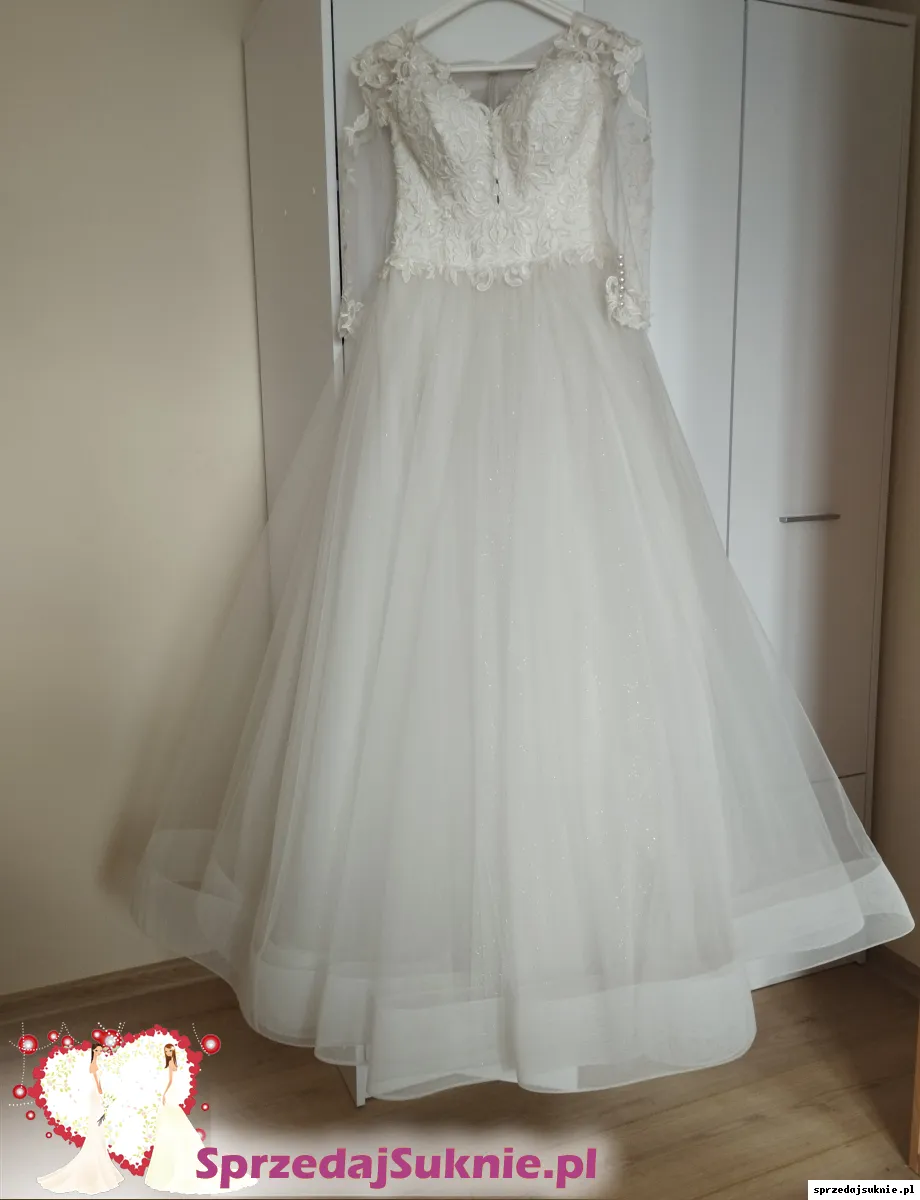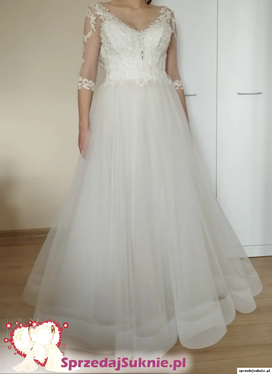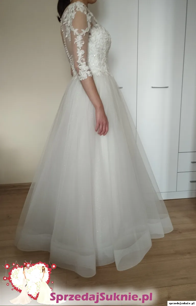 Sprzedam nową suknie ślubną w kolorze białym. Ozdobiona piękną koronką, delikatnym brokatem pod jedną warstwą spódnicy, perły w formie guziczków z tyłu zapięcia sukni oraz przy rękawach . Biust pięknie się utrzymuje ( push up lecz można śmiało ściągnąć, tak samo jak jedną warstwę spódnicy :) ) Suknia prezentuje się pięknie i w dodatku jest wygodna oraz lekka. Idealnie pasuje do welonu , diademu czy też kwiatków wplątanych we włosach. Suknia rozmiaru 38/40 , tutaj dokładne wymiary podane: