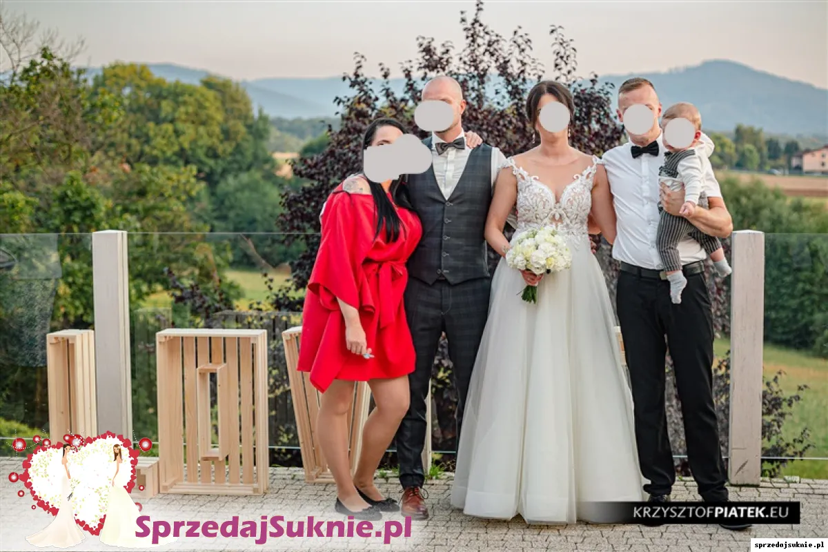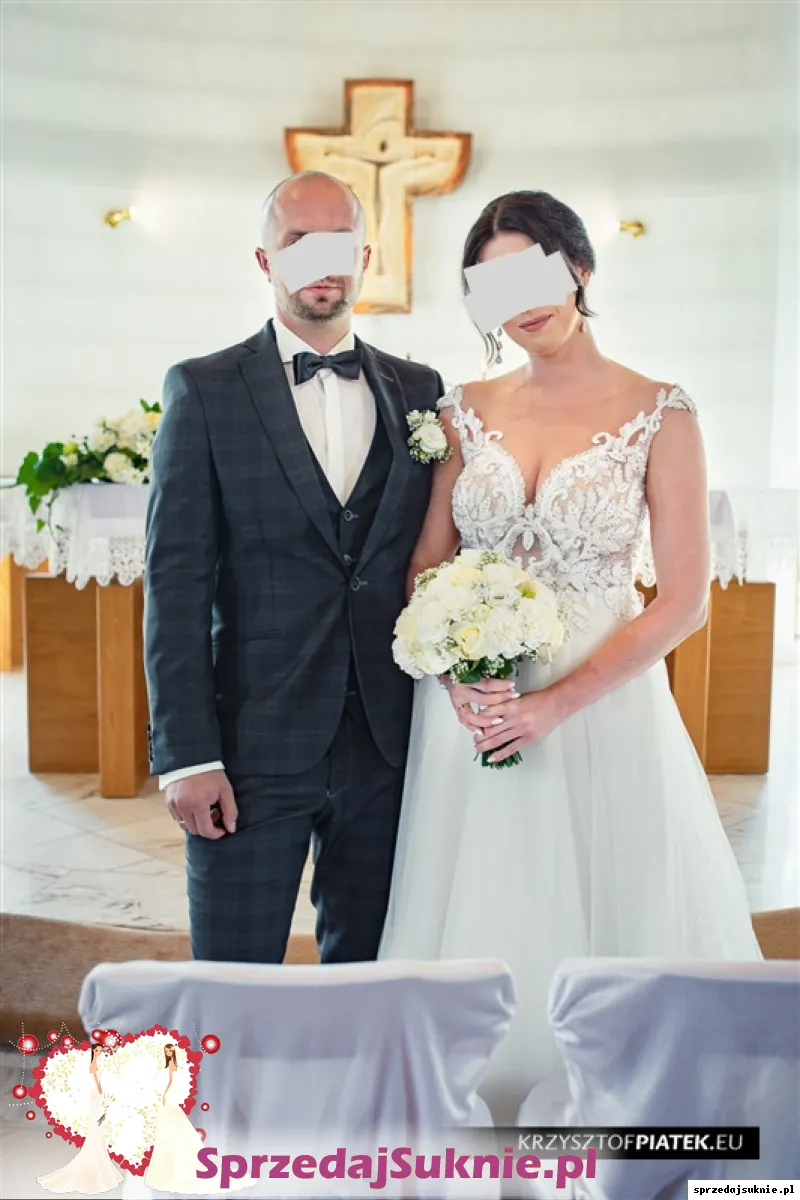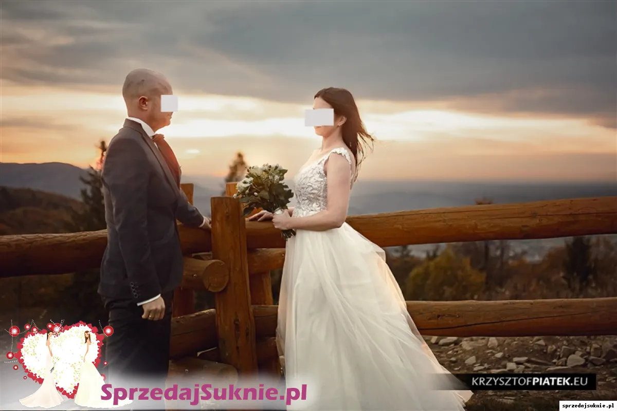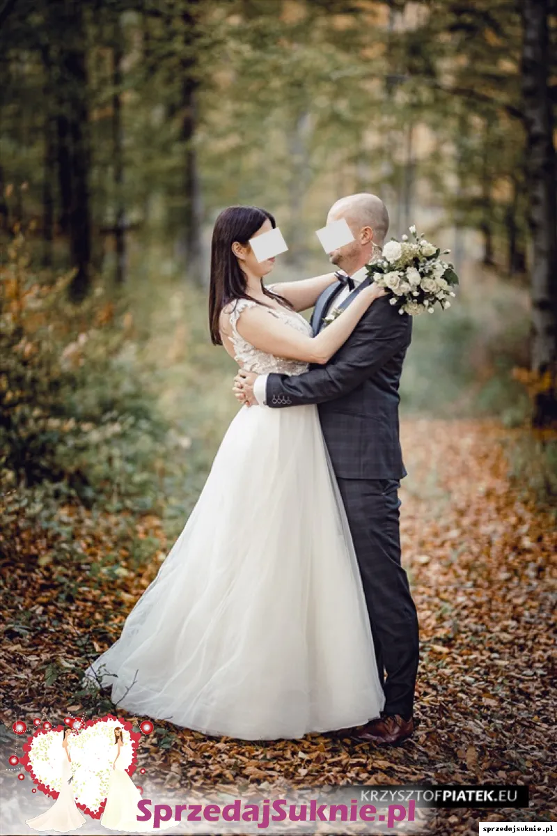 Sprzedam suknię z kolekcji Vanilla Sposa 1967 zakupioną w salonie ślubnym i założoną raz. Dół sukni składa się z kilku warstw tiulu (jeden pięknie mieniący się brokatem) oraz podszewki w kolorze ecru. Góra sukni to piękne wykonanie cekinowe na siatce ze "spadającymi ramionami", natomiast tył zapinany na guziczki. Suknia jest bardzo wygodna, nie krępuje ruchów. Wyprana w pralni chemicznej.